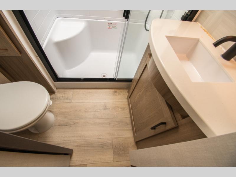 The bathroom is spacious and functional, featuring a shower with a seat, linen storage, and ample counter space for everyday use. In the main living area, the hide-a-bed sofa slide offers comfortable overnight space for guests, with the option to swap in theater seating for a more relaxed lounge setup.