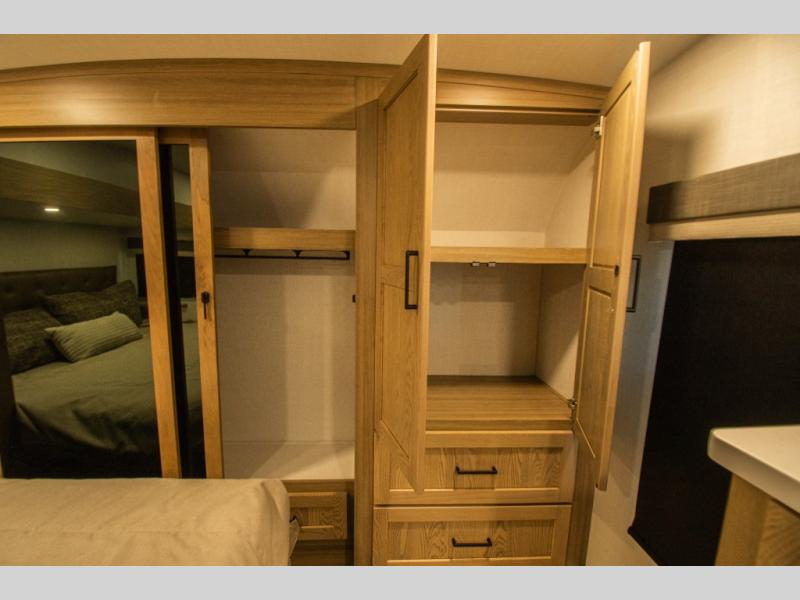The Rockwood Signature R281RK is designed for couples who want room to breathe, with the flexibility to welcome guests when needed. A queen bed slide opens up the front bedroom, creating extra floor space and easy access to the wardrobe and dresser, with a window that keeps the space bright and connected to the outdoors.