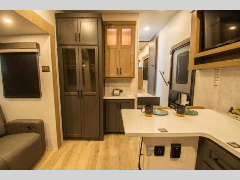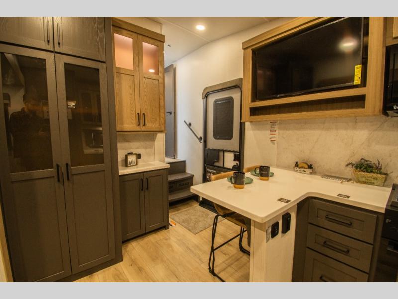 The rear kitchen features a U-shaped counter with generous workspace, a dedicated pantry, and a breakfast bar with stools—ideal for meals, morning coffee, or planning the day. Outside, pass-through storage keeps chairs, gear, and essentials easily accessible.