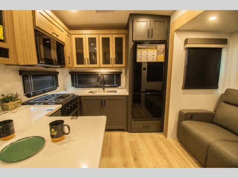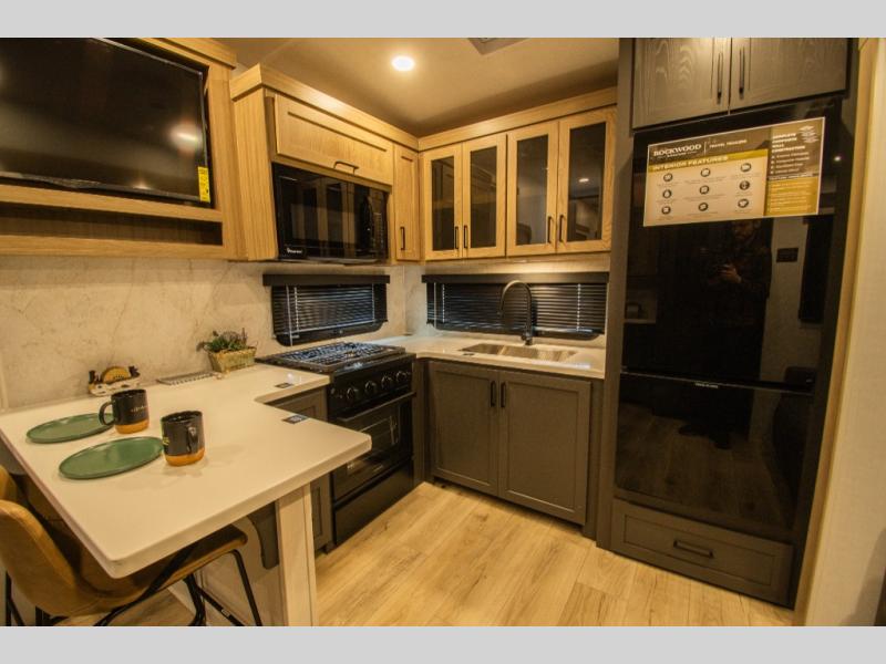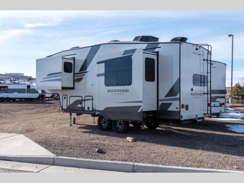 Built with a fully laminated walkable roof, six-sided aluminum frame, and painted fiberglass front cap, the Rockwood Signature is made for long-term durability. Comfort-focused features like a 200W solar panel, soft-close drawers, roller shades, and a residential-style range round out a fifth wheel that balances space, comfort, and everyday usability—well suited for extended stays and regional travel around Northern Colorado and the Front Range.