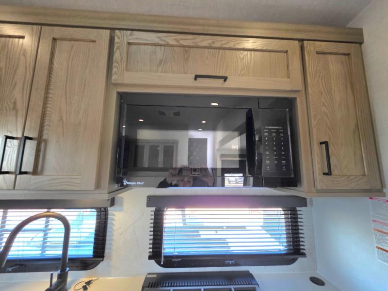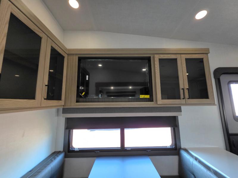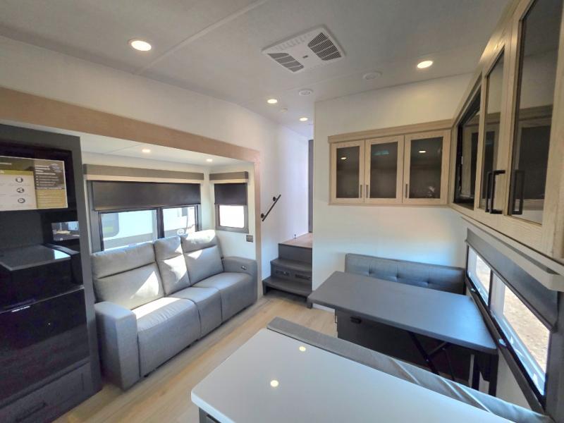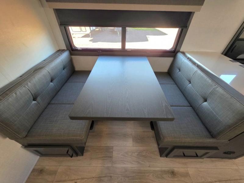 This unit with a theater seat slide will provide added space and comfort! Opposite, you will find a 44" booth dinette for dining indoors, plus overhead storage for your things. The chef of your group will love the rear kitchen with ample counter space plus a pantry and refrigerator for food storage. On the outside, you'll find a large pass-through exterior compartment to bring along camping chairs, along with additional storage space, a 20' awning, and Solid Step entry steps!