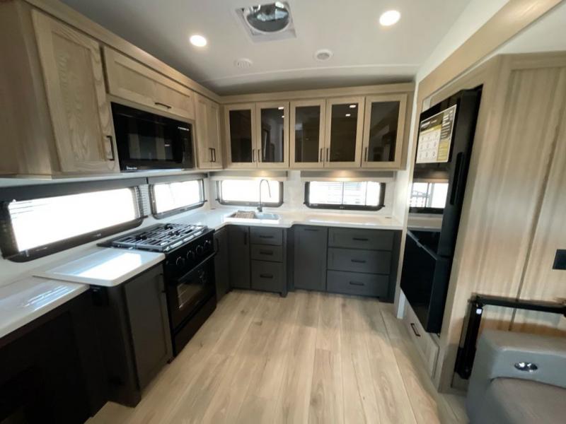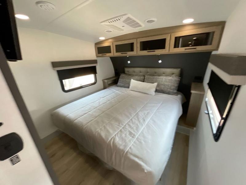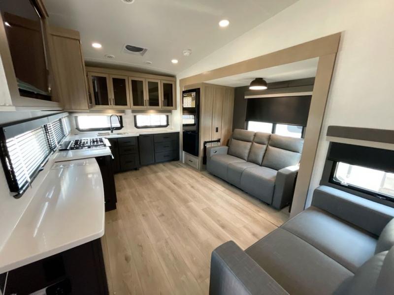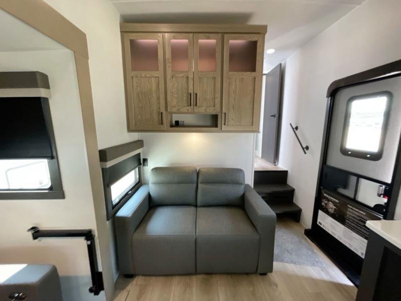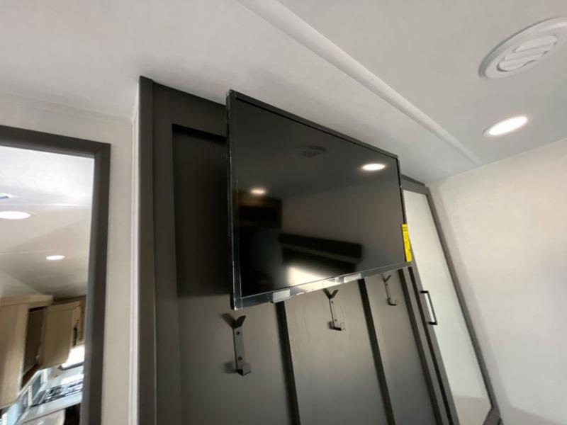 Why not have enough space for all your RVing friends to visit when you camp? This RV offers the perfect living and kitchen area with a large slide giving everyone more floor space, plus there is a king U-shaped dinette and a hide-a-bed sofa to sit on, a fireplace to enjoy and a Smart TV to watch a game or movie together. The cook will love the rear kitchen with extra counter space along a side wall to leave all the snacks and treats for everyone. You might even take everyone outside to enjoy the 21' power awning that offers an outdoor living area with some protection and LED lighting; just grab your camping chairs from the pass-through storage. At night, you can retire to the front bedroom with a queen bed, a spacious wardrobe, plus a TV option if you enjoy movies in bed!