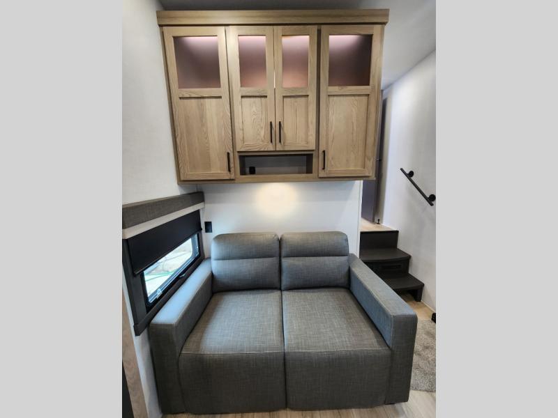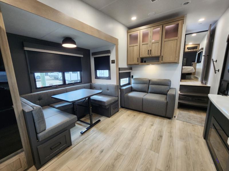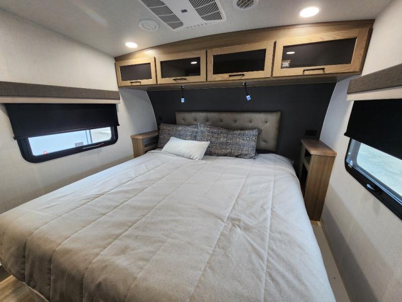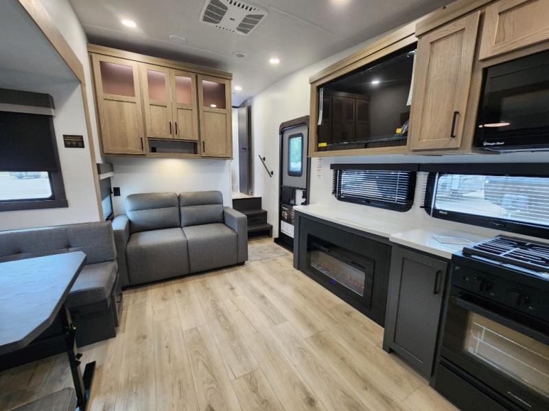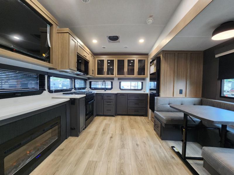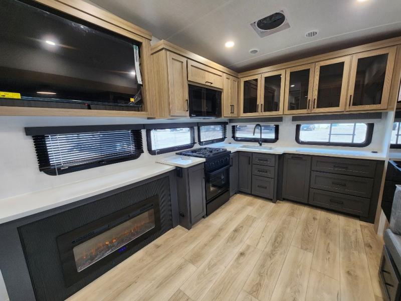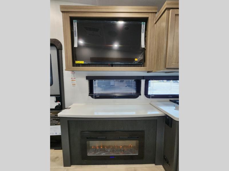 Why not have enough space for all your RVing friends to visit when you camp? This RV offers the perfect living and kitchen area with a large slide giving everyone more floor space, plus there is a king U-shaped dinette and a hide-a-bed sofa to sit on, a fireplace to enjoy and a Smart TV to watch a game or movie together. The cook will love the rear kitchen with extra counter space along a side wall to leave all the snacks and treats for everyone. You might even take everyone outside to enjoy the 21' power awning that offers an outdoor living area with some protection and LED lighting; just grab your camping chairs from the pass-through storage. At night, you can retire to the front bedroom with a queen bed, a spacious wardrobe, plus a TV option if you enjoy movies in bed!