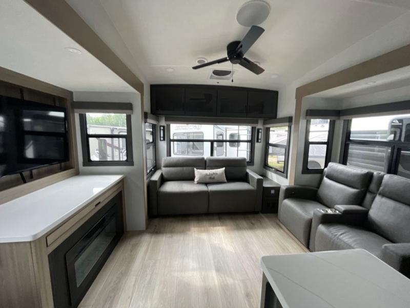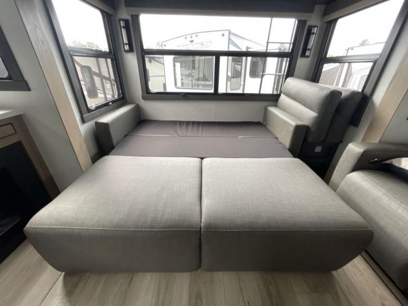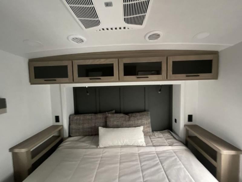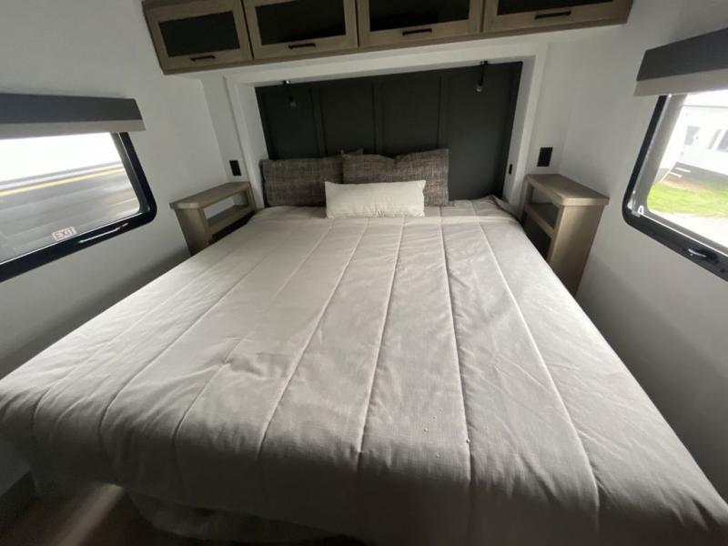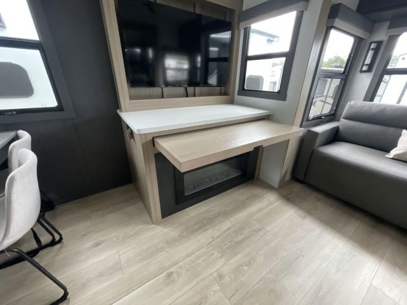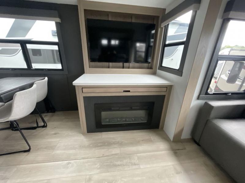 You can enjoy views from inside or outside each day once this RV is set up at the campgrounds! The large windows in the furniture slide and the windows throughout allow you to take in the scenery, and the dual opposing slides give you a spacious main living and kitchen area. You will find lots of seating for guests on the hide-a-bed sofa in the rear, and on the theater seats and table in the slide. The cook will love the 12V refrigerator and large pantry to store food, and everyone can enjoy the Smart TV and fireplace when visiting and relaxing. This unit also includes a pull-out desk which will be perfect if you plan to telecommute. And don't overlook the front private bedroom with its queen bed, wardrobe, and TV option!