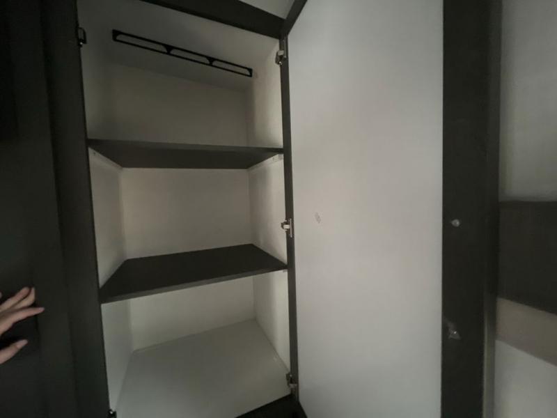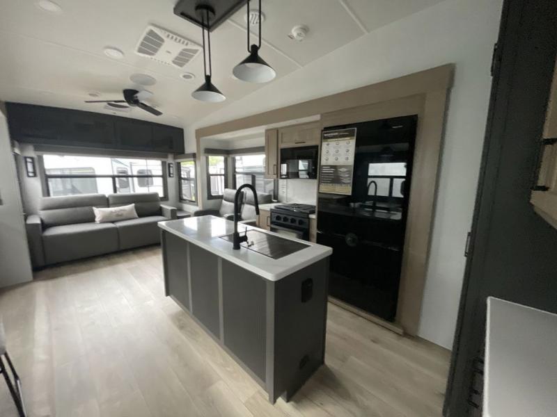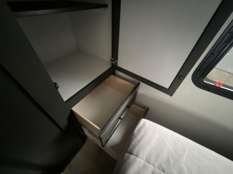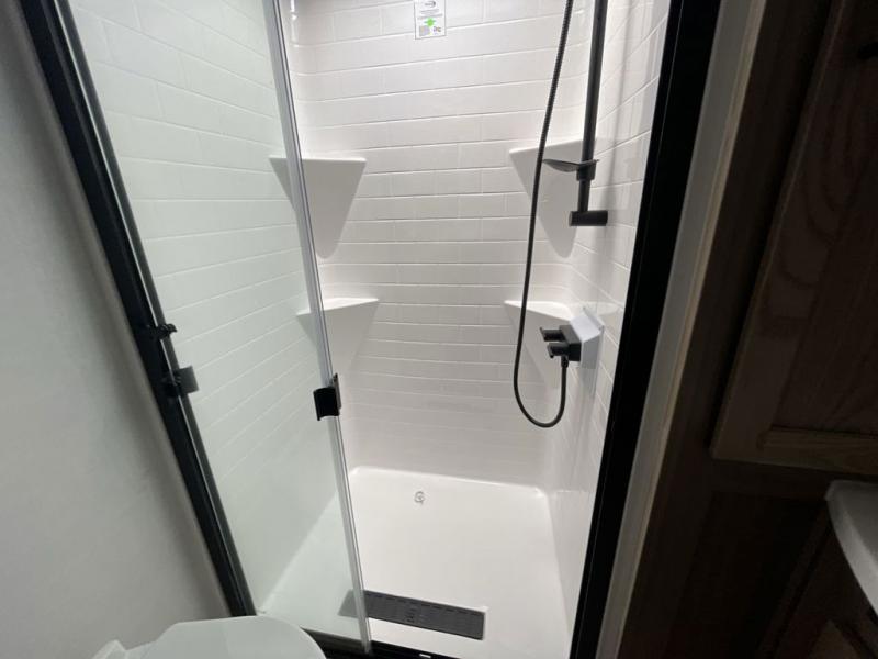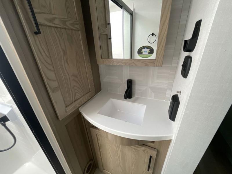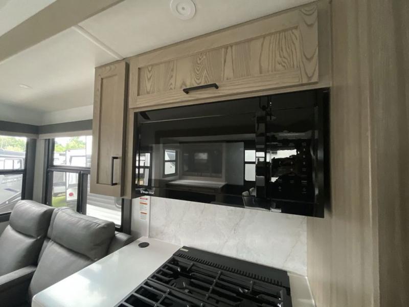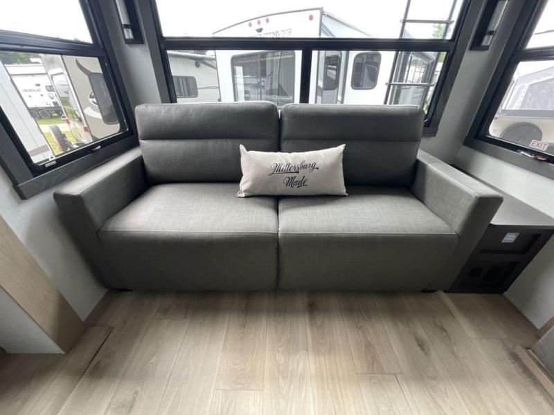 You can enjoy views from inside or outside each day once this RV is set up at the campgrounds! The large windows in the furniture slide and the windows throughout allow you to take in the scenery, and the dual opposing slides give you a spacious main living and kitchen area. You will find lots of seating for guests on the hide-a-bed sofa in the rear, and on the theater seats and table in the slide. The cook will love the 12V refrigerator and large pantry to store food, and everyone can enjoy the Smart TV and fireplace when visiting and relaxing. This unit also includes a pull-out desk which will be perfect if you plan to telecommute. And don't overlook the front private bedroom with its queen bed, wardrobe, and TV option!