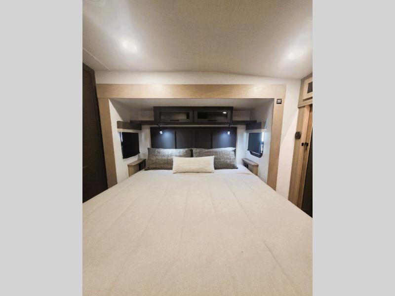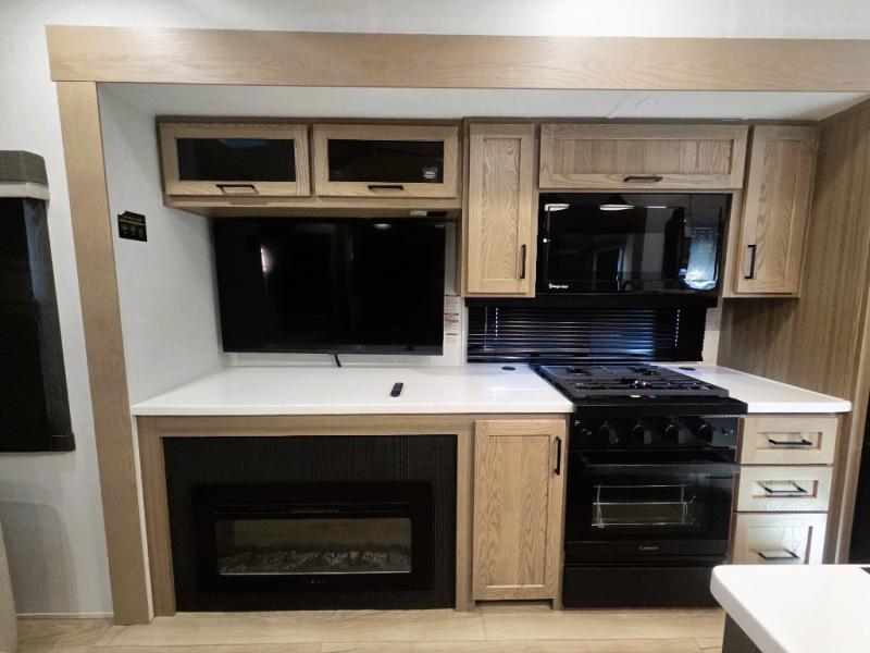 You can enjoy views from inside or outside each day once this RV is set up at the campgrounds! The large windows in the furniture slide and the windows throughout allow you to take in the scenery, and the three slide outs give you a spacious main living and kitchen area as well as front bedroom. You will find lots of seating for guests on the hide-a-bed sofa in the rear, on the theater seats and the table, chairs and bench in the slide. The cook will love the 12V refrigerator and large pantry to store food, and everyone can enjoy the Smart TV and fireplace when visiting and relaxing. The front bedroom offers a king bed slide, a front wardrobe, plus washer and dryer prep if you choose to add those appliances.