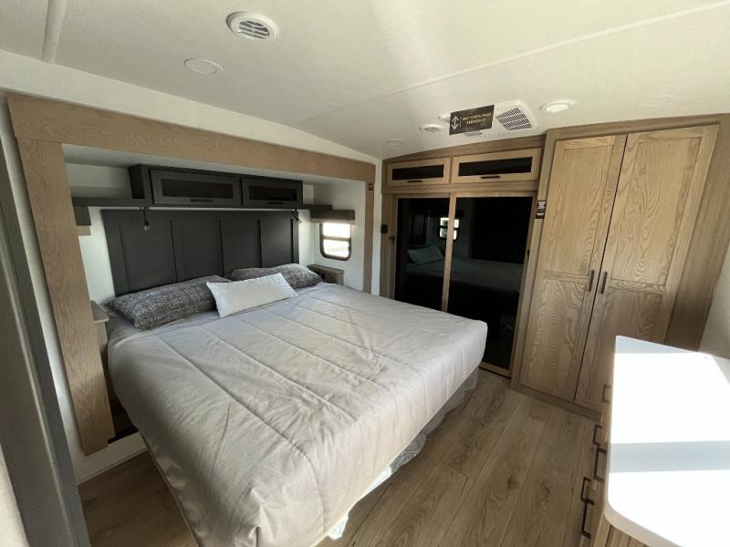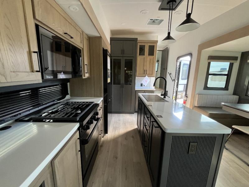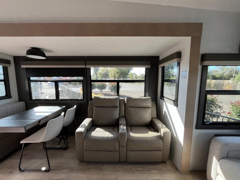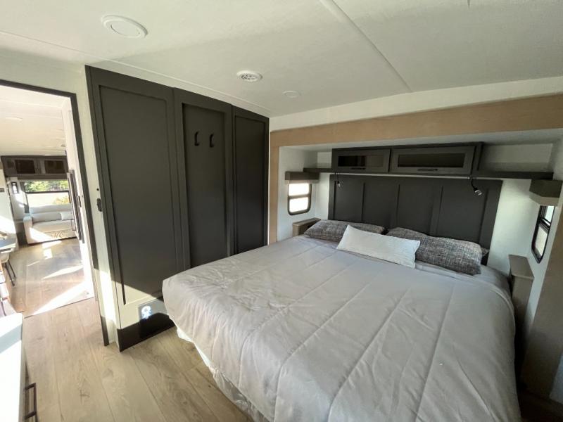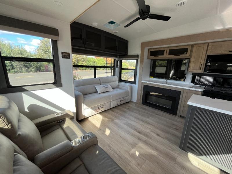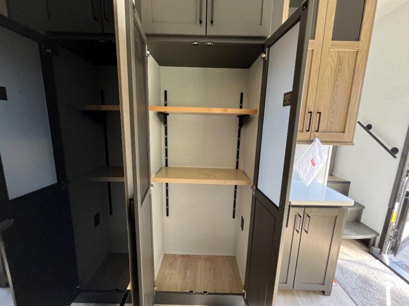 You can enjoy views from inside or outside each day once this RV is set up at the campgrounds! The large windows in the furniture slide and the windows throughout allow you to take in the scenery, and the three slide outs give you a spacious main living and kitchen area as well as front bedroom. You will find lots of seating for guests on the hide-a-bed sofa in the rear, on the theater seats and the table, chairs and bench in the slide. The cook will love the 12V refrigerator and large pantry to store food, and everyone can enjoy the Smart TV and fireplace when visiting and relaxing. The front bedroom offers a king bed slide, a front wardrobe, plus washer and dryer prep if you choose to add those appliances.