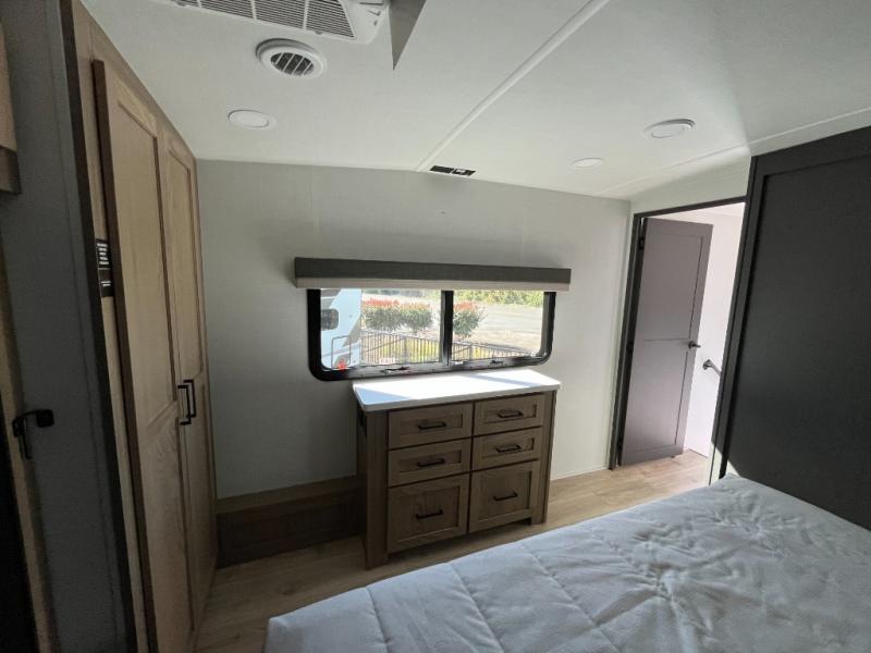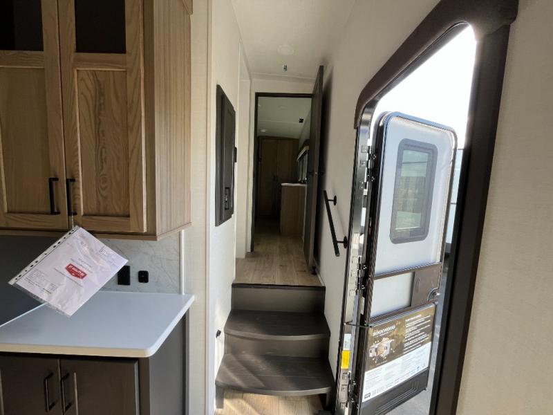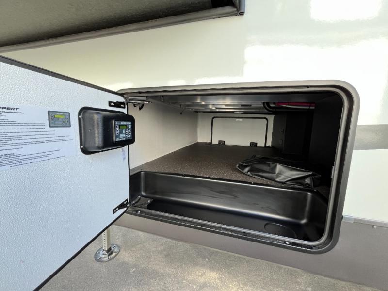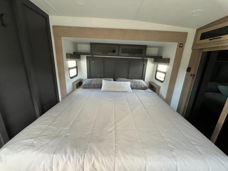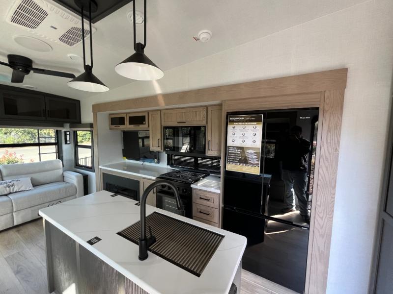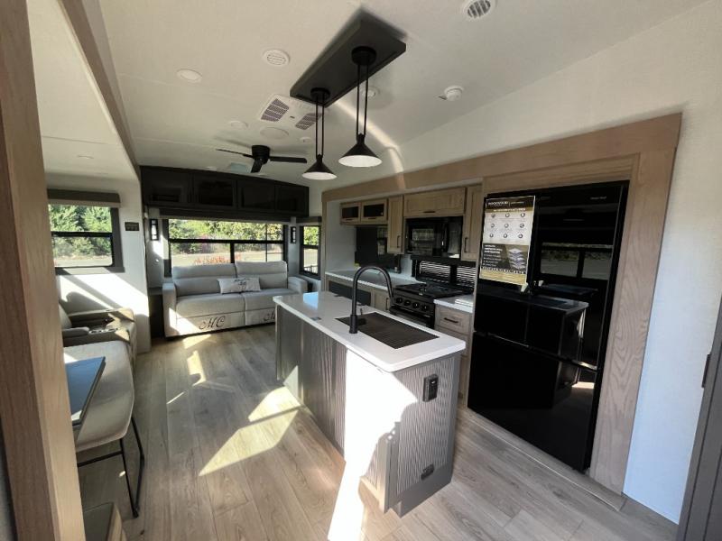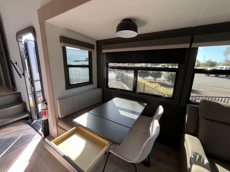 You can enjoy views from inside or outside each day once this RV is set up at the campgrounds! The large windows in the furniture slide and the windows throughout allow you to take in the scenery, and the three slide outs give you a spacious main living and kitchen area as well as front bedroom. You will find lots of seating for guests on the hide-a-bed sofa in the rear, on the theater seats and the table, chairs and bench in the slide. The cook will love the 12V refrigerator and large pantry to store food, and everyone can enjoy the Smart TV and fireplace when visiting and relaxing. The front bedroom offers a king bed slide, a front wardrobe, plus washer and dryer prep if you choose to add those appliances.