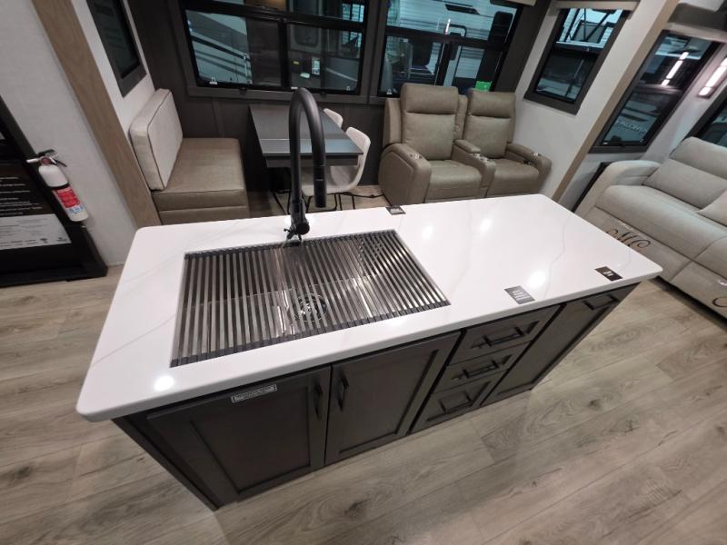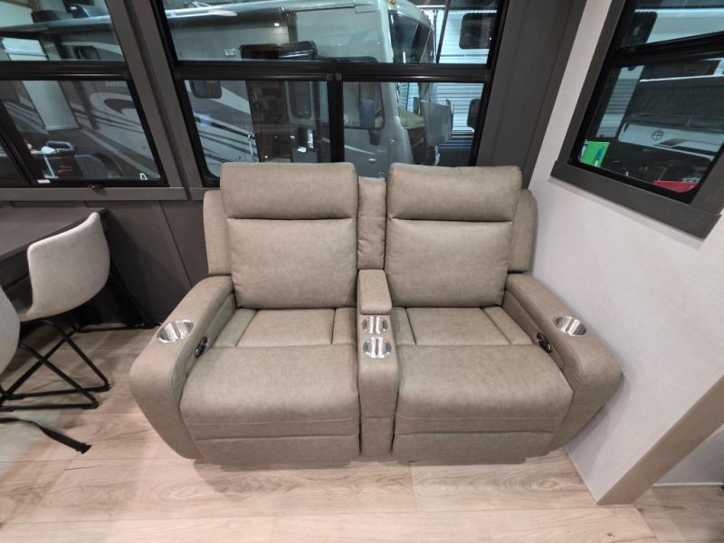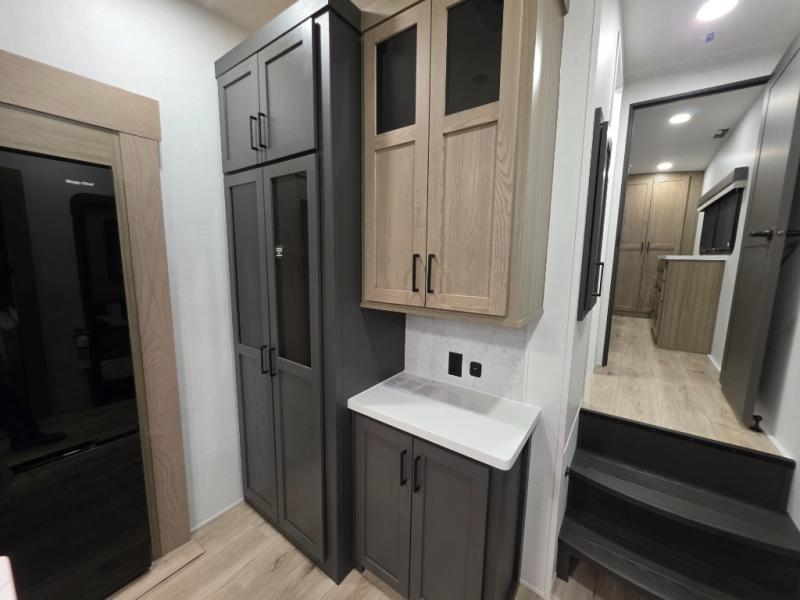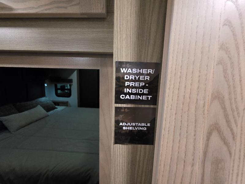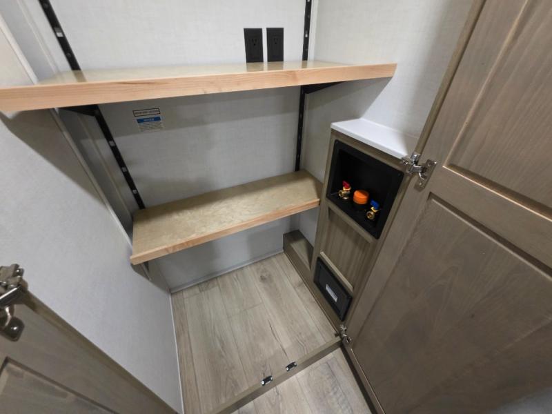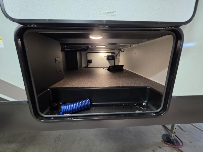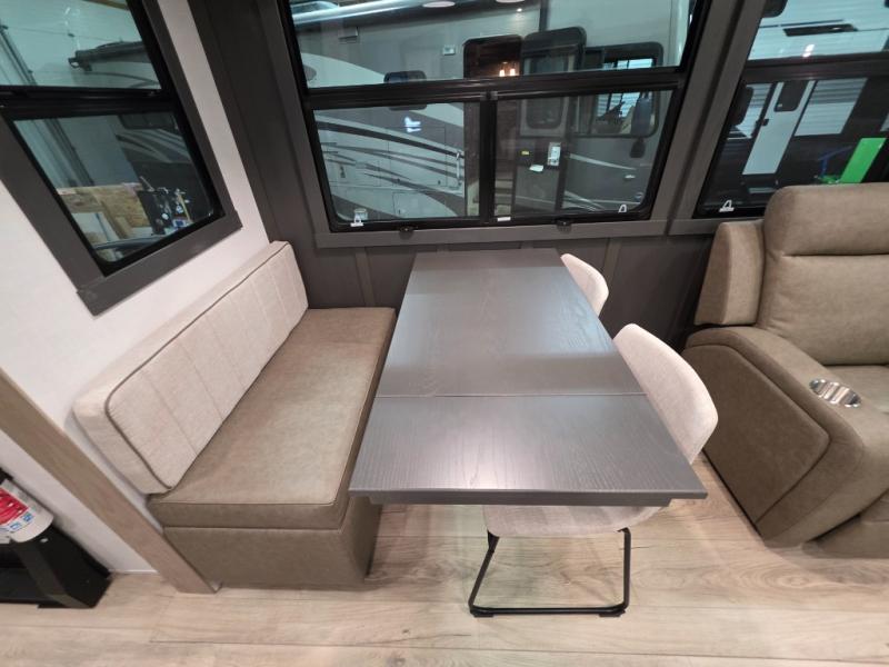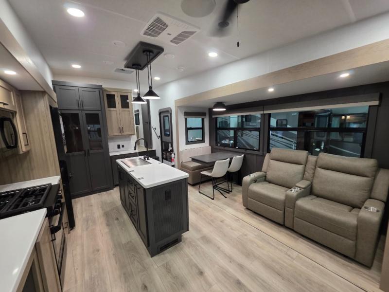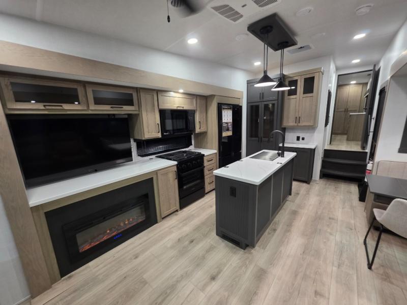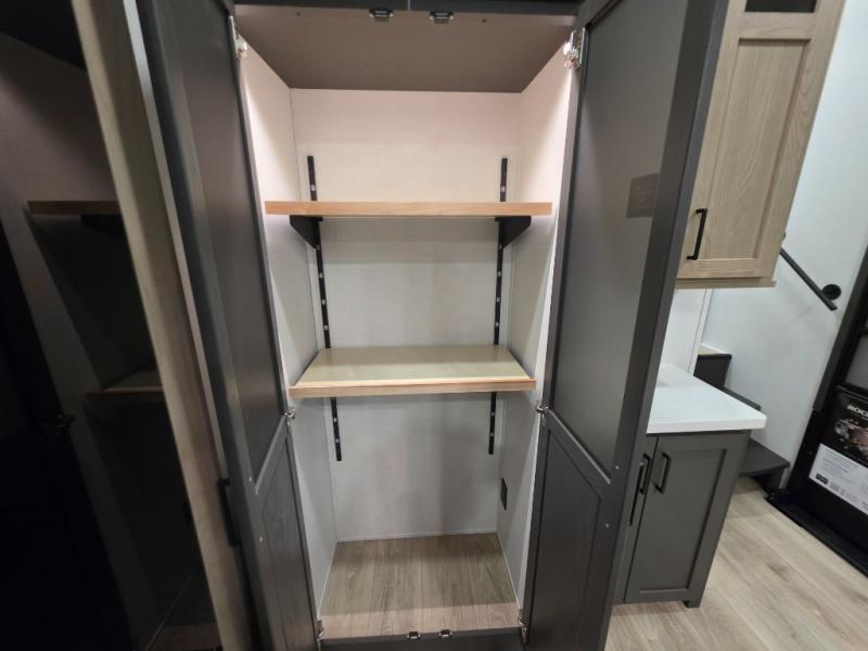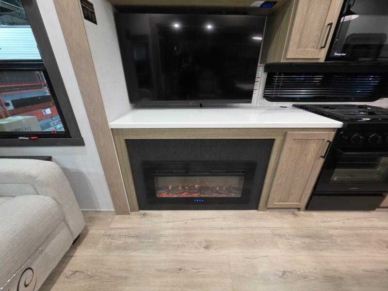 You can enjoy views from inside or outside each day once this RV is set up at the campgrounds! The large windows in the furniture slide and the windows throughout allow you to take in the scenery, and the three slide outs give you a spacious main living and kitchen area as well as front bedroom. You will find lots of seating for guests on the hide-a-bed sofa in the rear, on the theater seats and the table, chairs and bench in the slide. The cook will love the 12V refrigerator and large pantry to store food, and everyone can enjoy the Smart TV and fireplace when visiting and relaxing. The front bedroom offers a king bed slide, a front wardrobe, plus washer and dryer prep if you choose to add those appliances.
