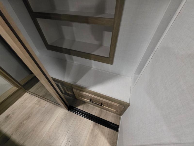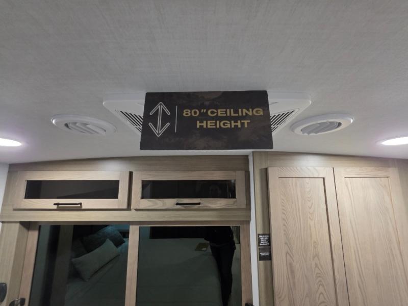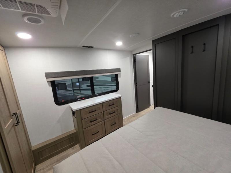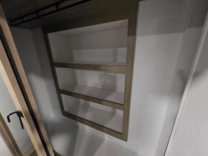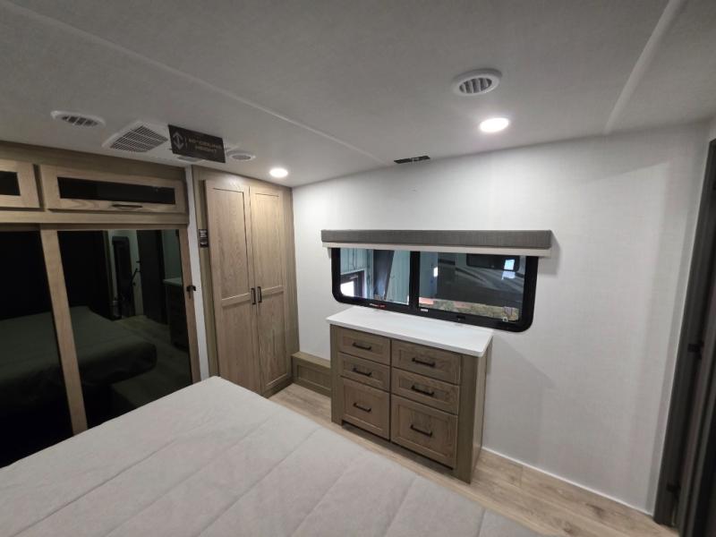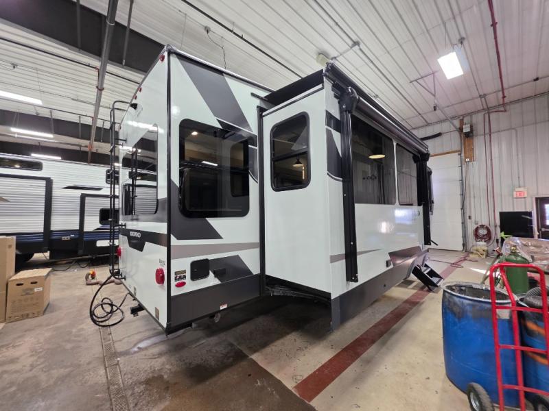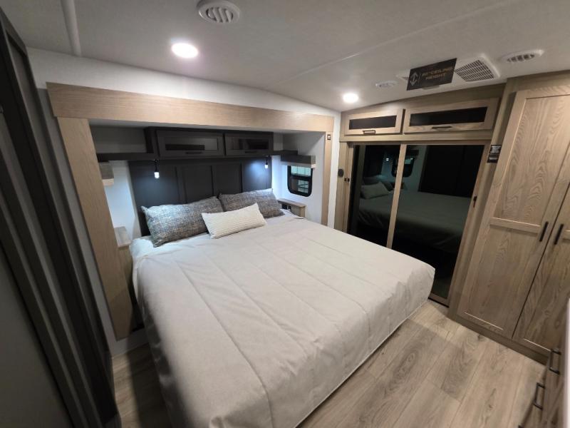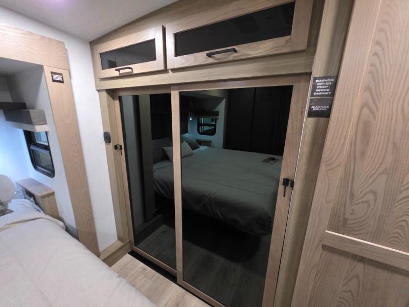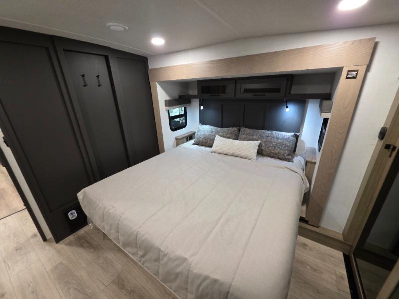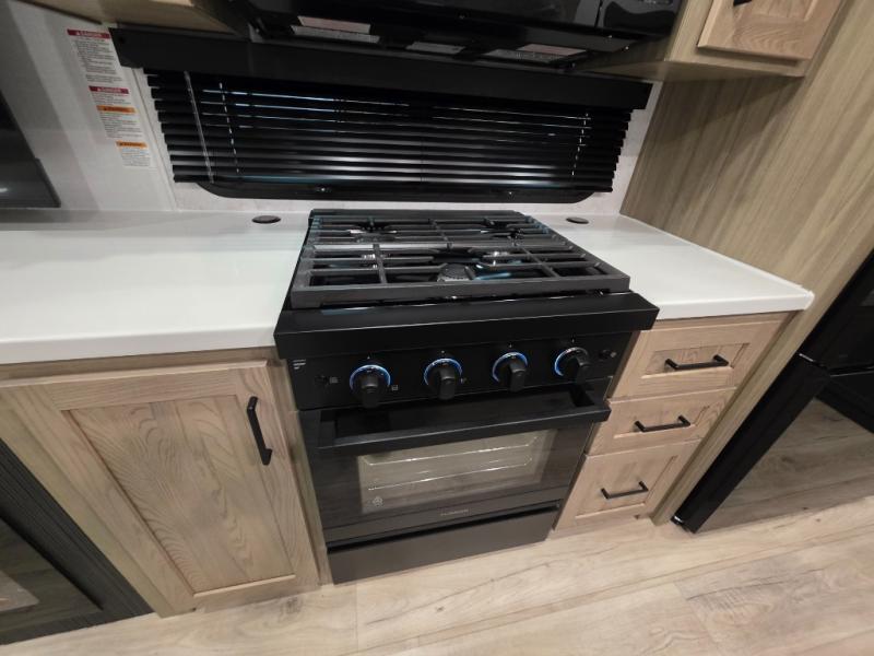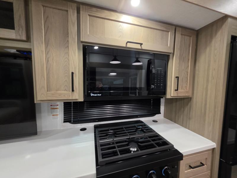 You can enjoy views from inside or outside each day once this RV is set up at the campgrounds! The large windows in the furniture slide and the windows throughout allow you to take in the scenery, and the three slide outs give you a spacious main living and kitchen area as well as front bedroom. You will find lots of seating for guests on the hide-a-bed sofa in the rear, on the theater seats and the table, chairs and bench in the slide. The cook will love the 12V refrigerator and large pantry to store food, and everyone can enjoy the Smart TV and fireplace when visiting and relaxing. The front bedroom offers a king bed slide, a front wardrobe, plus washer and dryer prep if you choose to add those appliances.