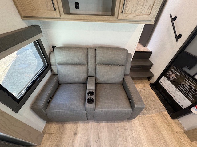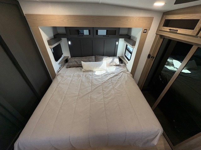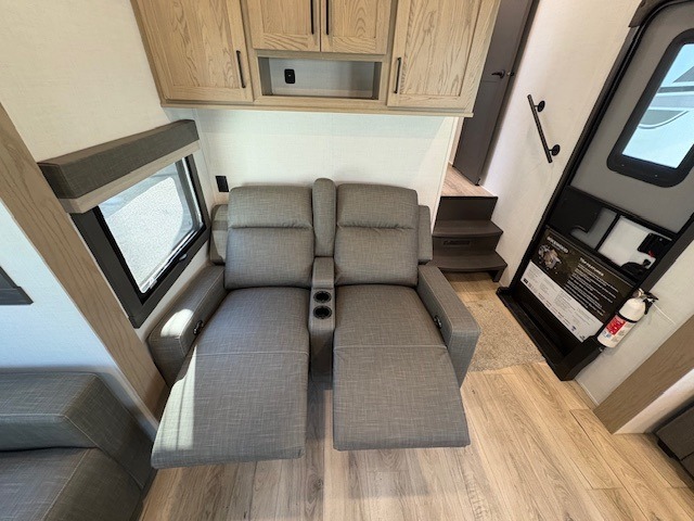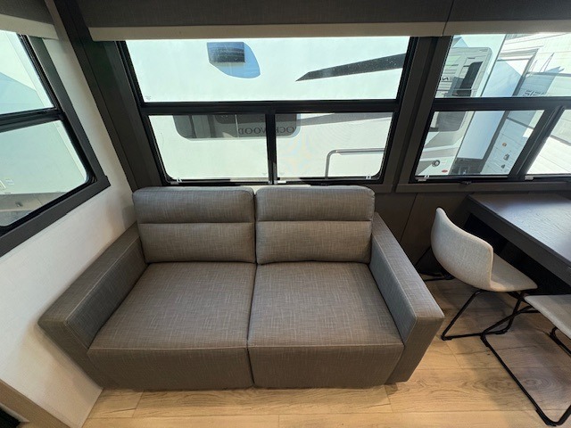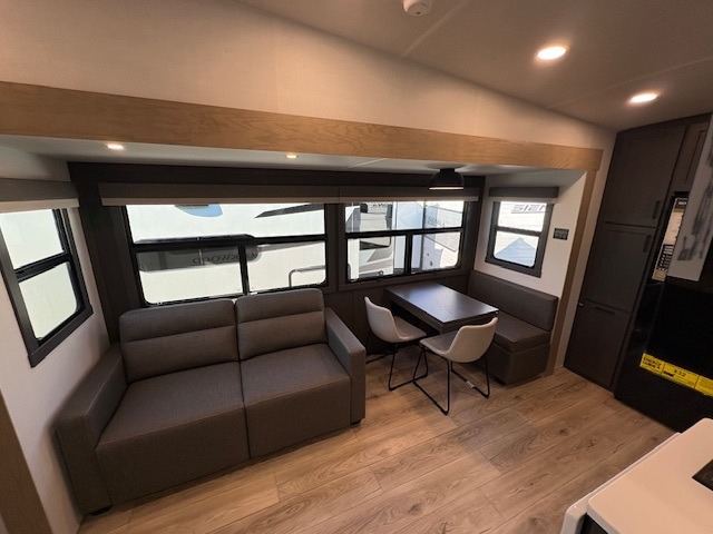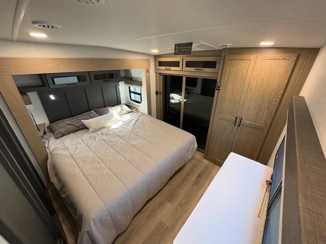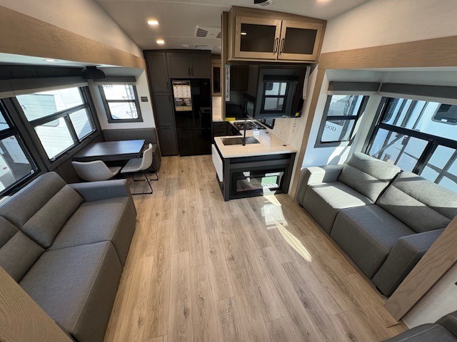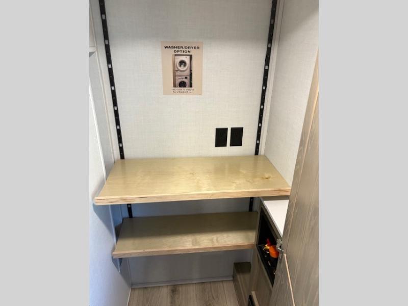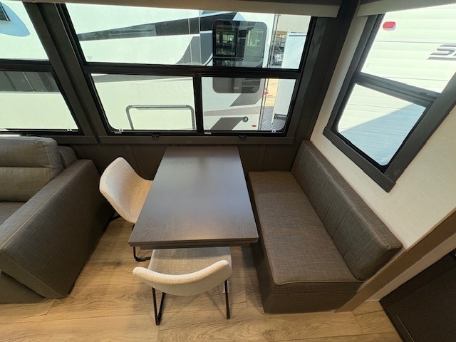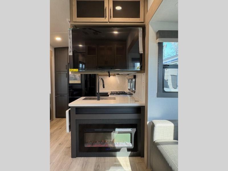 You can enjoy views from inside or outside each day once this RV is set up at the campgrounds! The large windows in the furniture slide and the windows throughout allow you to take in the scenery, and the three slide outs give you a spacious main living and kitchen area as well as front bedroom. You will find lots of seating for guests on the hide-a-bed sofa in the rear, on the theater seats and the table, chairs and bench in the slide. The cook will love the 12V refrigerator and large pantry to store food, and everyone can enjoy the Smart TV and fireplace when visiting and relaxing. The front bedroom offers a king bed slide, a front wardrobe, plus washer and dryer prep if you choose to add those appliances.