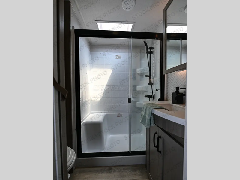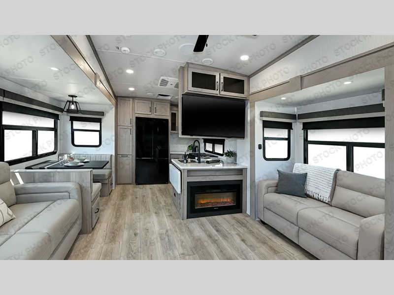 This rear kitchen fifth wheel is the perfect coach for a couple, or one that likes to entertain overnight guests. With two hide-a-bed sofas, one 60" and the other 67", you will have plenty of room for taking along extra family or friends on your adventures. The kitchen is tucked in the back and features a u-shaped counter area, and there is a 39" booth dinette within the slide that houses the 67" HAB sofa. You could also choose the optional theater seating in place of this hide-a-bed if you don't need the extra sleeping space. There is also a 60" theater seat for movie night opposite the TV/fireplace. Head up the steps to your private front bedroom with slide out queen bed, dresser, and large wardrobe with washer and dryer prep. The bathroom is at the top of the steps up and includes a large shower, linen cabinet and sink with medicine cabinet, plus a toilet. This unit also features ample storage on the outside as well as on the interior.