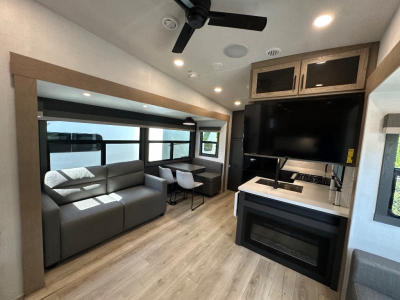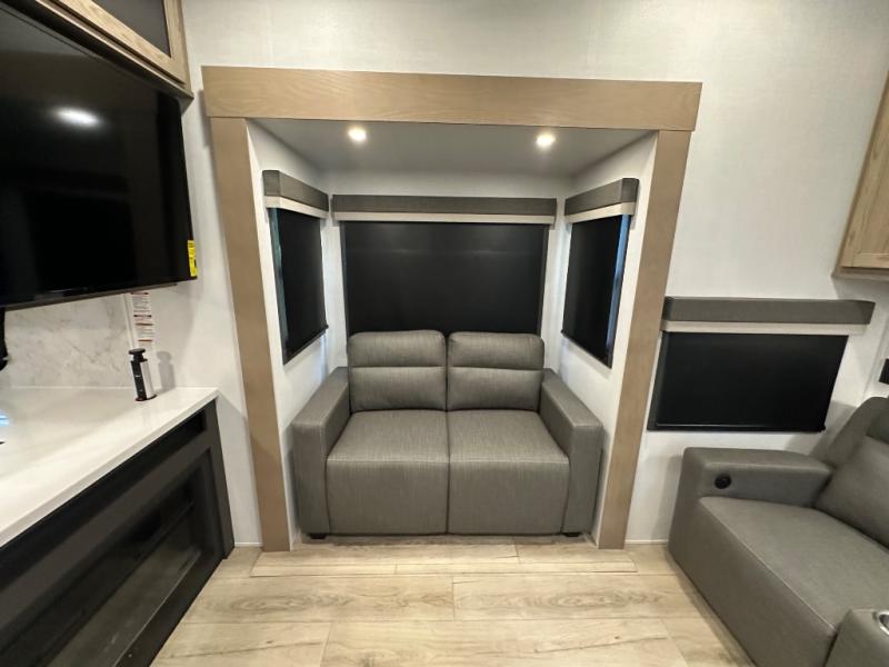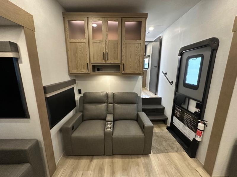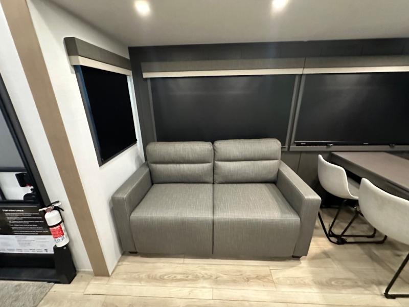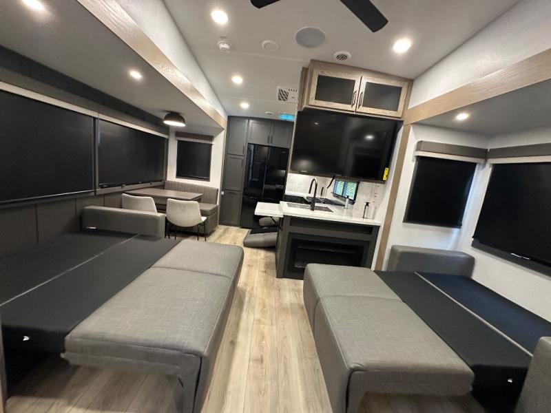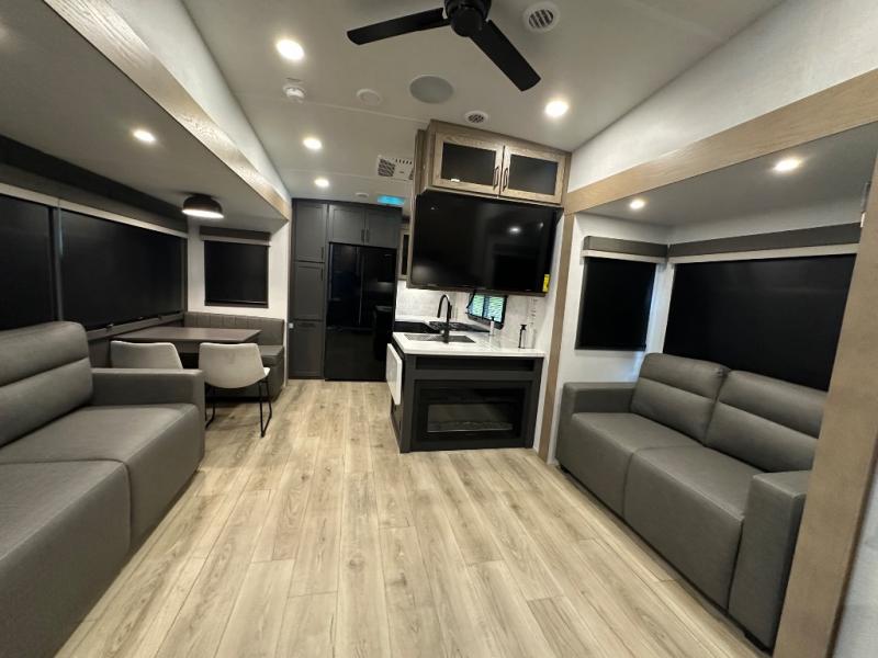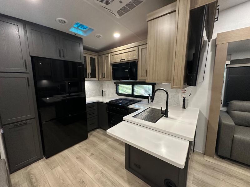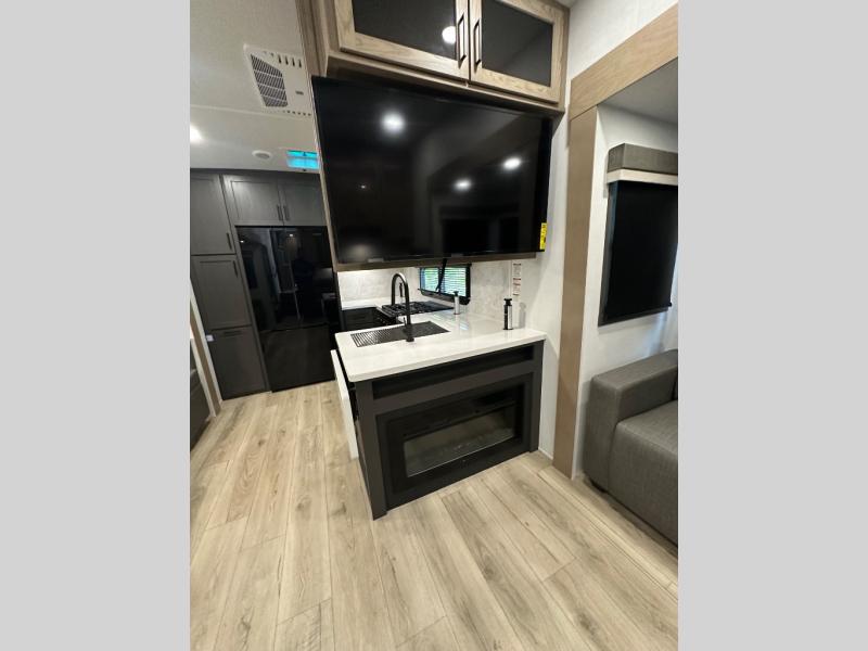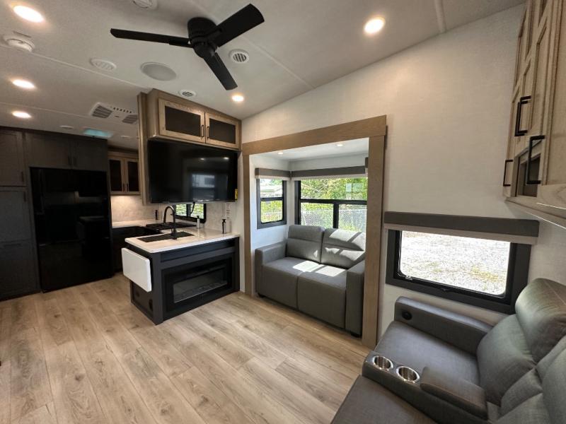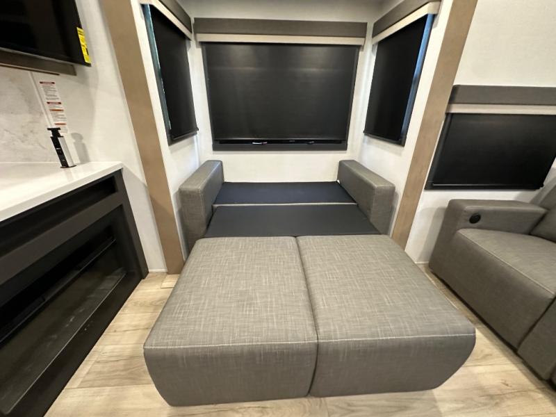 This rear kitchen fifth wheel is the perfect coach for a couple, or one that likes to entertain overnight guests. With two hide-a-bed sofas, one 60" and the other 67", you will have plenty of room for taking along extra family or friends on your adventures. The kitchen is tucked in the back and features a u-shaped counter area, and there is a 39" booth dinette within the slide that houses the 67" HAB sofa. You could also choose the optional theater seating in place of this hide-a-bed if you don't need the extra sleeping space. There is also a 60" theater seat for movie night opposite the TV/fireplace. Head up the steps to your private front bedroom with slide out queen bed, dresser, and large wardrobe with washer and dryer prep. The bathroom is at the top of the steps up and includes a large shower, linen cabinet and sink with medicine cabinet, plus a toilet. This unit also features ample storage on the outside as well as on the interior.