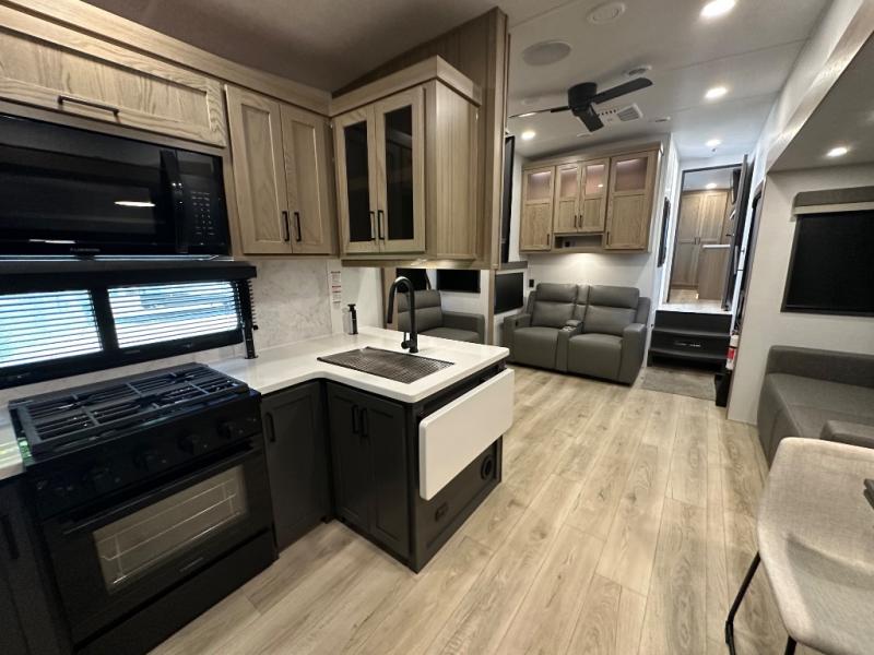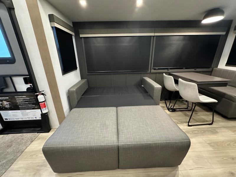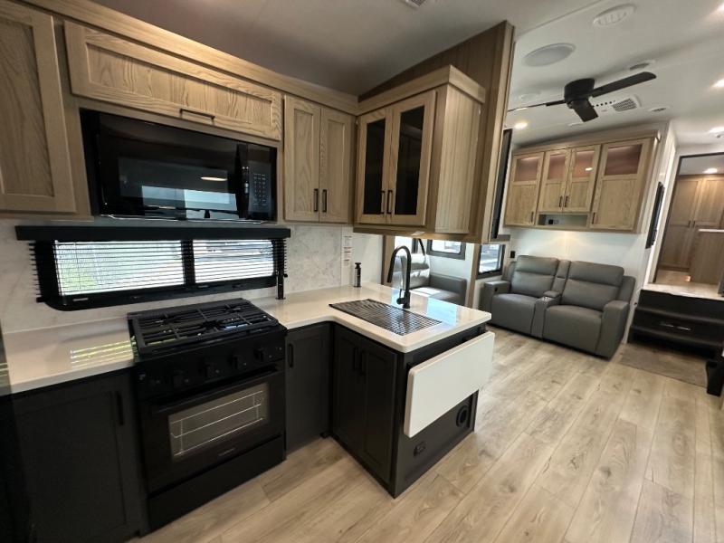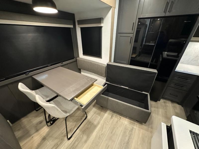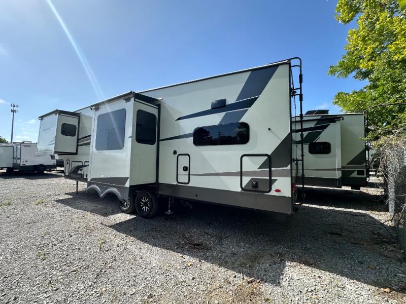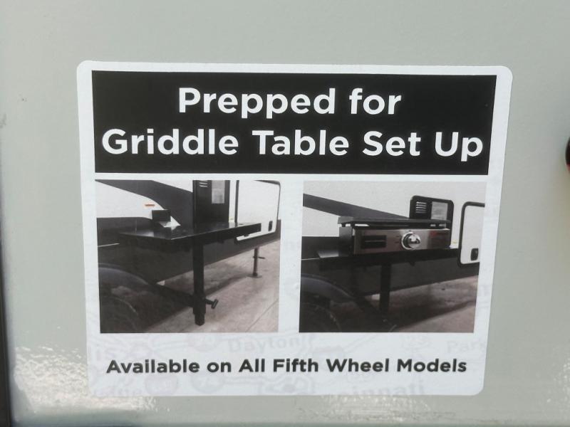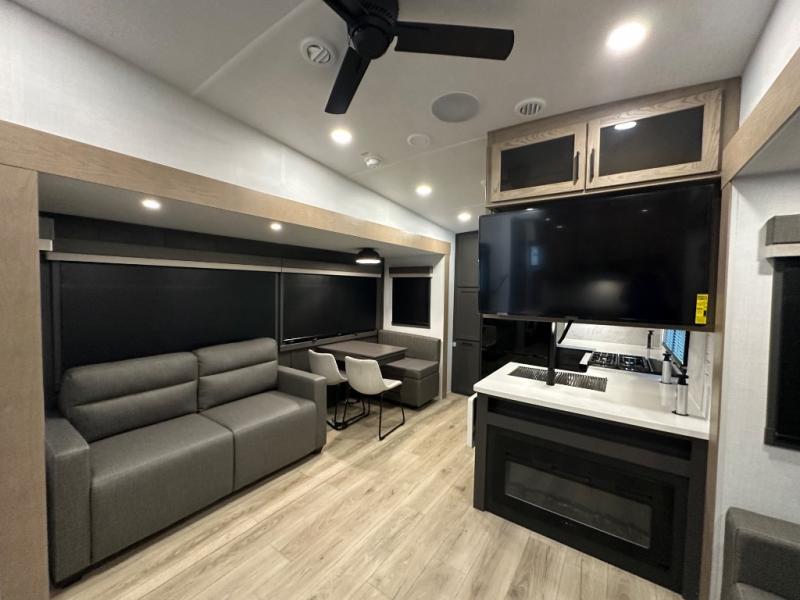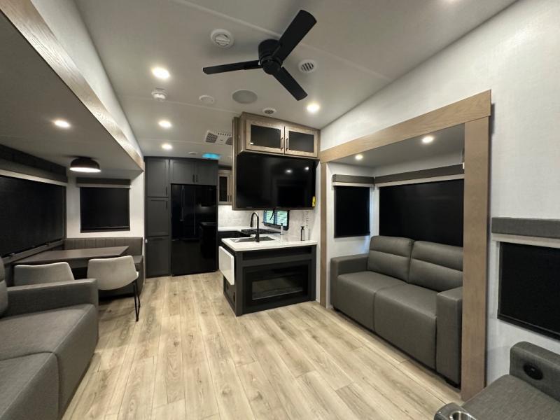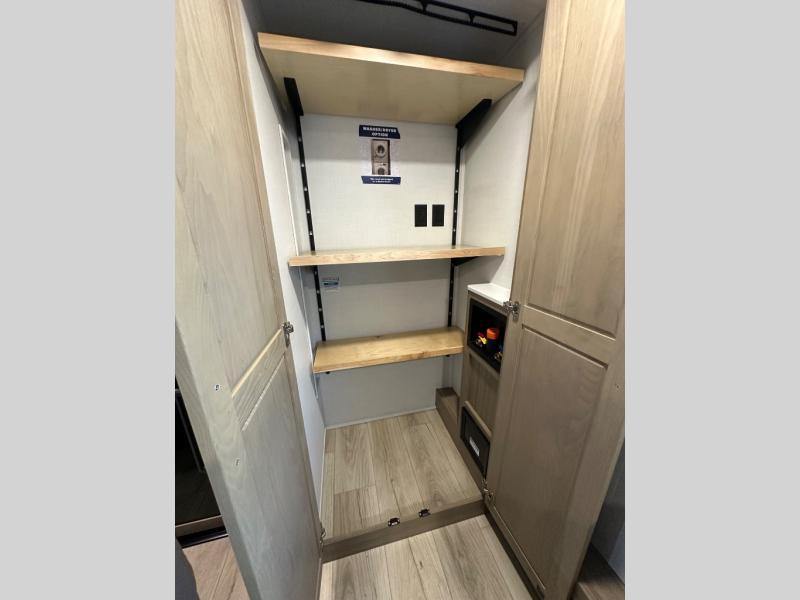 This rear kitchen fifth wheel is the perfect coach for a couple, or one that likes to entertain overnight guests. With two hide-a-bed sofas, one 60" and the other 67", you will have plenty of room for taking along extra family or friends on your adventures. The kitchen is tucked in the back and features a u-shaped counter area, and there is a 39" booth dinette within the slide that houses the 67" HAB sofa. You could also choose the optional theater seating in place of this hide-a-bed if you don't need the extra sleeping space. There is also a 60" theater seat for movie night opposite the TV/fireplace. Head up the steps to your private front bedroom with slide out queen bed, dresser, and large wardrobe with washer and dryer prep. The bathroom is at the top of the steps up and includes a large shower, linen cabinet and sink with medicine cabinet, plus a toilet. This unit also features ample storage on the outside as well as on the interior.