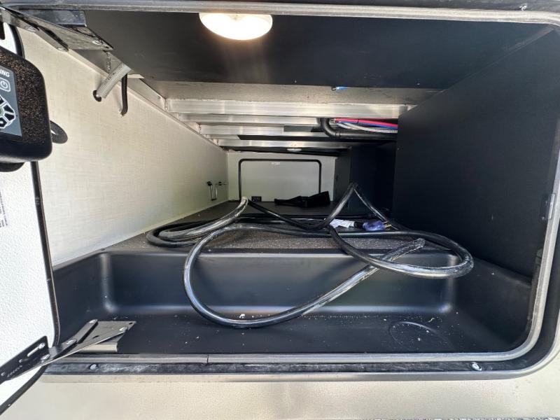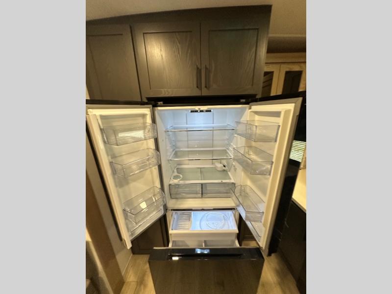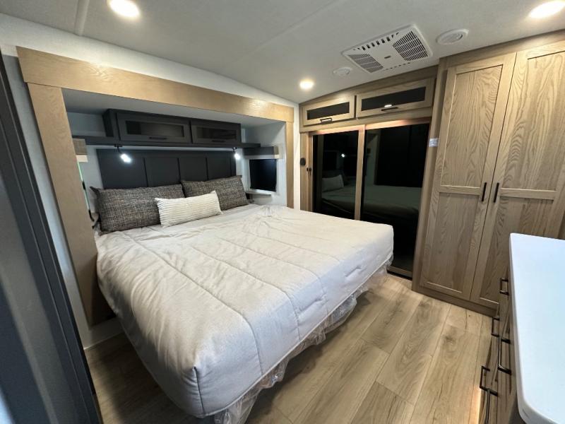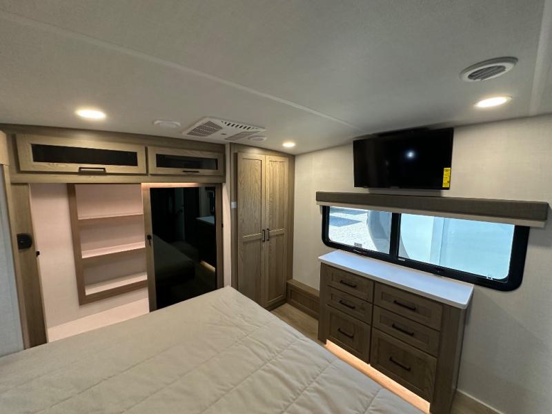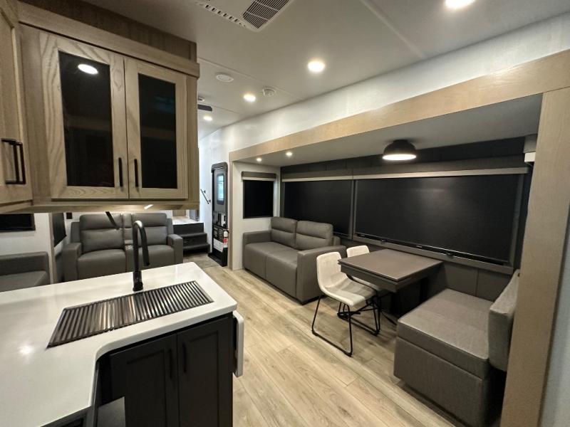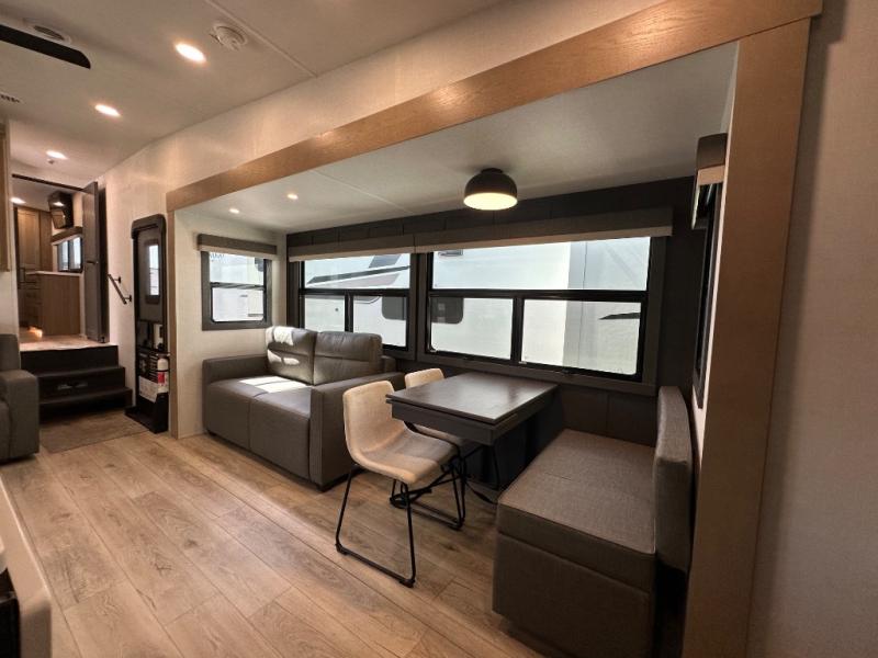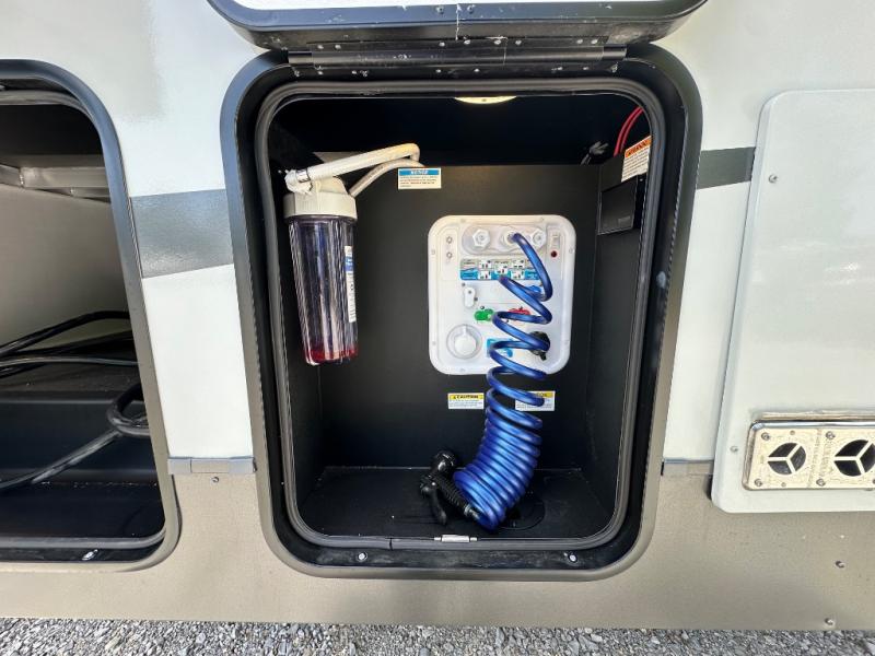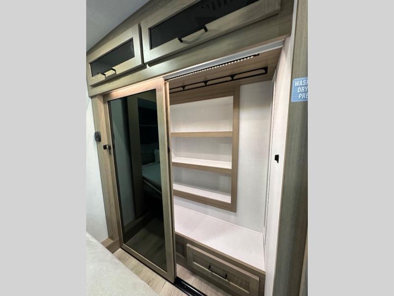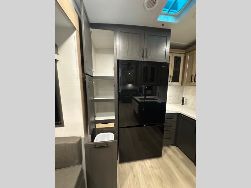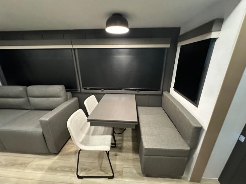 This rear kitchen fifth wheel is the perfect coach for a couple, or one that likes to entertain overnight guests. With two hide-a-bed sofas, one 60" and the other 67", you will have plenty of room for taking along extra family or friends on your adventures. The kitchen is tucked in the back and features a u-shaped counter area, and there is a 39" booth dinette within the slide that houses the 67" HAB sofa. You could also choose the optional theater seating in place of this hide-a-bed if you don't need the extra sleeping space. There is also a 60" theater seat for movie night opposite the TV/fireplace. Head up the steps to your private front bedroom with slide out queen bed, dresser, and large wardrobe with washer and dryer prep. The bathroom is at the top of the steps up and includes a large shower, linen cabinet and sink with medicine cabinet, plus a toilet. This unit also features ample storage on the outside as well as on the interior.