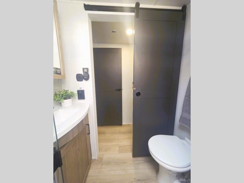 This rear kitchen fifth wheel is the perfect coach for a couple, or one that likes to entertain overnight guests. With two hide-a-bed sofas, one 60" and the other 68", you will have plenty of room for taking along extra family or friends on your adventures. The kitchen is tucked in the back and features a u-shaped counter area, and there is a table, chairs & bench within the slide that houses the 68" HAB sofa. You could also choose the optional theater seating in place of this hide-a-bed if you don't need the extra sleeping space. There is also a 60" theater seat for movie night opposite the TV/fireplace. Head up the steps to your private front bedroom with slide out queen bed, dresser, and large wardrobe with washer and dryer prep. The bathroom is at the top of the steps up and includes a large shower, linen cabinet and sink, plus a toilet. This unit also features ample storage on the outside as well as on the interior.