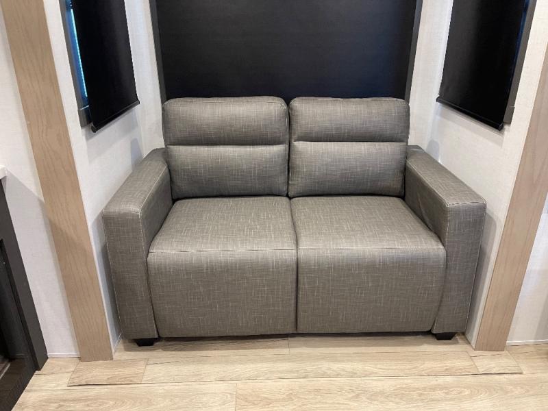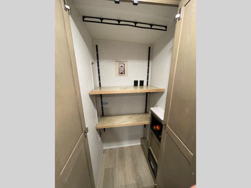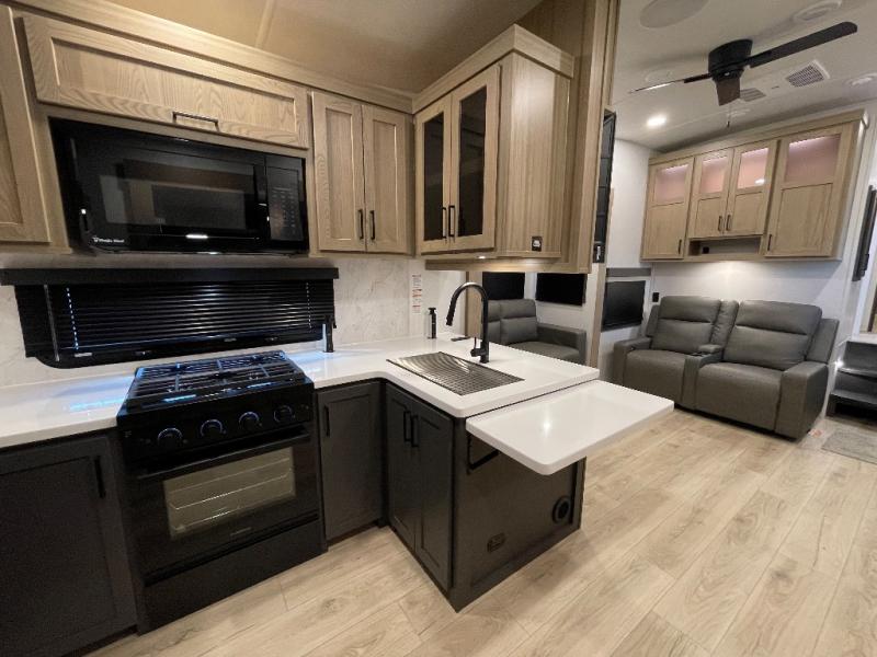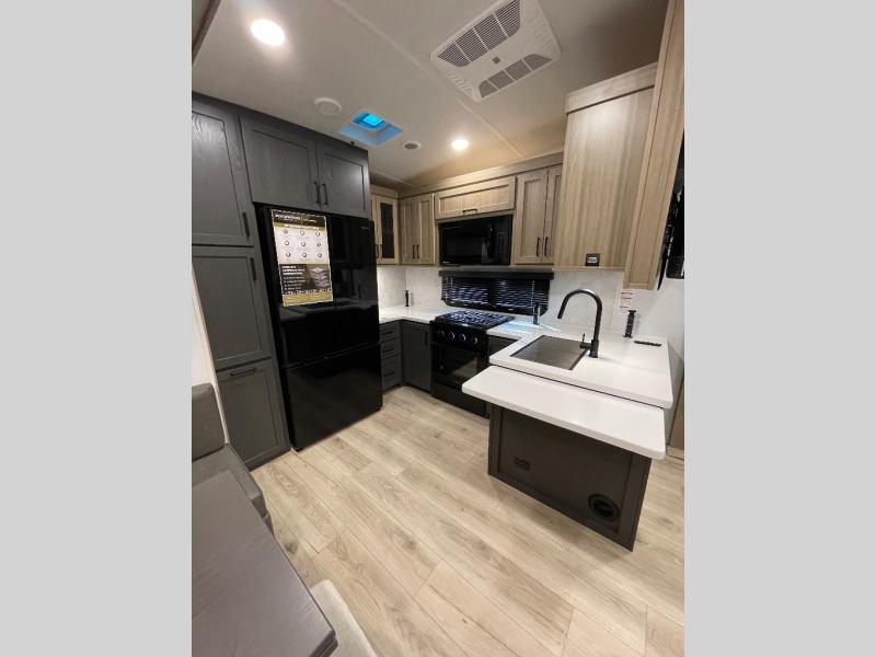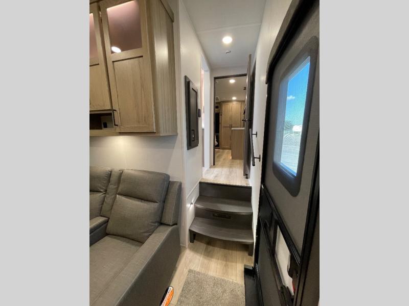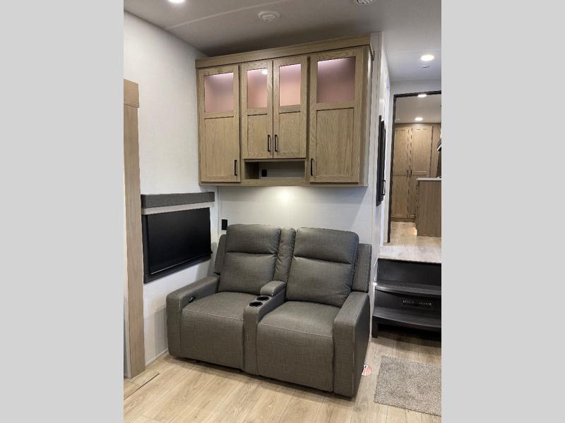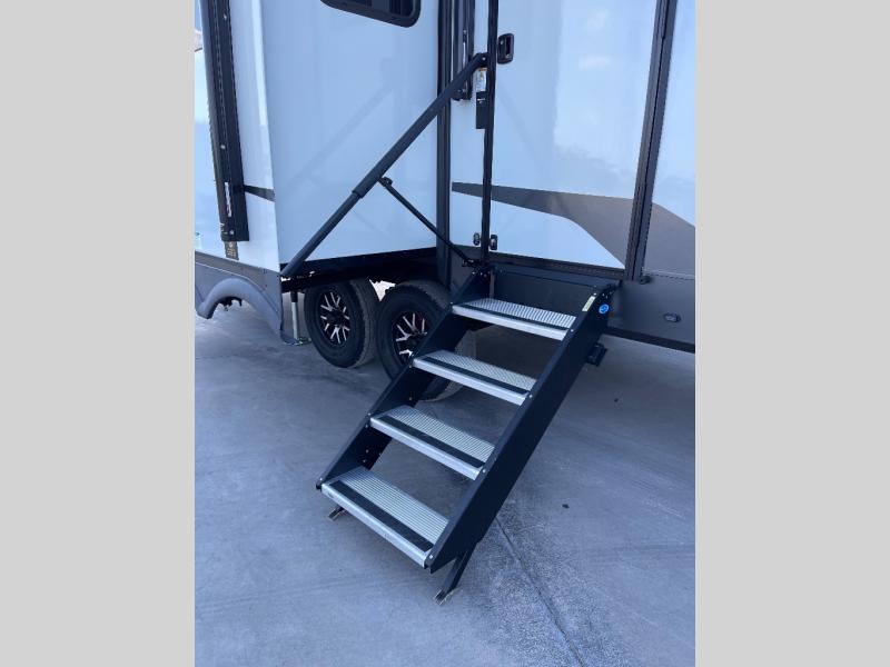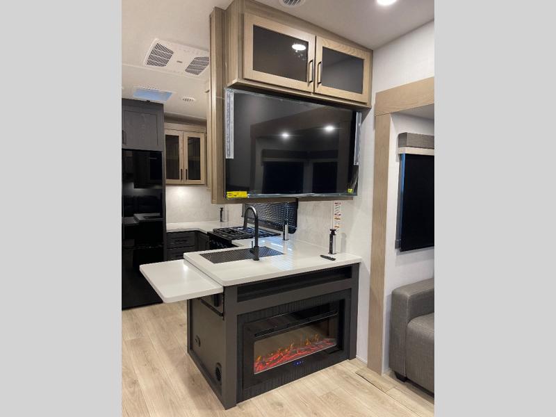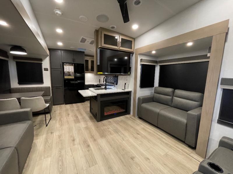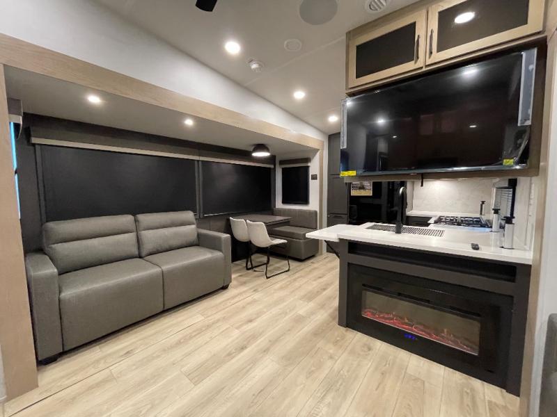 This rear kitchen fifth wheel is the perfect coach for a couple, or one that likes to entertain overnight guests. With two hide-a-bed sofas, one 60" and the other 68", you will have plenty of room for taking along extra family or friends on your adventures. The kitchen is tucked in the back and features a u-shaped counter area, and there is a table, chairs & bench within the slide that houses the 68" HAB sofa. You could also choose the optional theater seating in place of this hide-a-bed if you don't need the extra sleeping space. There is also a 60" theater seat for movie night opposite the TV/fireplace. Head up the steps to your private front bedroom with slide out queen bed, dresser, and large wardrobe with washer and dryer prep. The bathroom is at the top of the steps up and includes a large shower, linen cabinet and sink, plus a toilet. This unit also features ample storage on the outside as well as on the interior.