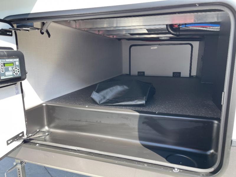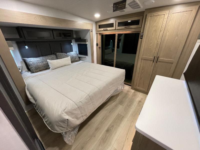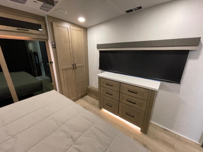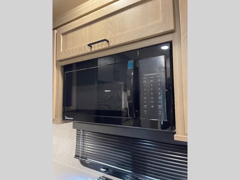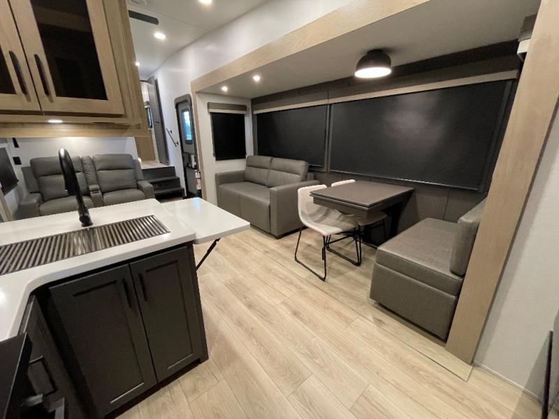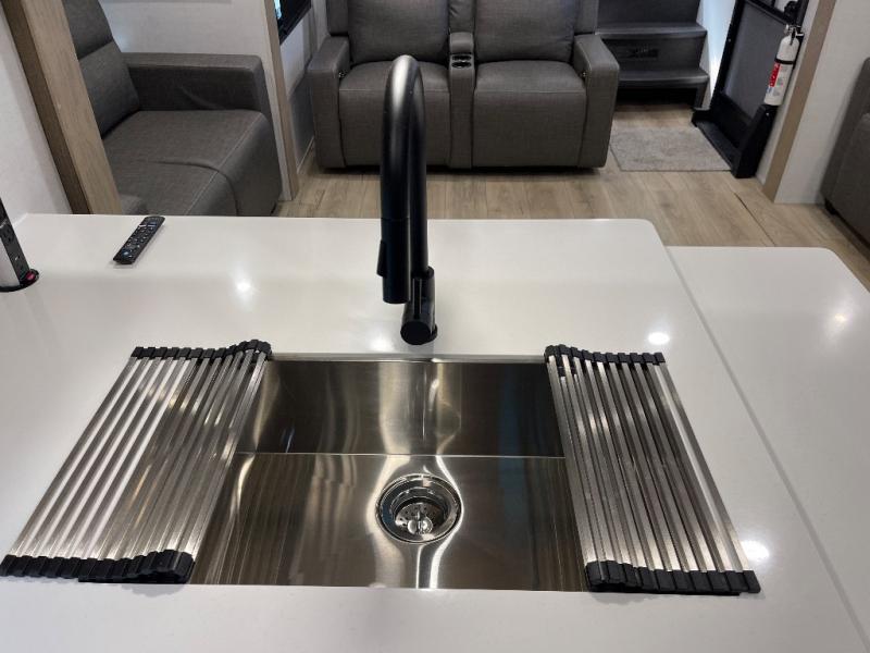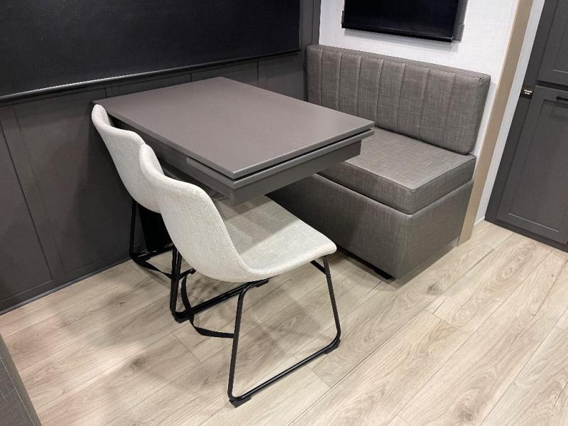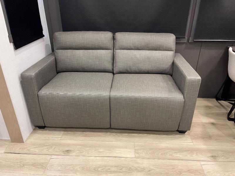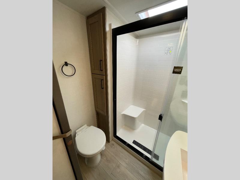 This rear kitchen fifth wheel is the perfect coach for a couple, or one that likes to entertain overnight guests. With two hide-a-bed sofas, one 60" and the other 68", you will have plenty of room for taking along extra family or friends on your adventures. The kitchen is tucked in the back and features a u-shaped counter area, and there is a table, chairs & bench within the slide that houses the 68" HAB sofa. You could also choose the optional theater seating in place of this hide-a-bed if you don't need the extra sleeping space. There is also a 60" theater seat for movie night opposite the TV/fireplace. Head up the steps to your private front bedroom with slide out queen bed, dresser, and large wardrobe with washer and dryer prep. The bathroom is at the top of the steps up and includes a large shower, linen cabinet and sink, plus a toilet. This unit also features ample storage on the outside as well as on the interior.