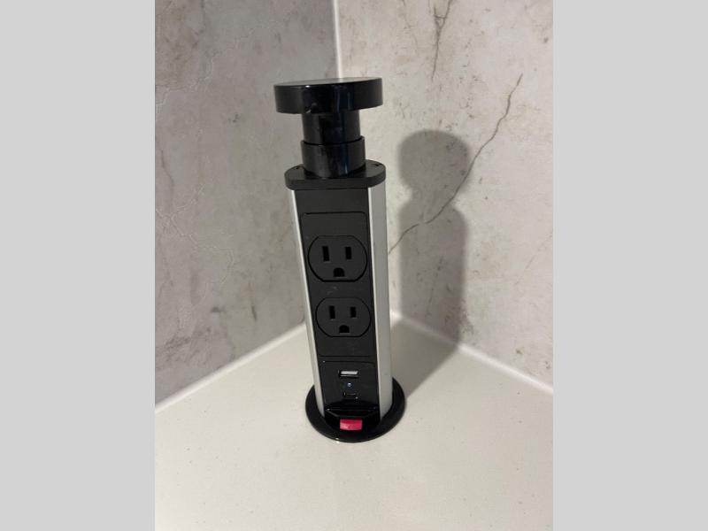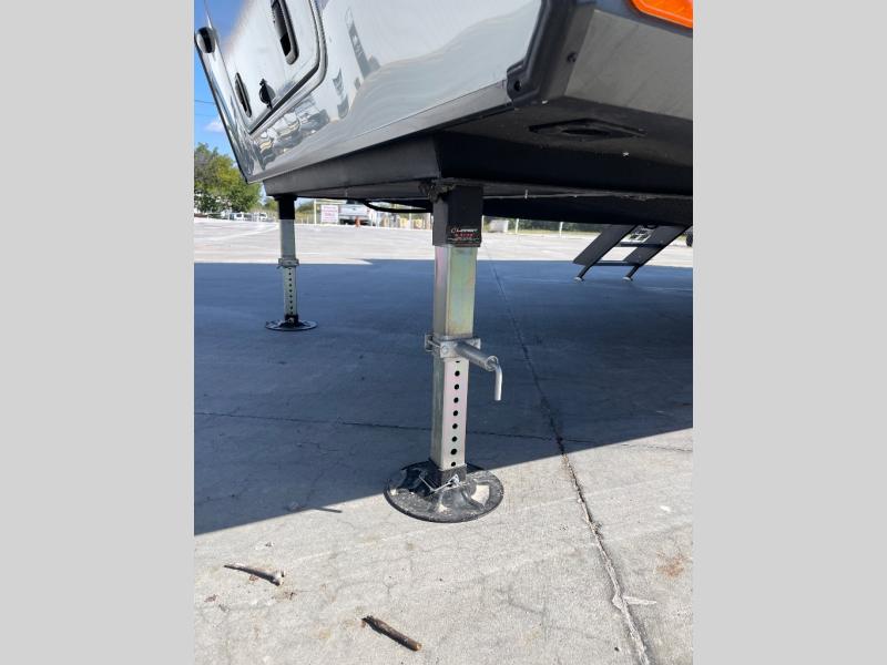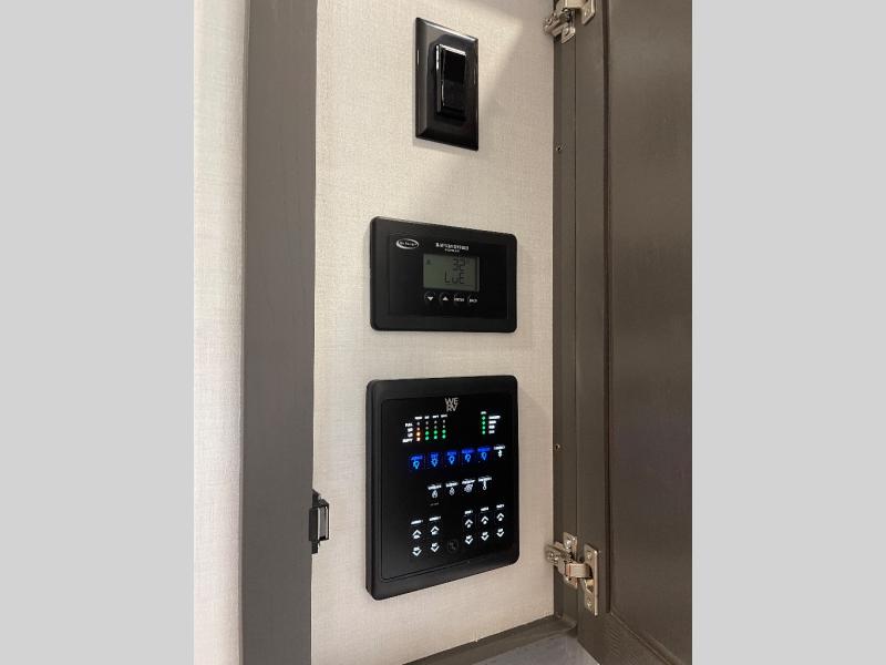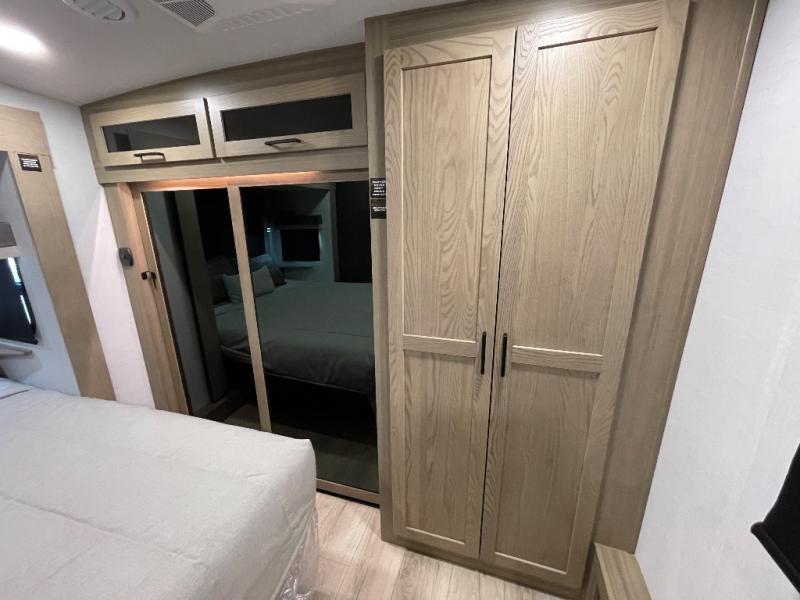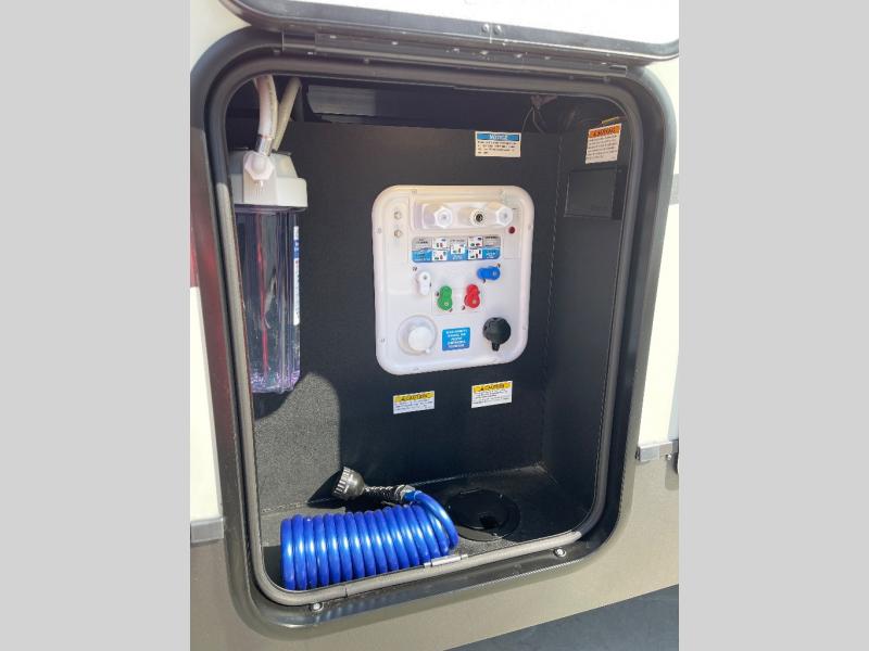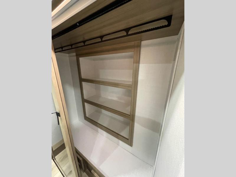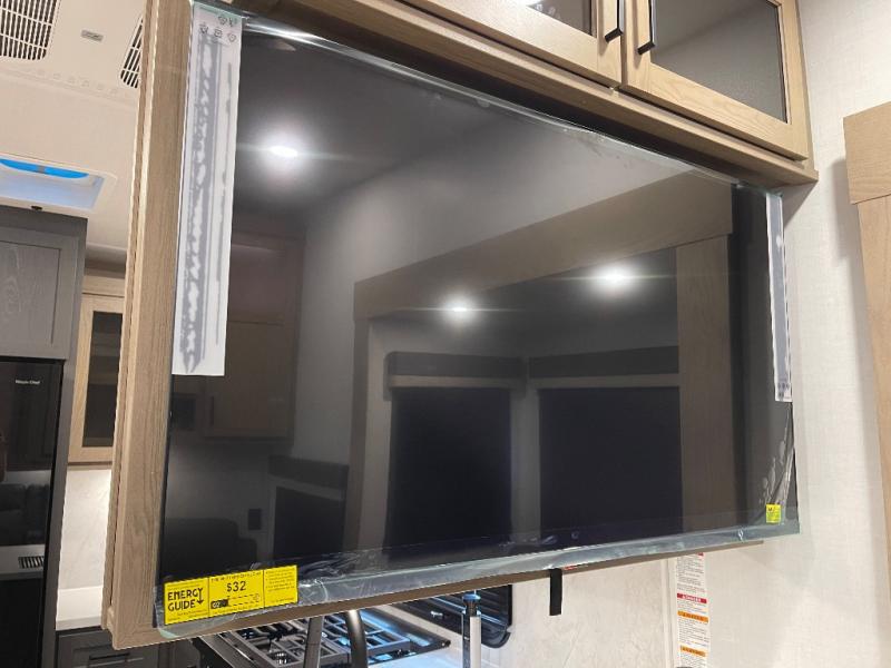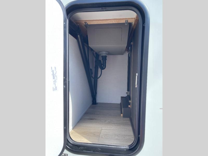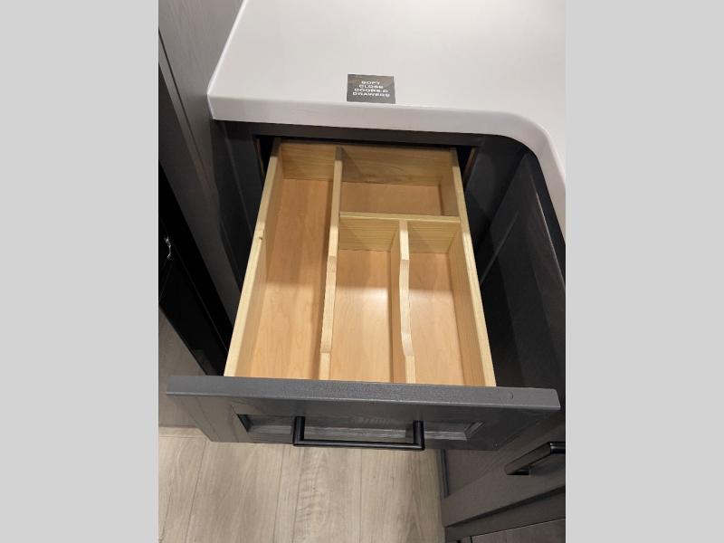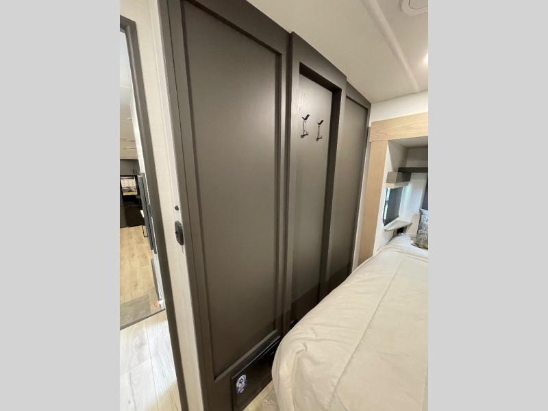 This rear kitchen fifth wheel is the perfect coach for a couple, or one that likes to entertain overnight guests. With two hide-a-bed sofas, one 60" and the other 68", you will have plenty of room for taking along extra family or friends on your adventures. The kitchen is tucked in the back and features a u-shaped counter area, and there is a table, chairs & bench within the slide that houses the 68" HAB sofa. You could also choose the optional theater seating in place of this hide-a-bed if you don't need the extra sleeping space. There is also a 60" theater seat for movie night opposite the TV/fireplace. Head up the steps to your private front bedroom with slide out queen bed, dresser, and large wardrobe with washer and dryer prep. The bathroom is at the top of the steps up and includes a large shower, linen cabinet and sink, plus a toilet. This unit also features ample storage on the outside as well as on the interior.