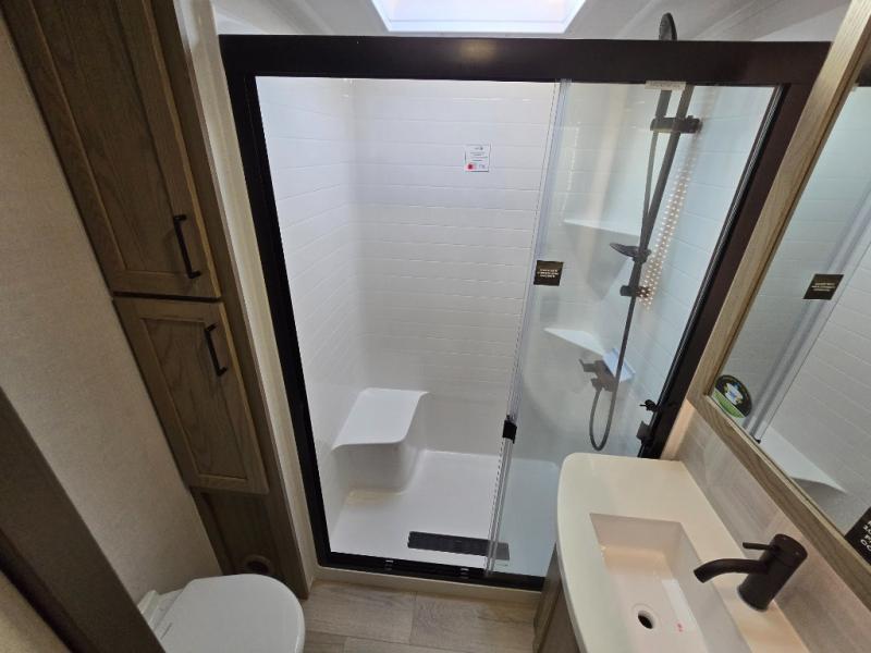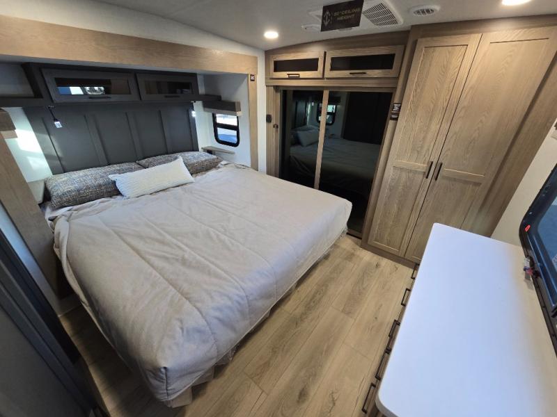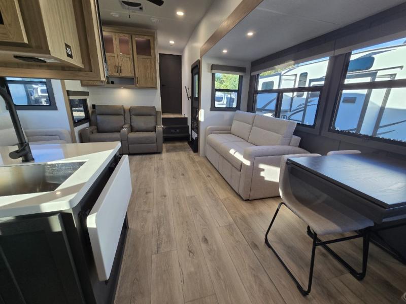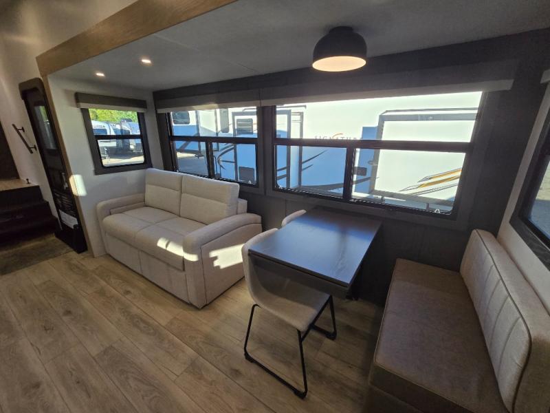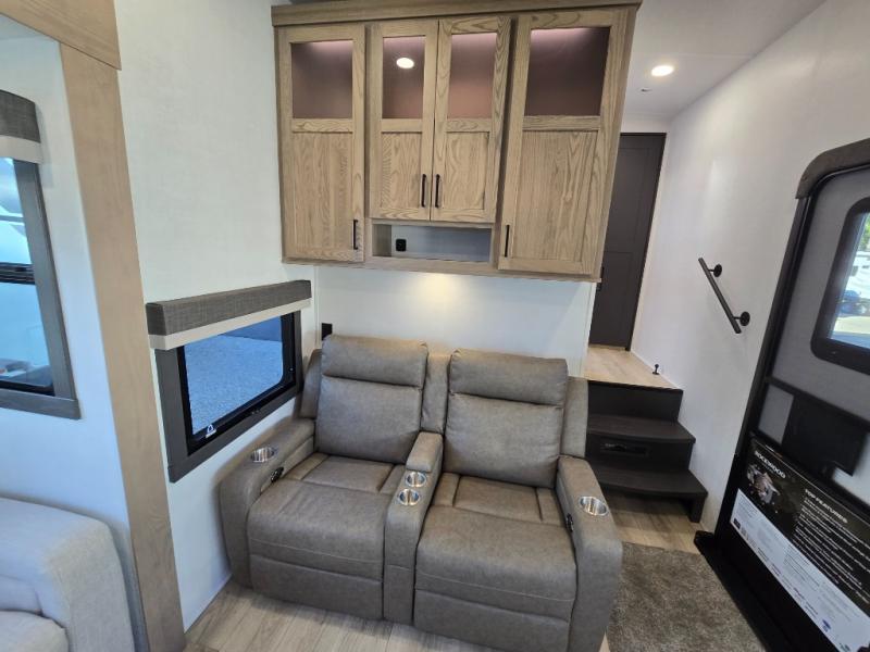 This rear kitchen fifth wheel is the perfect coach for a couple, or one that likes to entertain overnight guests. With two hide-a-bed sofas, one 60" and the other 68", you will have plenty of room for taking along extra family or friends on your adventures. The kitchen is tucked in the back and features a u-shaped counter area, and there is a table, chairs & bench within the slide that houses the 68" HAB sofa. You could also choose the optional theater seating in place of this hide-a-bed if you don't need the extra sleeping space. There is also a 60" theater seat for movie night opposite the TV/fireplace. Head up the steps to your private front bedroom with slide out queen bed, dresser, and large wardrobe with washer and dryer prep. The bathroom is at the top of the steps up and includes a large shower, linen cabinet and sink, plus a toilet. This unit also features ample storage on the outside as well as on the interior.