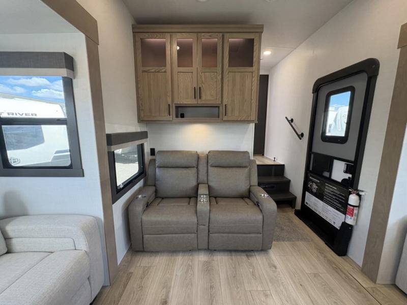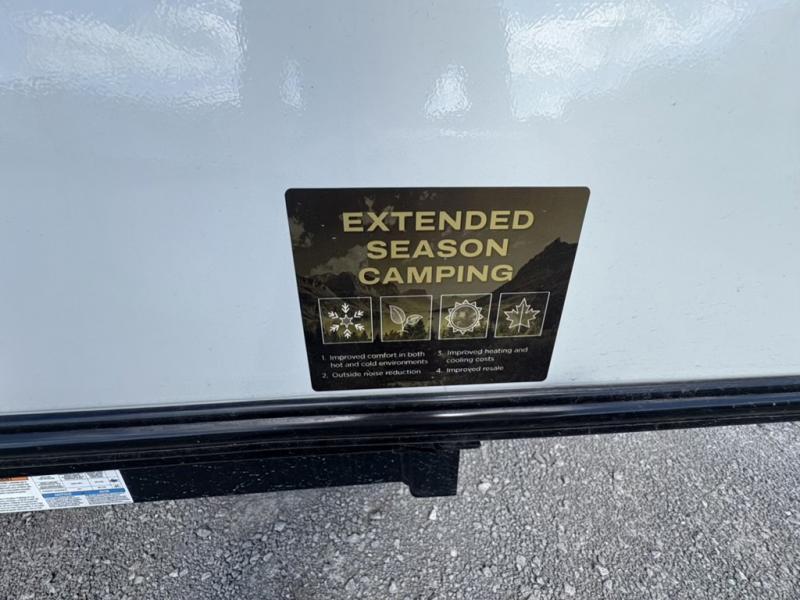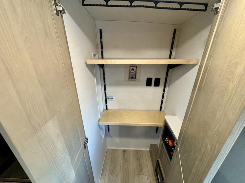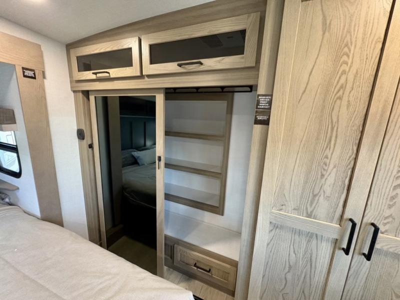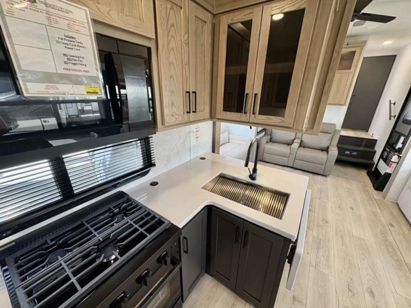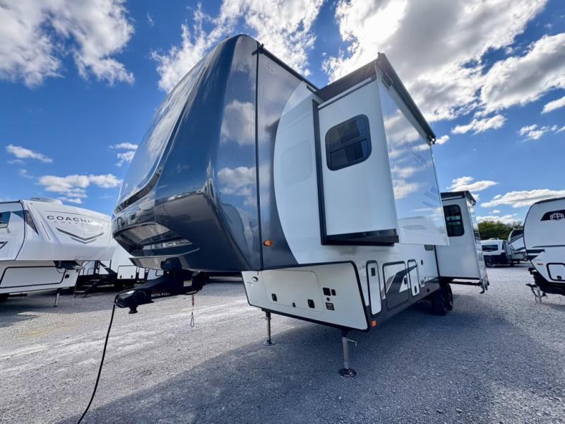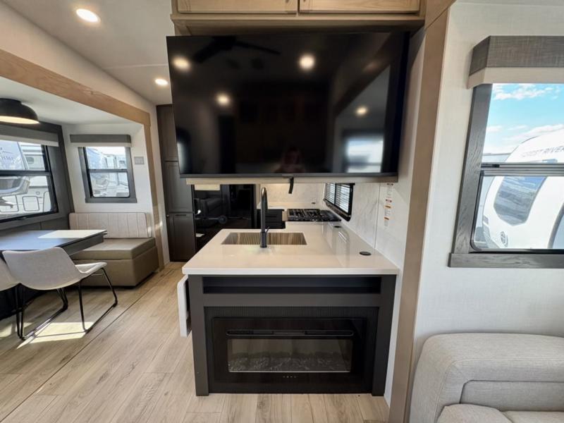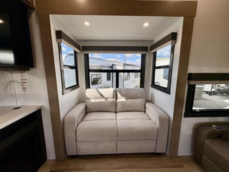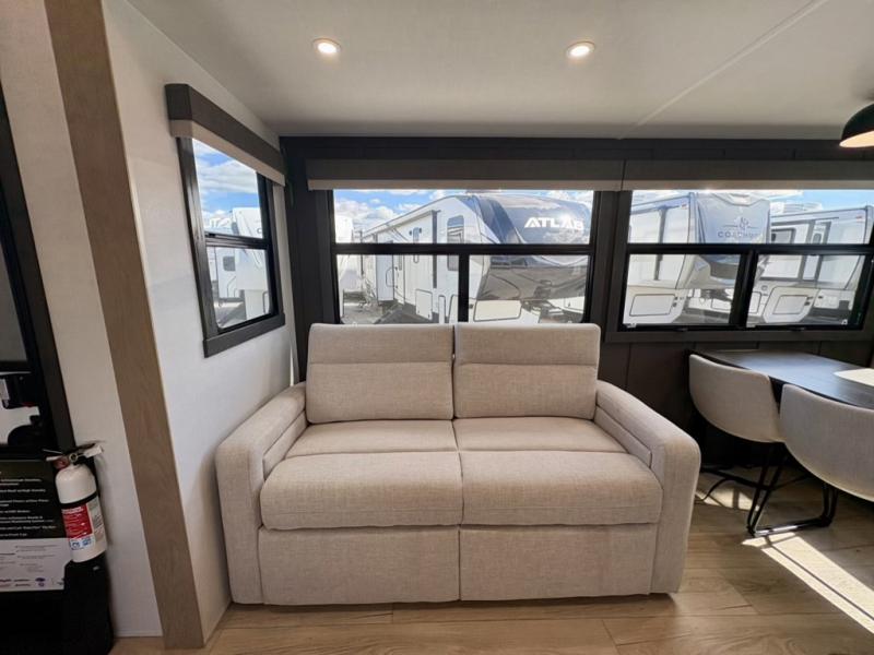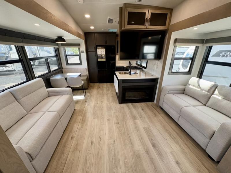 This rear kitchen fifth wheel is the perfect coach for a couple, or one that likes to entertain overnight guests. With two hide-a-bed sofas, one 60" and the other 68", you will have plenty of room for taking along extra family or friends on your adventures. The kitchen is tucked in the back and features a u-shaped counter area, and there is a table, chairs & bench within the slide that houses the 68" HAB sofa. You could also choose the optional theater seating in place of this hide-a-bed if you don't need the extra sleeping space. There is also a 60" theater seat for movie night opposite the TV/fireplace. Head up the steps to your private front bedroom with slide out queen bed, dresser, and large wardrobe with washer and dryer prep. The bathroom is at the top of the steps up and includes a large shower, linen cabinet and sink, plus a toilet. This unit also features ample storage on the outside as well as on the interior.