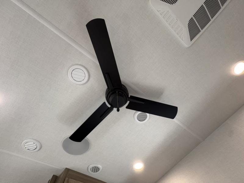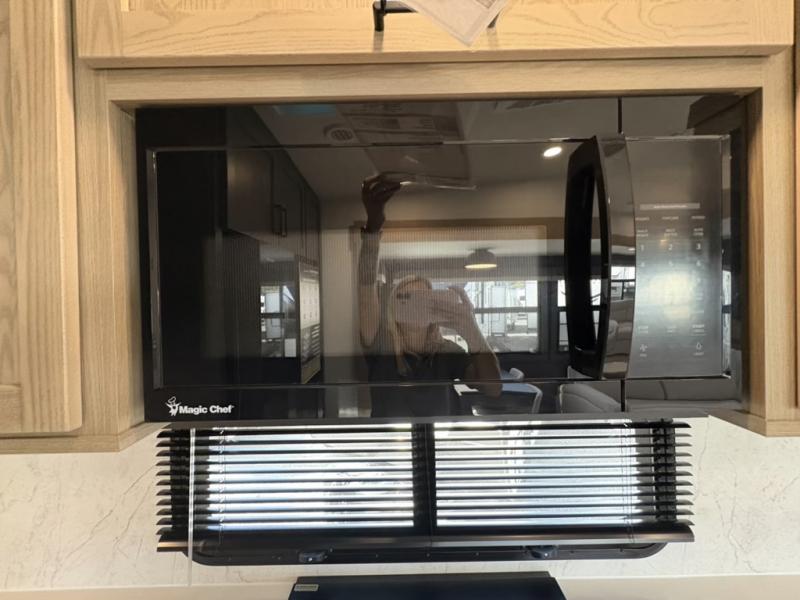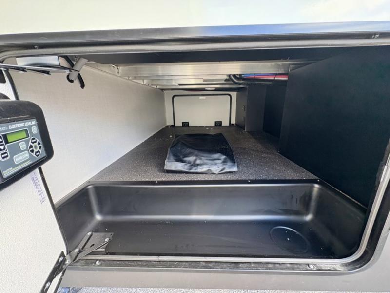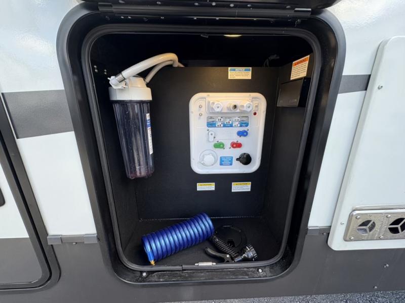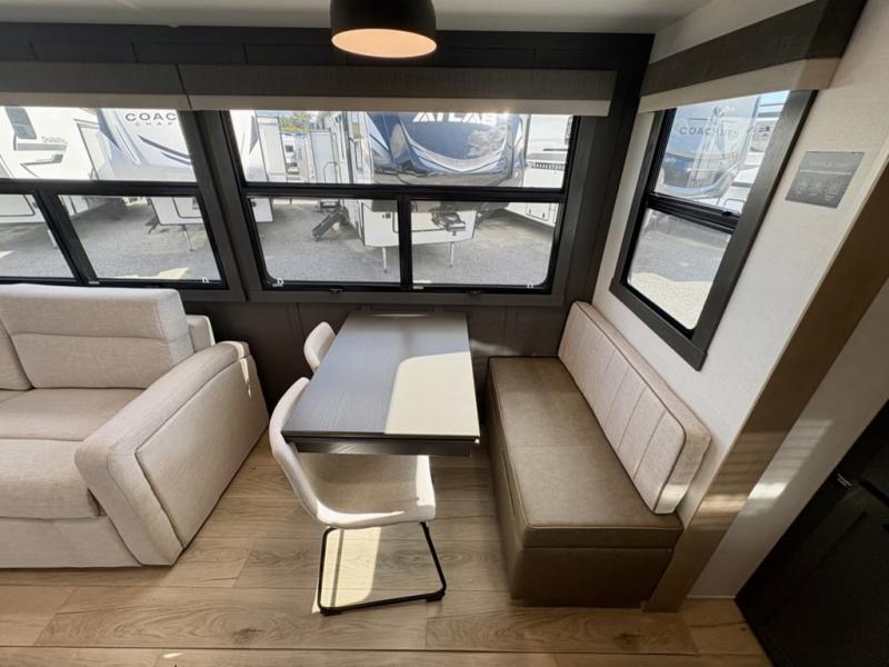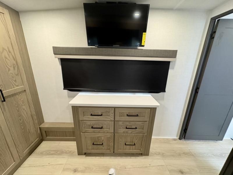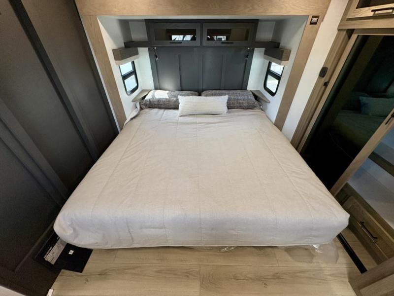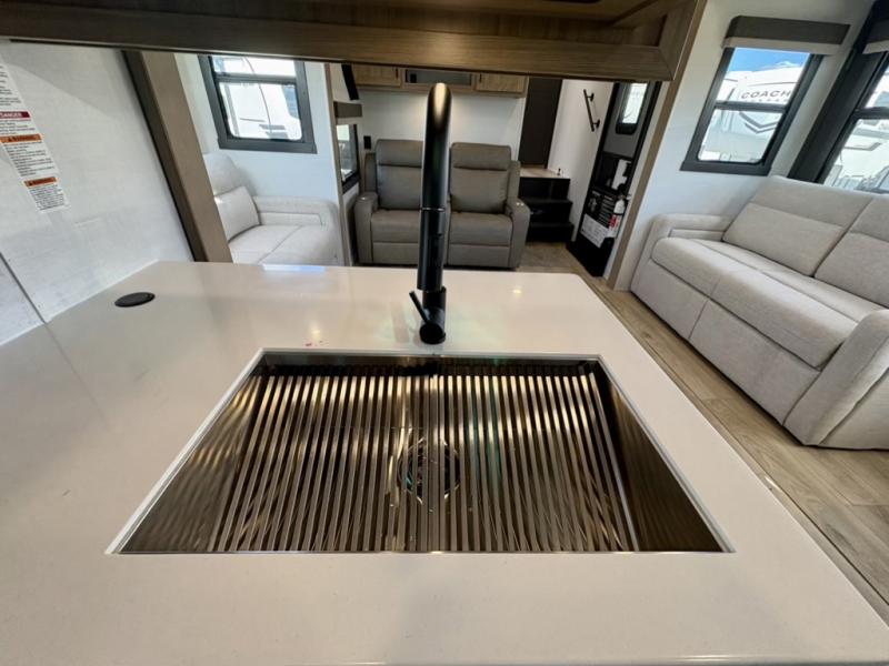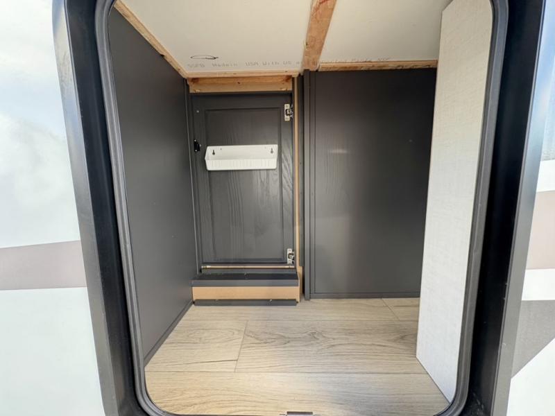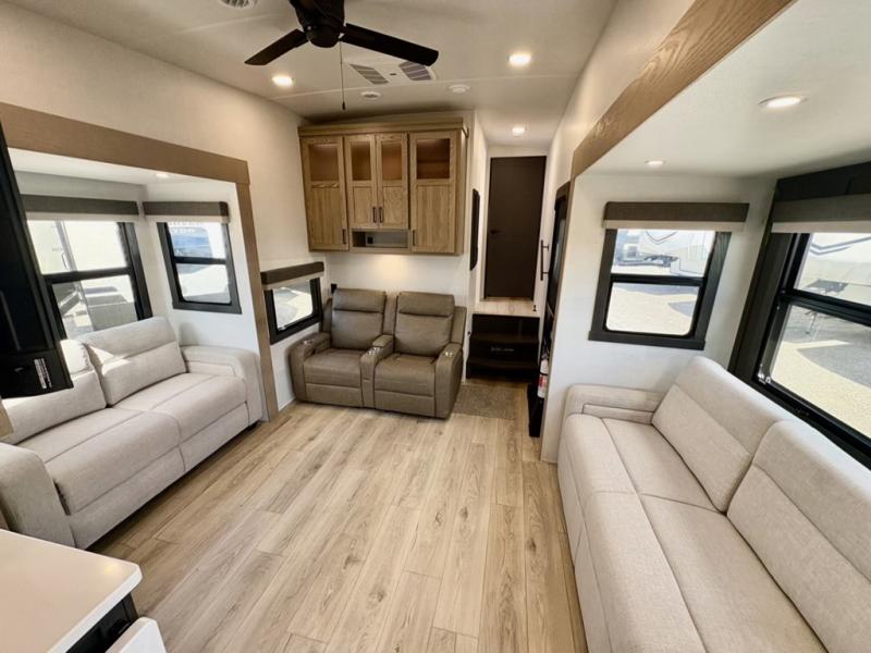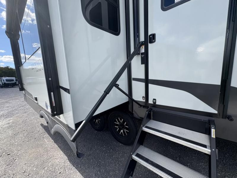 This rear kitchen fifth wheel is the perfect coach for a couple, or one that likes to entertain overnight guests. With two hide-a-bed sofas, one 60" and the other 68", you will have plenty of room for taking along extra family or friends on your adventures. The kitchen is tucked in the back and features a u-shaped counter area, and there is a table, chairs & bench within the slide that houses the 68" HAB sofa. You could also choose the optional theater seating in place of this hide-a-bed if you don't need the extra sleeping space. There is also a 60" theater seat for movie night opposite the TV/fireplace. Head up the steps to your private front bedroom with slide out queen bed, dresser, and large wardrobe with washer and dryer prep. The bathroom is at the top of the steps up and includes a large shower, linen cabinet and sink, plus a toilet. This unit also features ample storage on the outside as well as on the interior.