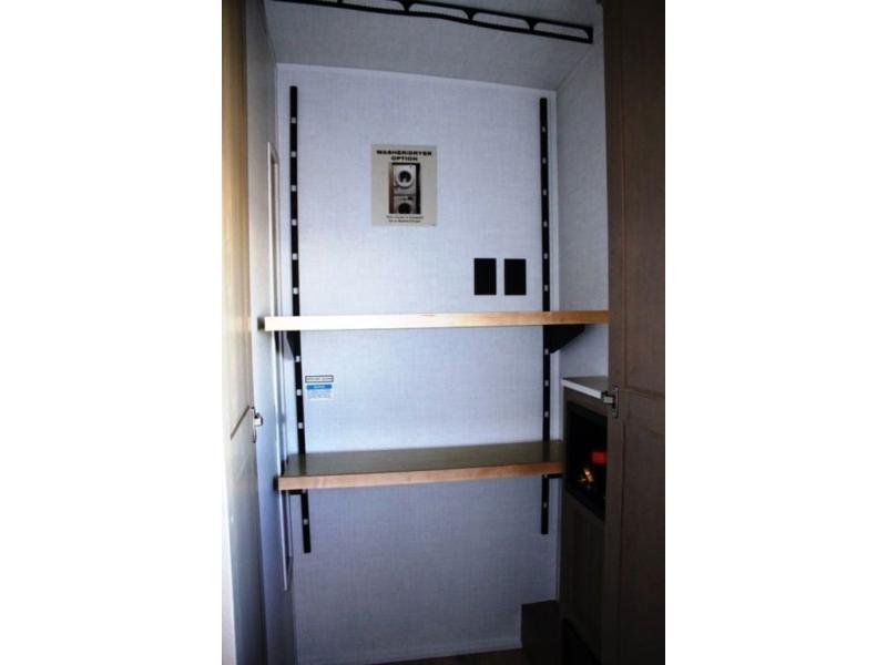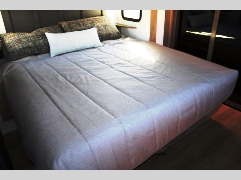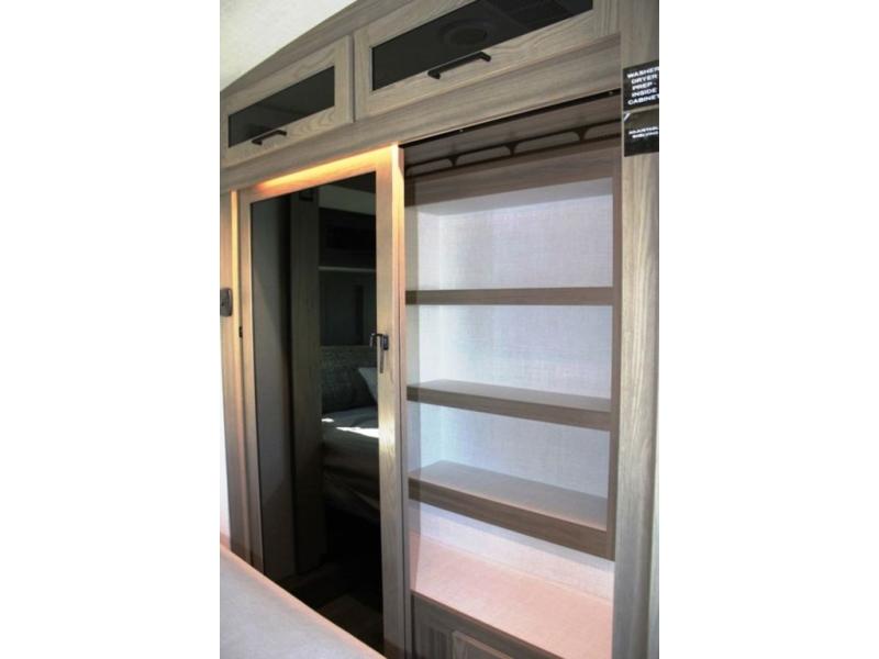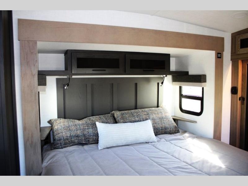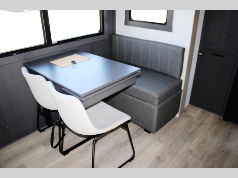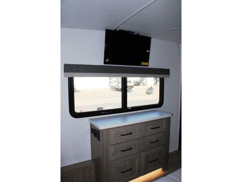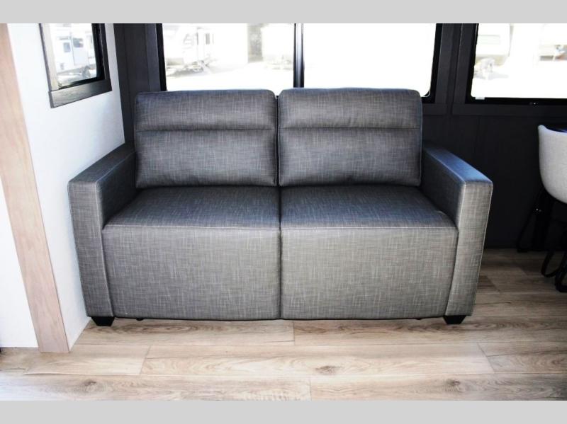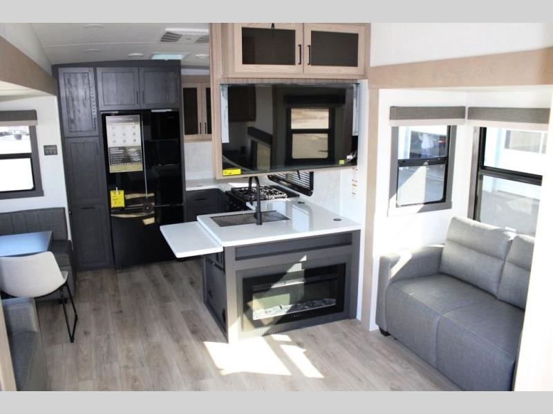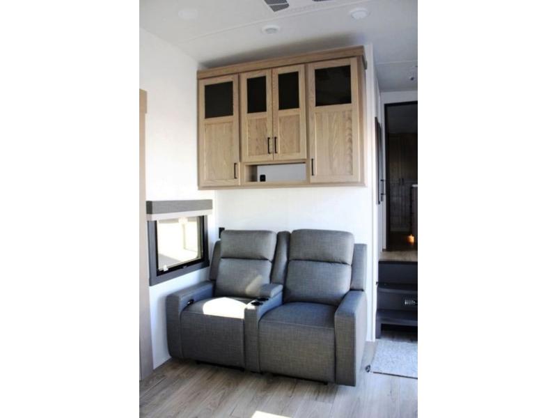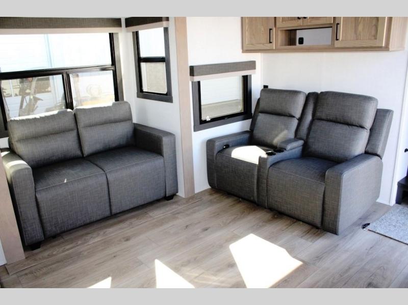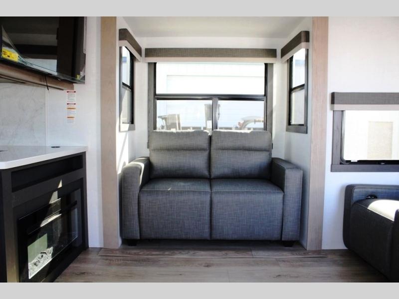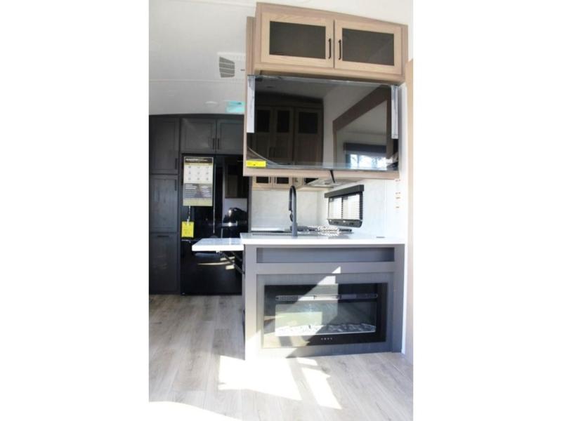 This rear kitchen fifth wheel is the perfect coach for a couple, or one that likes to entertain overnight guests. With two hide-a-bed sofas, one 60" and the other 68", you will have plenty of room for taking along extra family or friends on your adventures. The kitchen is tucked in the back and features a u-shaped counter area, and there is a table, chairs & bench within the slide that houses the 68" HAB sofa. You could also choose the optional theater seating in place of this hide-a-bed if you don't need the extra sleeping space. There is also a 60" theater seat for movie night opposite the TV/fireplace. Head up the steps to your private front bedroom with slide out queen bed, dresser, and large wardrobe with washer and dryer prep. The bathroom is at the top of the steps up and includes a large shower, linen cabinet and sink, plus a toilet. This unit also features ample storage on the outside as well as on the interior.