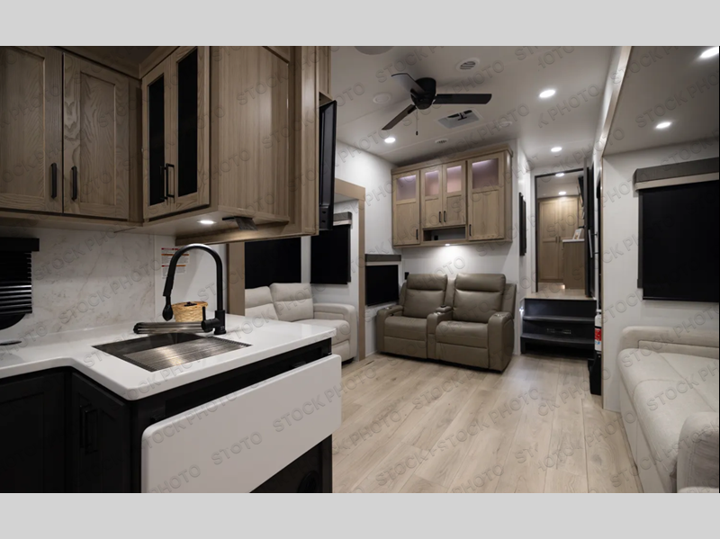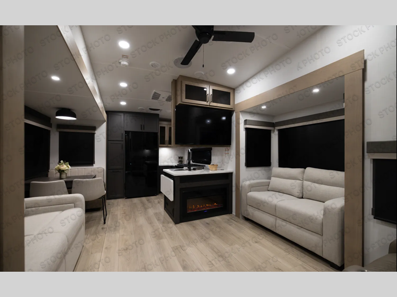 This rear kitchen fifth wheel is the perfect coach for a couple, or one that likes to entertain overnight guests. With two hide-a-bed sofas, one 60" and the other 68", you will have plenty of room for taking along extra family or friends on your adventures. The kitchen is tucked in the back and features a u-shaped counter area, and there is a table, chairs & bench within the slide that houses the 68" HAB sofa. You could also choose the optional theater seating in place of this hide-a-bed if you don't need the extra sleeping space. There is also a 60" theater seat for movie night opposite the TV/fireplace. Head up the steps to your private front bedroom with slide out queen bed, dresser, and large wardrobe with washer and dryer prep. The bathroom is at the top of the steps up and includes a large shower, linen cabinet and sink, plus a toilet. This unit also features ample storage on the outside as well as on the interior.