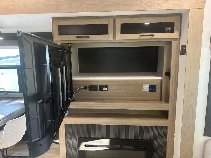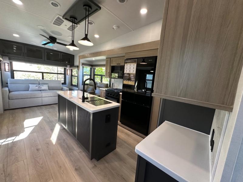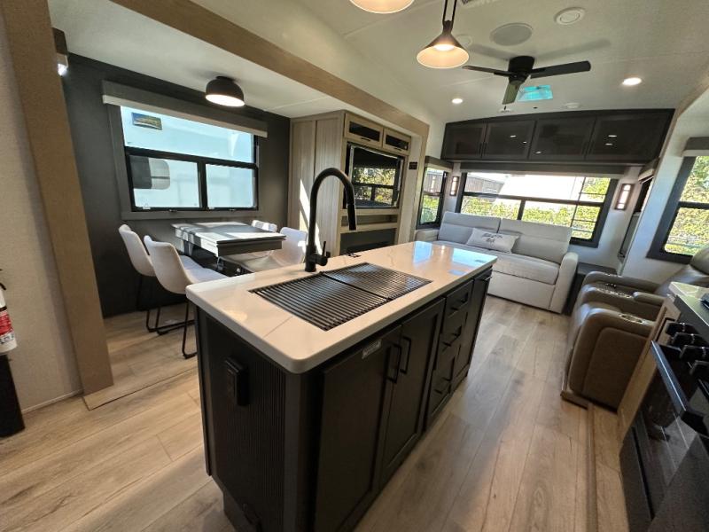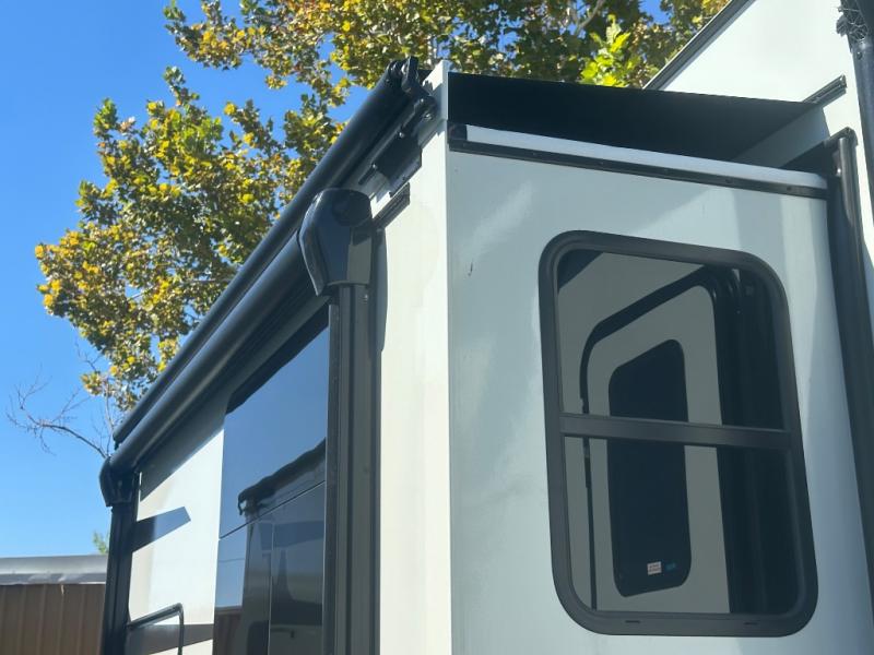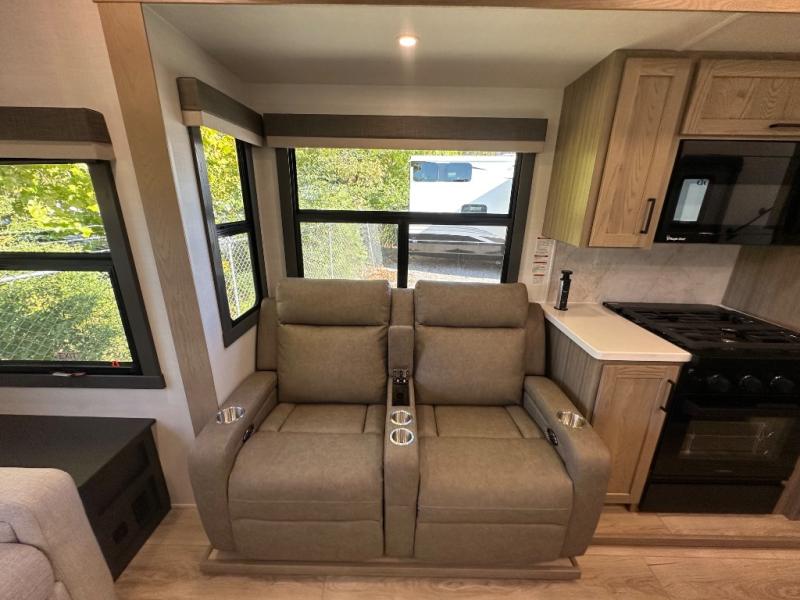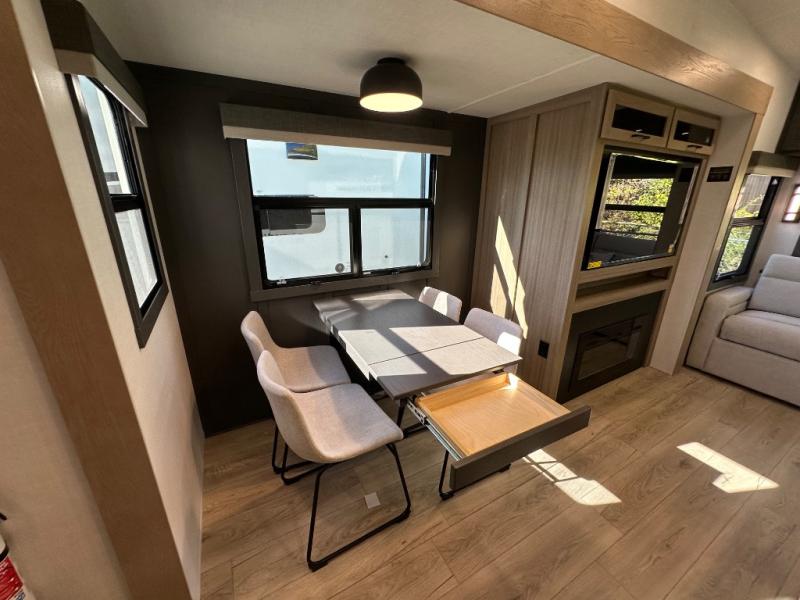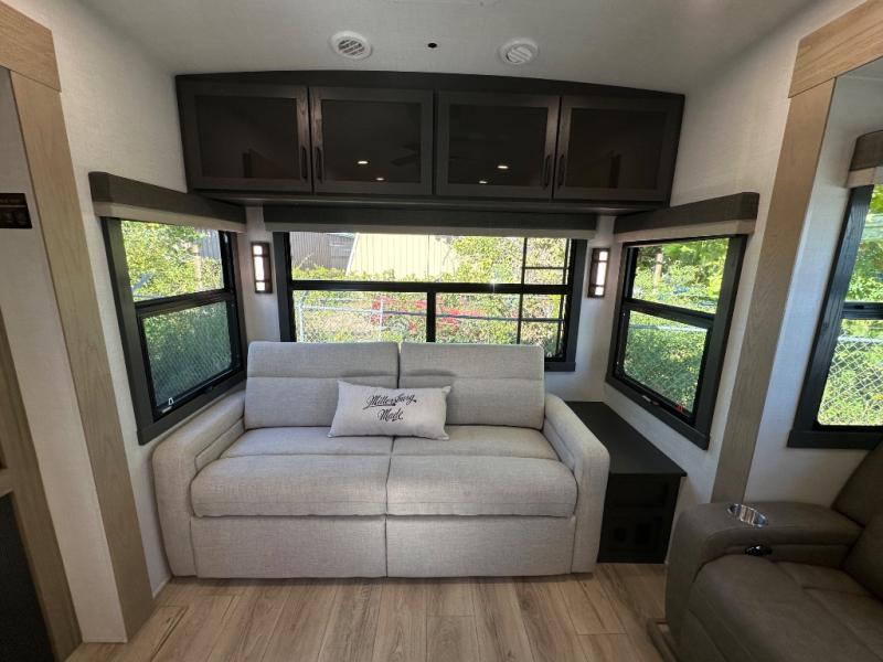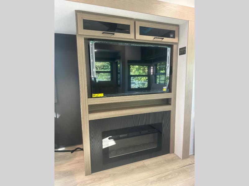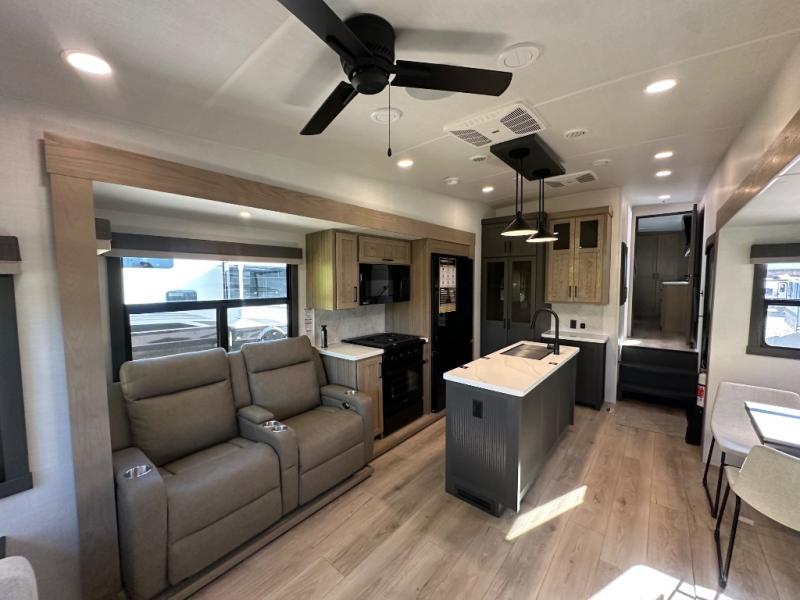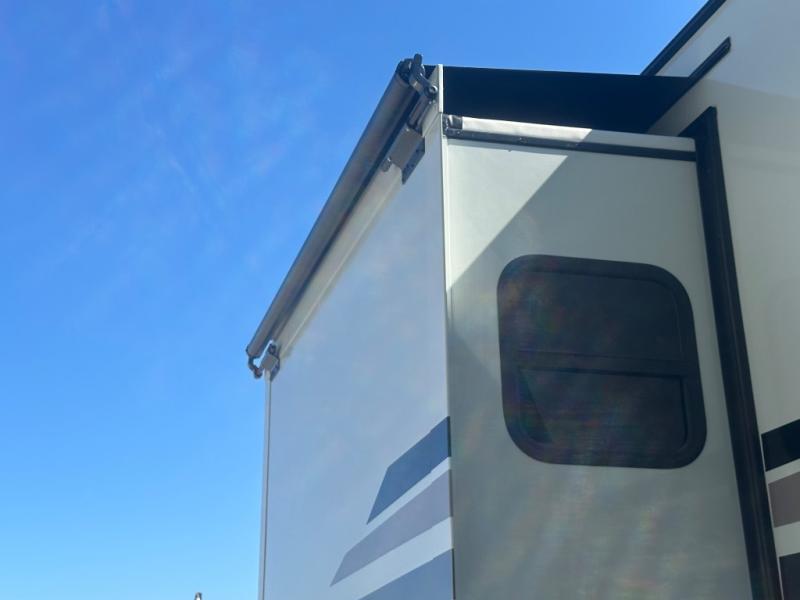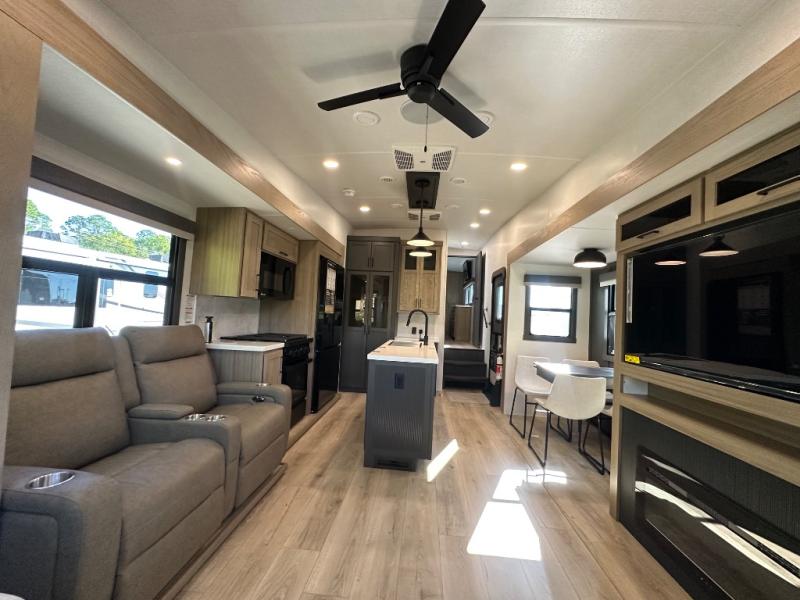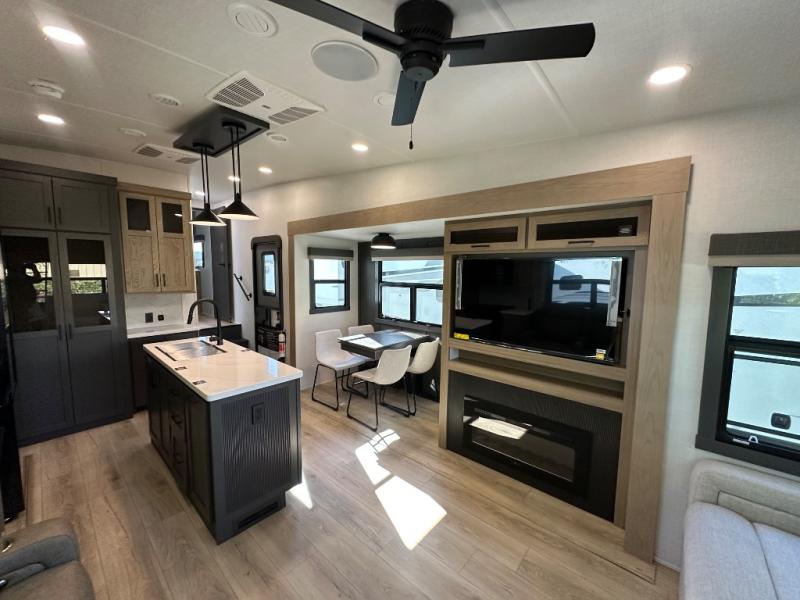 You'll be camping in style each time you take this fifth wheel out to the campground! The dual opposing slides in the main living area create an open floorplan, and the kitchen island here will provide more counter space to prep meals. You will love the theater seat directly across from the entertainment center and fireplace, and additional seating can be found on the hide-a-bed sofa or the dinette with table and chairs. The full bath includes a shower with a seat, plus a Maxxair ventilation fan to keep everything fresh. The front private bedroom may feel more like a resort with its king bed slide out, large wardrobe, plus a dresser to keep your clothes tidy. And did we mention this fifth wheel has two power awnings for maximum protection against the elements, and tons of exterior storage for all your gear!?
