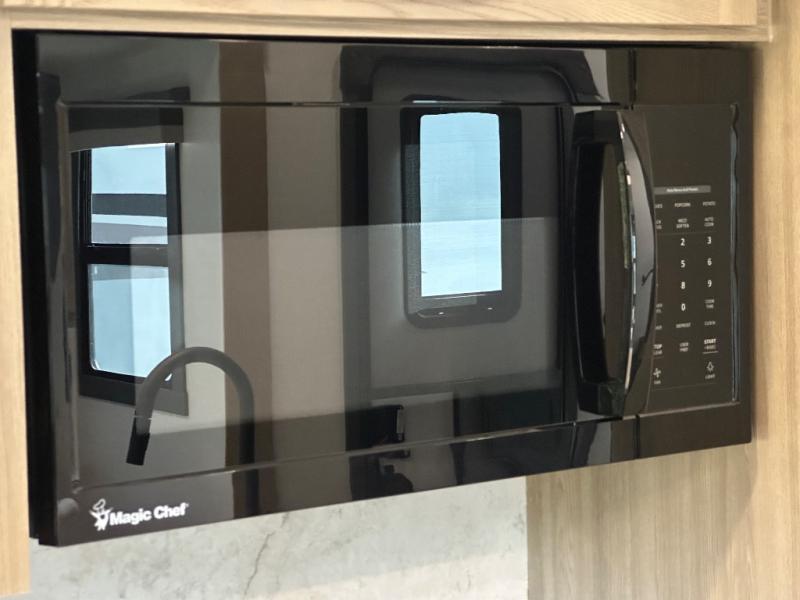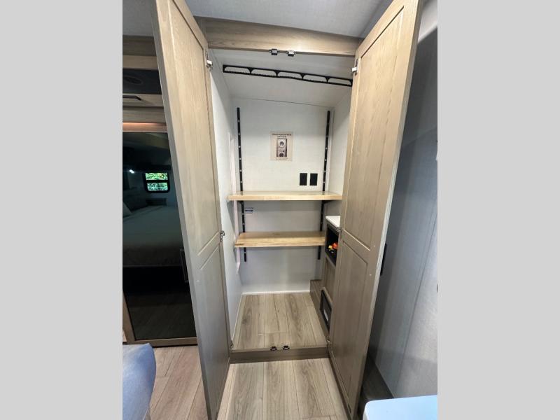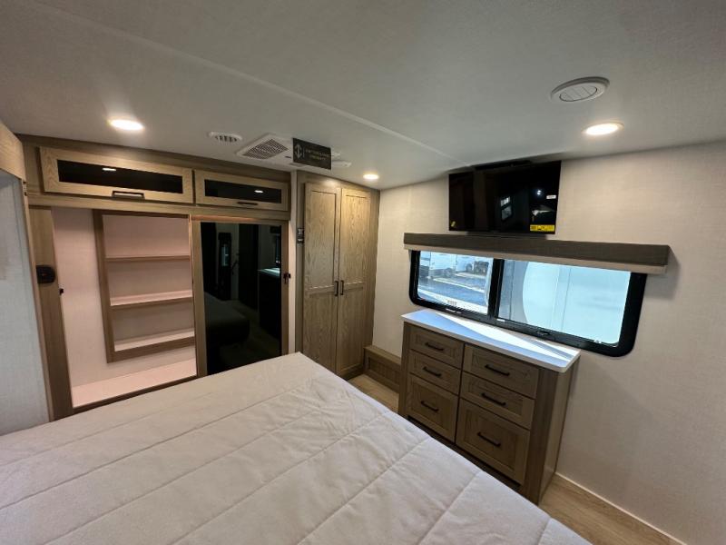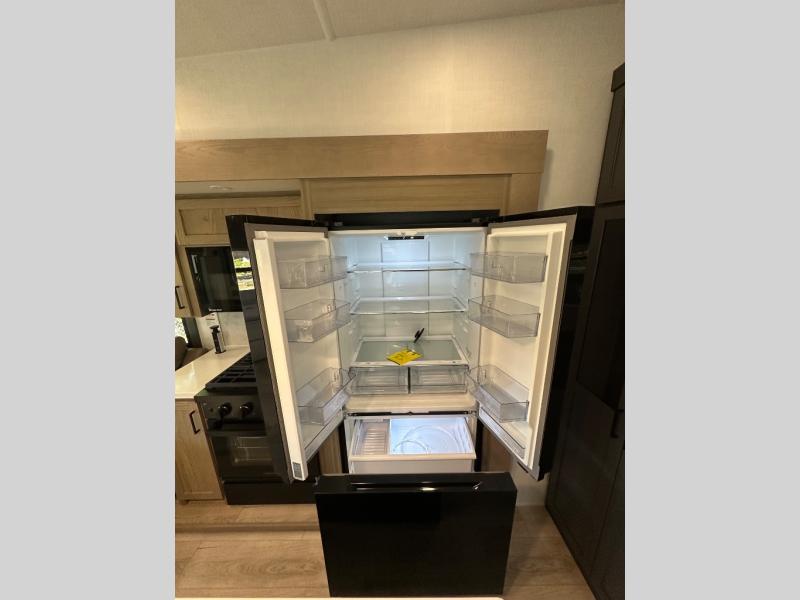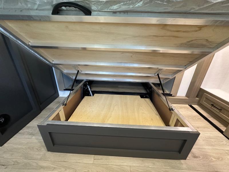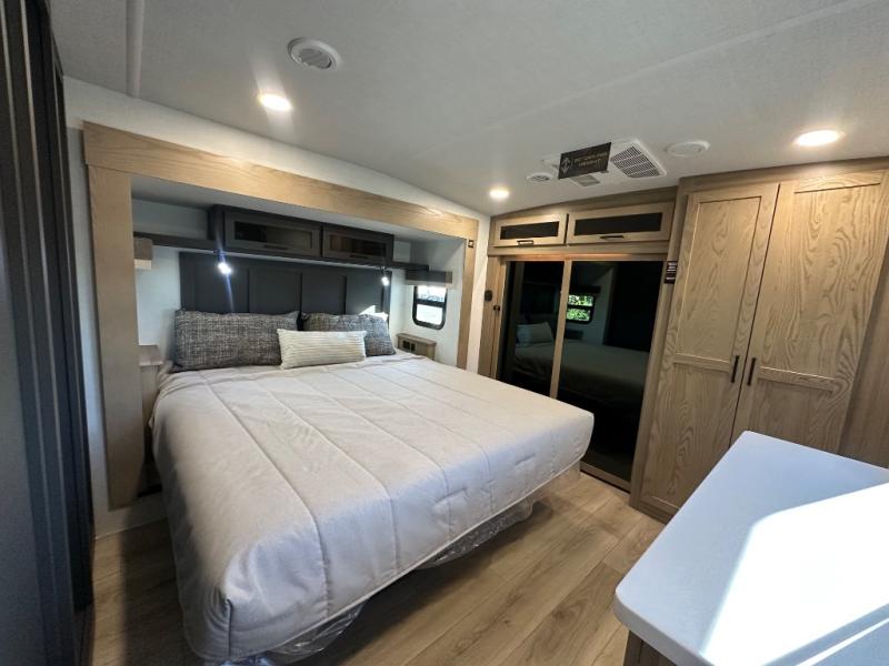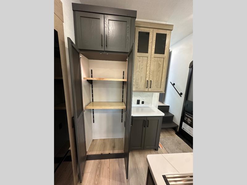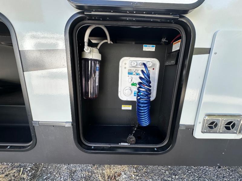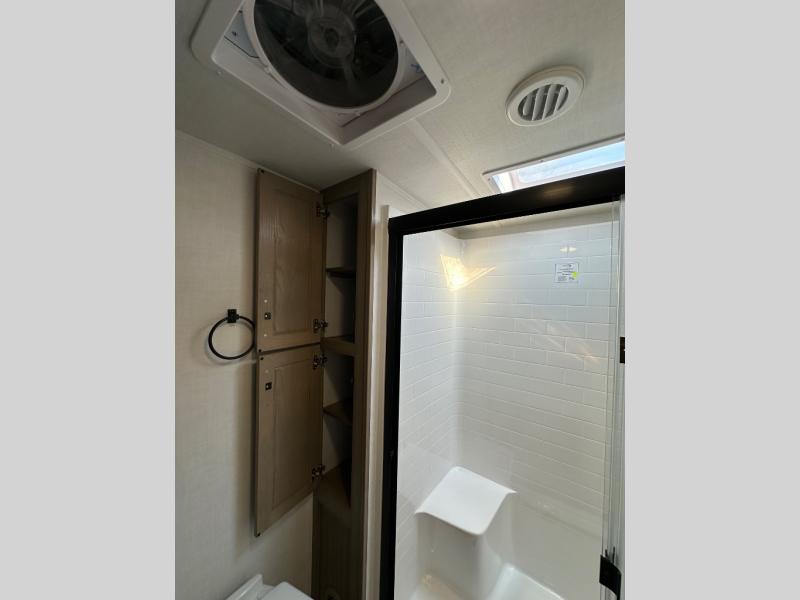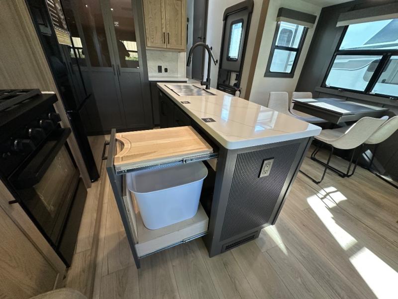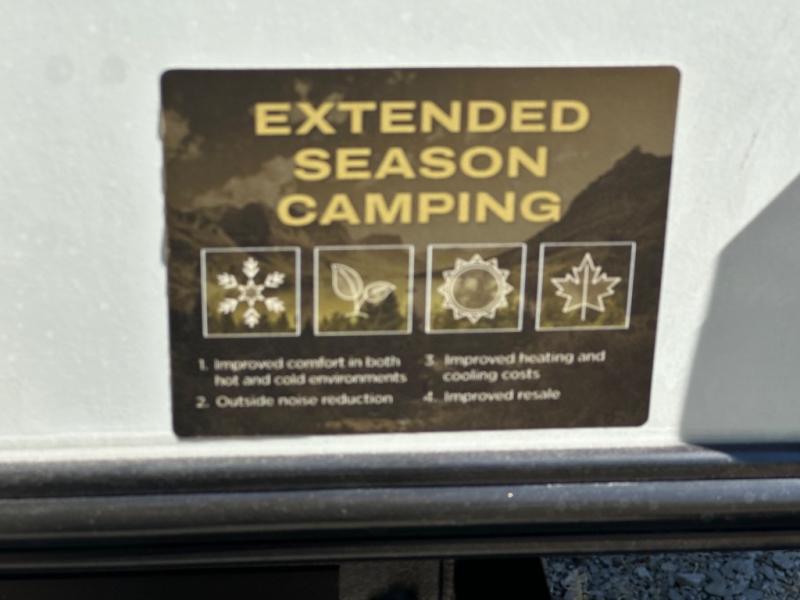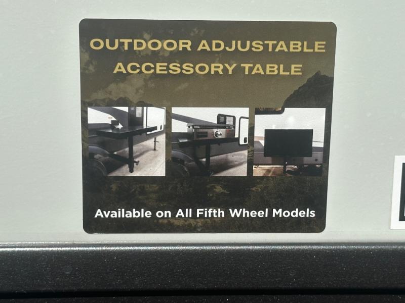 You'll be camping in style each time you take this fifth wheel out to the campground! The dual opposing slides in the main living area create an open floorplan, and the kitchen island here will provide more counter space to prep meals. You will love the theater seat directly across from the entertainment center and fireplace, and additional seating can be found on the hide-a-bed sofa or the dinette with table and chairs. The full bath includes a shower with a seat, plus a Maxxair ventilation fan to keep everything fresh. The front private bedroom may feel more like a resort with its king bed slide out, large wardrobe, plus a dresser to keep your clothes tidy. And did we mention this fifth wheel has two power awnings for maximum protection against the elements, and tons of exterior storage for all your gear!?