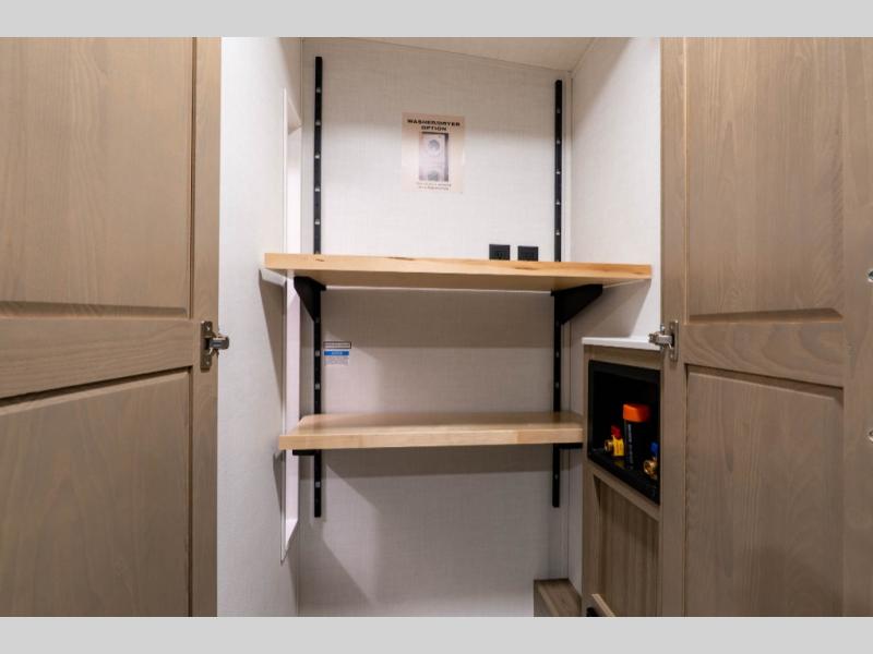 You'll be camping in style each time you take this fifth wheel out to the campground! The dual opposing slides in the main living area create an open floorplan, and the kitchen island here will provide more counter space to prep meals. You will love the theater seat directly across from the entertainment center and fireplace, and additional seating can be found on the hide-a-bed sofa or the dinette with table and chairs. The full bath includes a shower with a seat, plus a Maxxair ventilation fan to keep everything fresh. The front private bedroom may feel more like a resort with its king bed slide out, large wardrobe, plus a dresser to keep your clothes tidy. And did we mention this fifth wheel has two power awnings for maximum protection against the elements, and tons of exterior storage for all your gear!?
