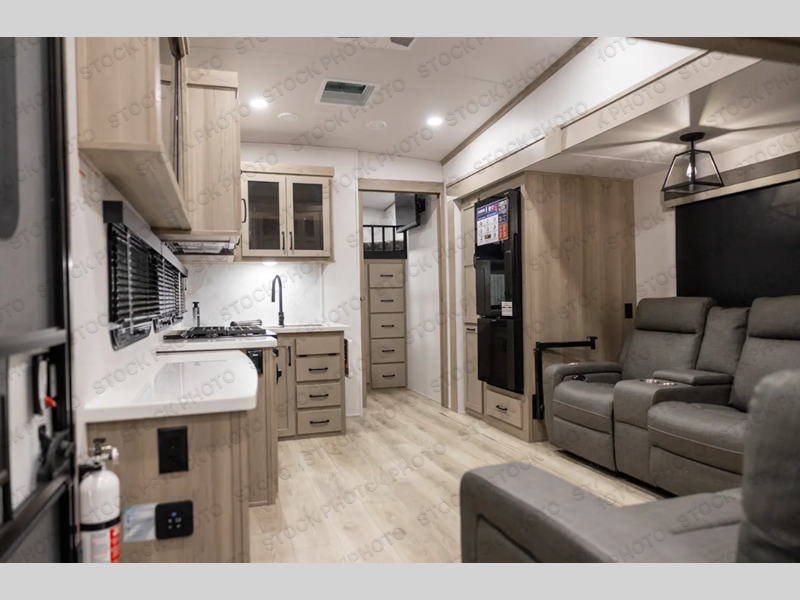 Looking to travel with your family and friends and need lots of space for everyone? This fifth wheel offers a front private bedroom with a queen bed, a spacious wardrobe, and a TV option for shows in bed. On the opposite side of the unit there is a private bunkhouse with triple bunks, plus washer and dryer prep. The main living and kitchen area includes a slide out which offers a king U-shaped dinette to dine at, play games with friends, and provides sleeping if needed, plus a 12V refrigerator and a pantry. There is also a 55" theater seat here for more comfort. The cook will have full amenities indoors plus an outside kitchen when the weather is nice. There are also two power awnings, Solid Entry steps, a rear 2" towing hitch, and more exterior conveniences!
