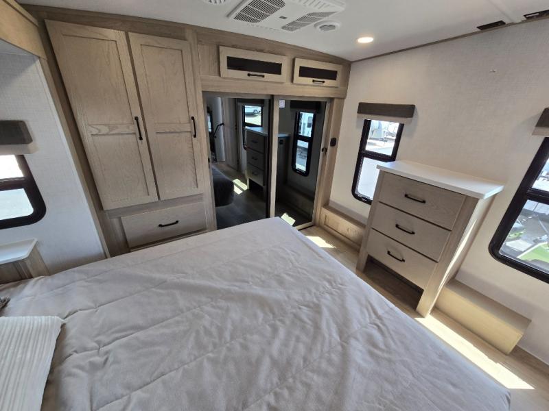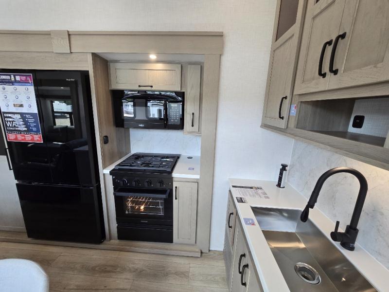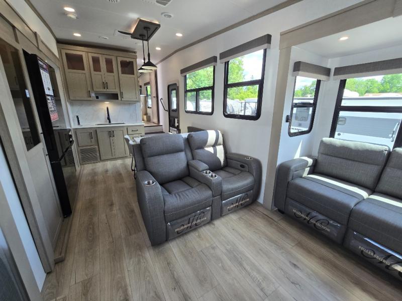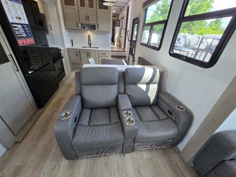 Looking for a fifth wheel to entertain other RVers while at the campgrounds? This is the one that offers seating for up to 10 between the dual opposing hide-a-bed sofa slides and the theater seating in the rear living area. There is a full wall entertainment center here, along with a Smart TV and a fireplace, plus a table with chairs and a bench in the middle kitchen. The cook will have full amenities to keep everyone fed including a 12V refrigerator and a pantry to store lots of food. The full bathroom includes linen storage and a shower with a seat, and the front bedroom offers a slide out queen bed or choose a king option, a dresser and a front wardrobe including shelves. There is even washer and dryer prep if you choose to go full-time!