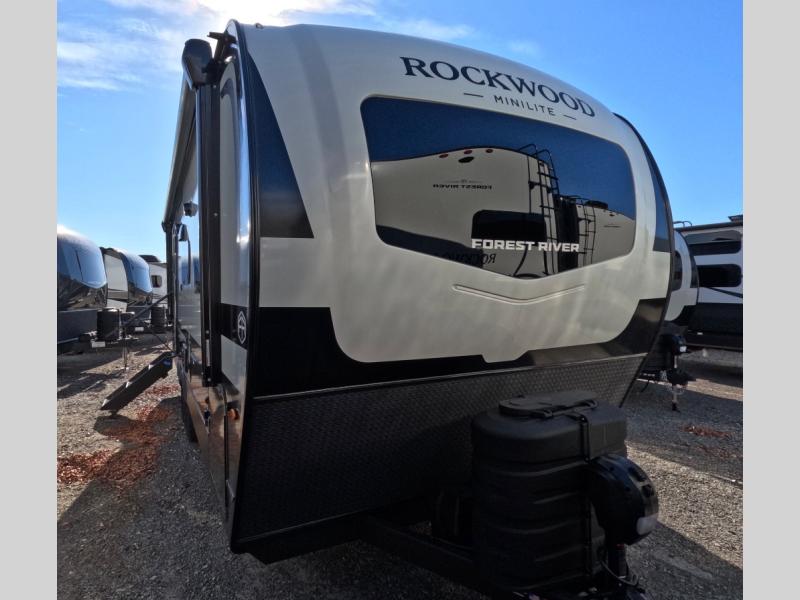 Each Rockwood Mini Lite travel trailer by Forest River is constructed with a fully laminated one-piece walkable roof, sleek frameless windows, and a six-sided full aluminum frame for strength and durability. The 12V thermostatically controlled heated tanks, plus radiant foil in the underbelly will allow you to camp well into the colder months, and the 200W roof solar panel will be perfect for a little off-gridding. Each model includes solid surface kitchen countertops, hidden hinge cabinet doors, roller shades, plus many more interior features. Having an AIR 360+ omnidirectional antenna with WiFi prep on board gives you the option to get some work done if it's needed, and the power tongue jack provides hassle-free set up, so you can enjoy more time relaxing!