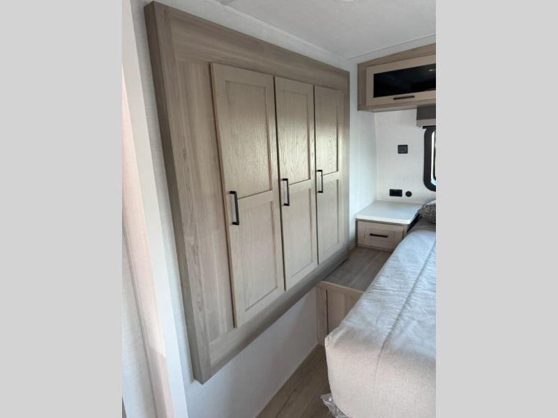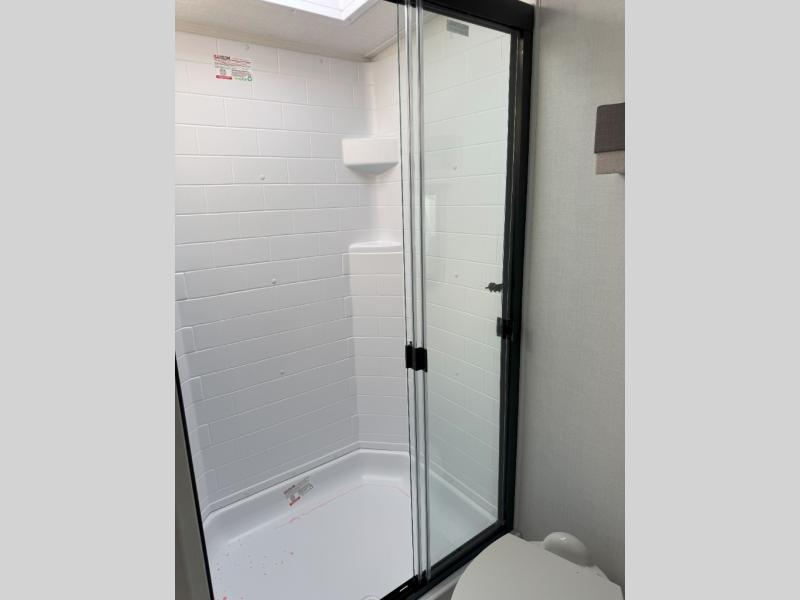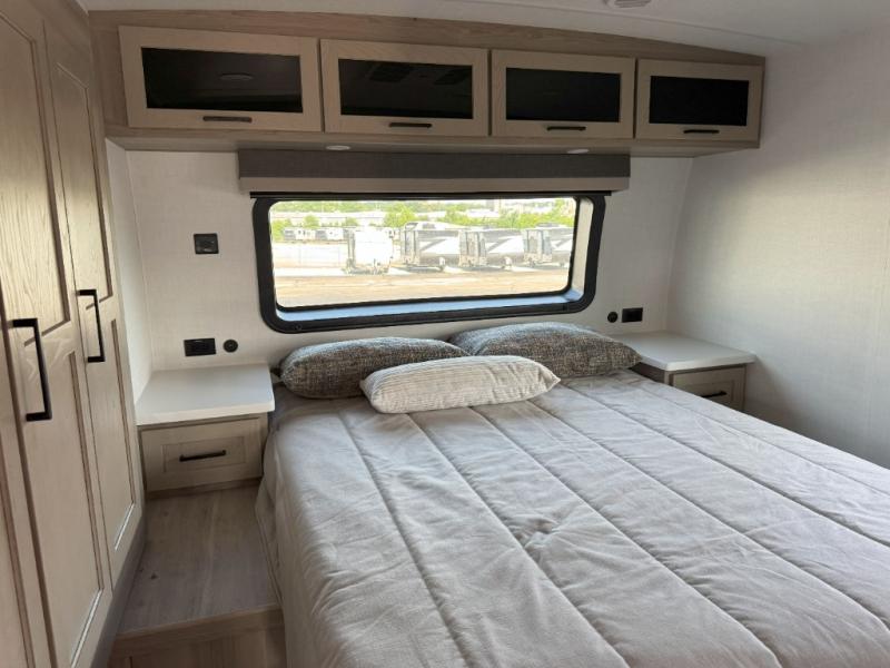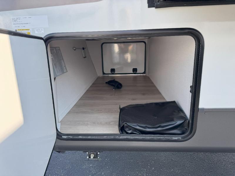 This trailer is the perfect couple's retreat with its private bedroom up front which includes a queen bed, a slide out wardrobe, and a TV option. The spacious rear full bathroom provides a shower and linen storage, and a space savings sliding door. The cook will have full amenities with ample counter space, a walk-in pantry for food storage, and a three burner range to cook meals on. If the weather is nice outside, you can make dinner on the exterior griddle, and there is a 21' awning to relax under. Or you can stay inside to enjoy the fireplace and Smart TV! You will also appreciate the pass thru storage with an optional steel sliding tray to easily access gear!