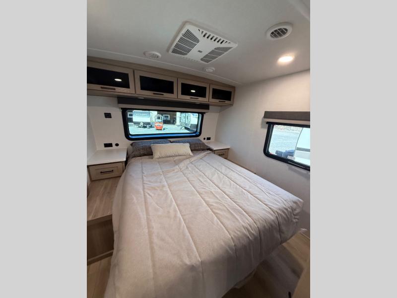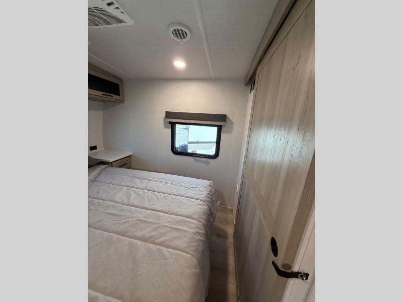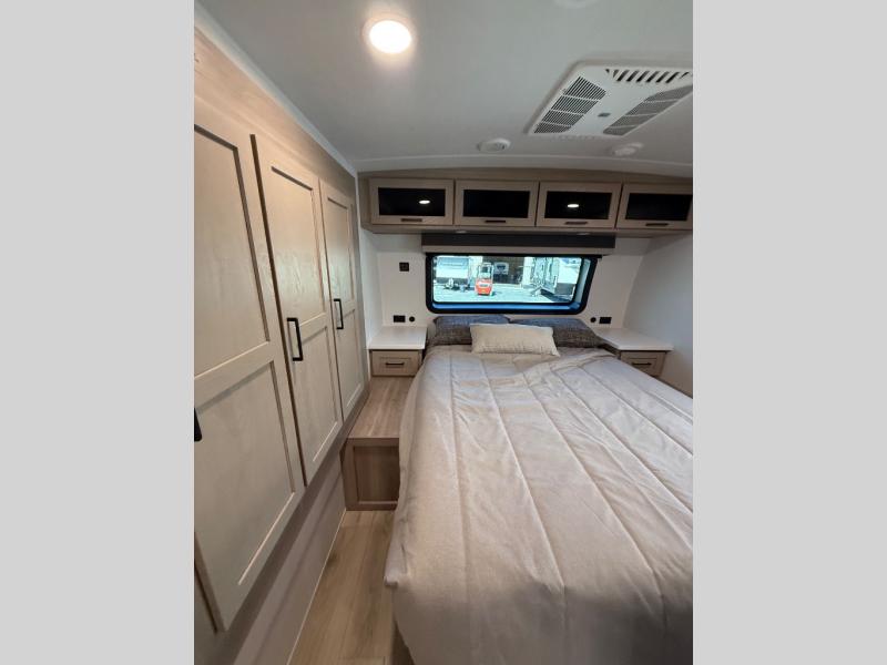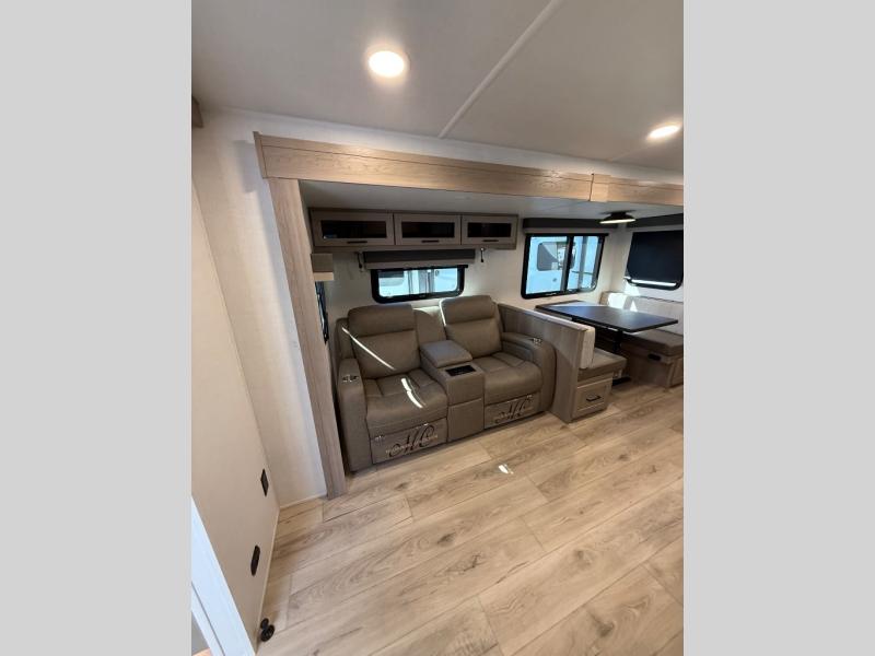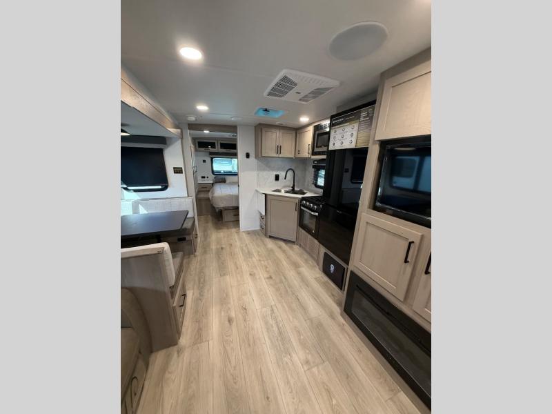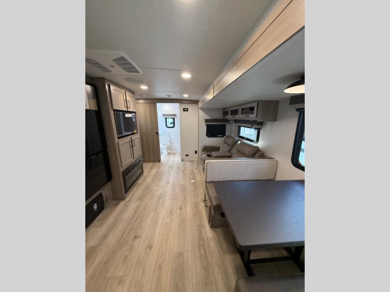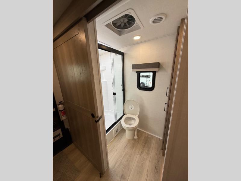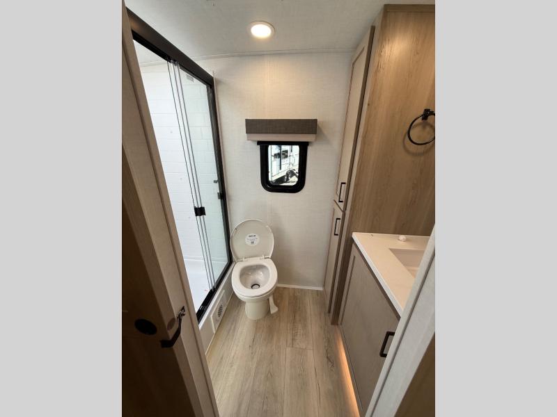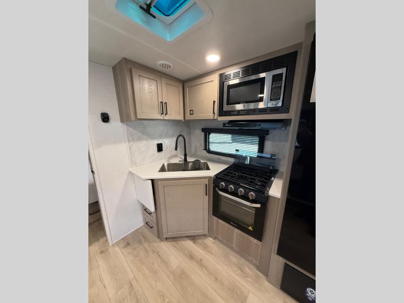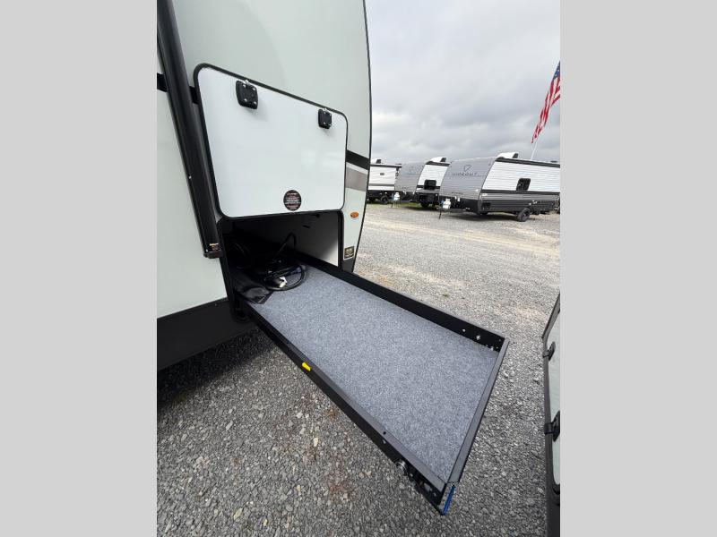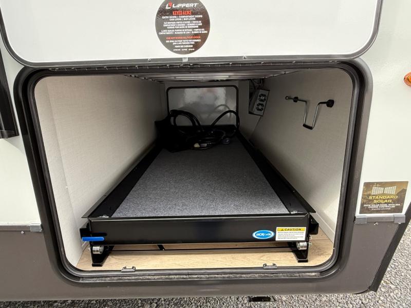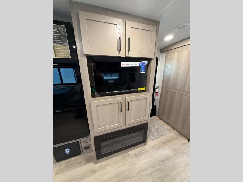 This trailer is the perfect couple's retreat with its private bedroom up front which includes a queen bed, a slide out wardrobe, and a TV option. The spacious rear full bathroom provides a shower and linen storage, and a space savings sliding door. The cook will have full amenities with ample counter space, a walk-in pantry for food storage, and a three burner range to cook meals on. If the weather is nice outside, you can make dinner on the exterior griddle, and there is a 21' awning to relax under. Or you can stay inside to enjoy the fireplace and Smart TV! You will also appreciate the pass thru storage with an optional steel sliding tray to easily access gear!