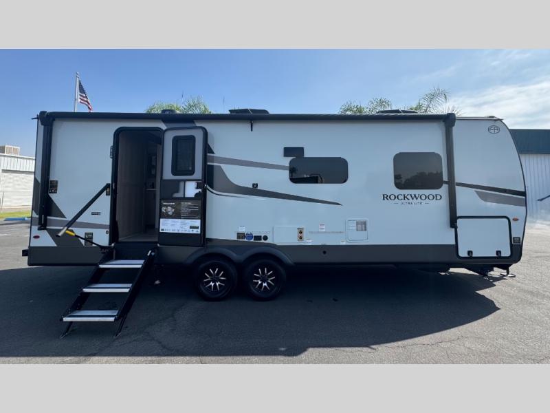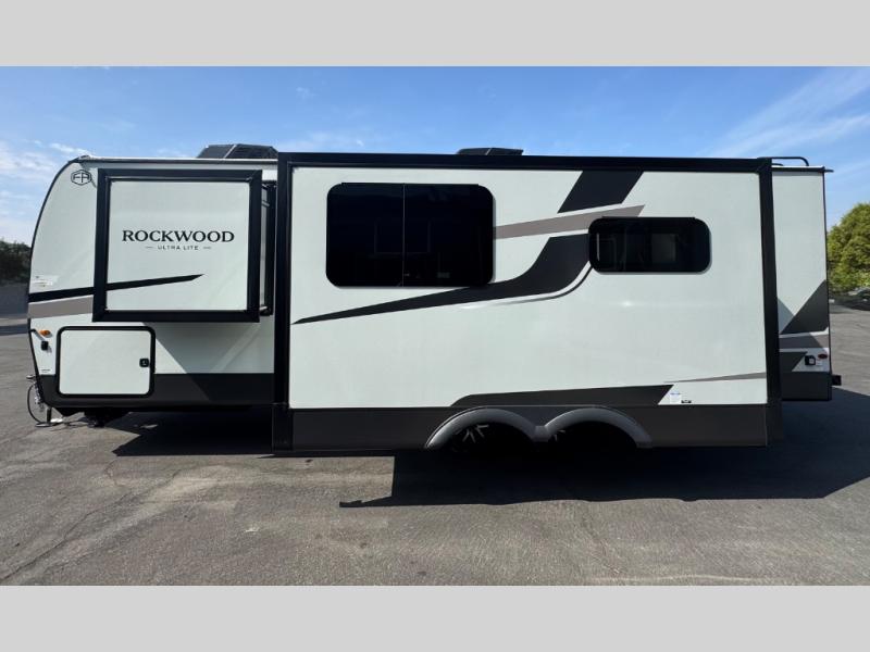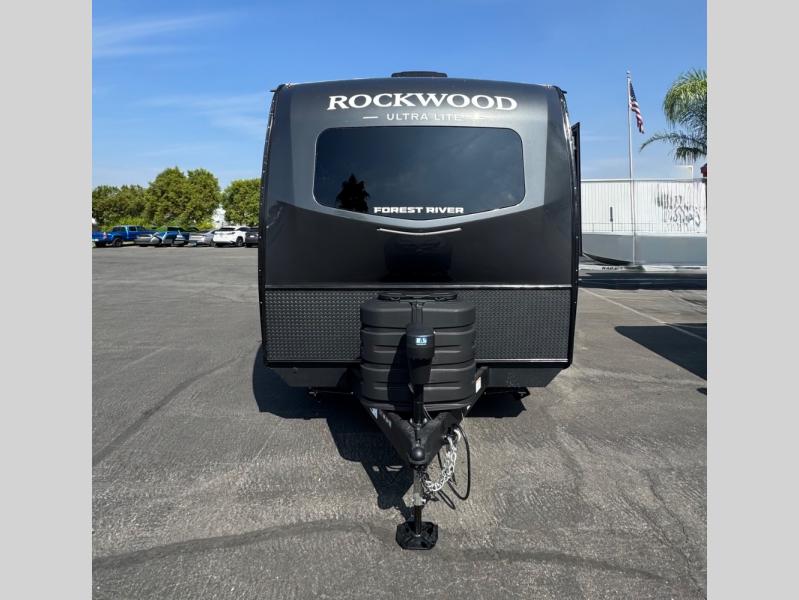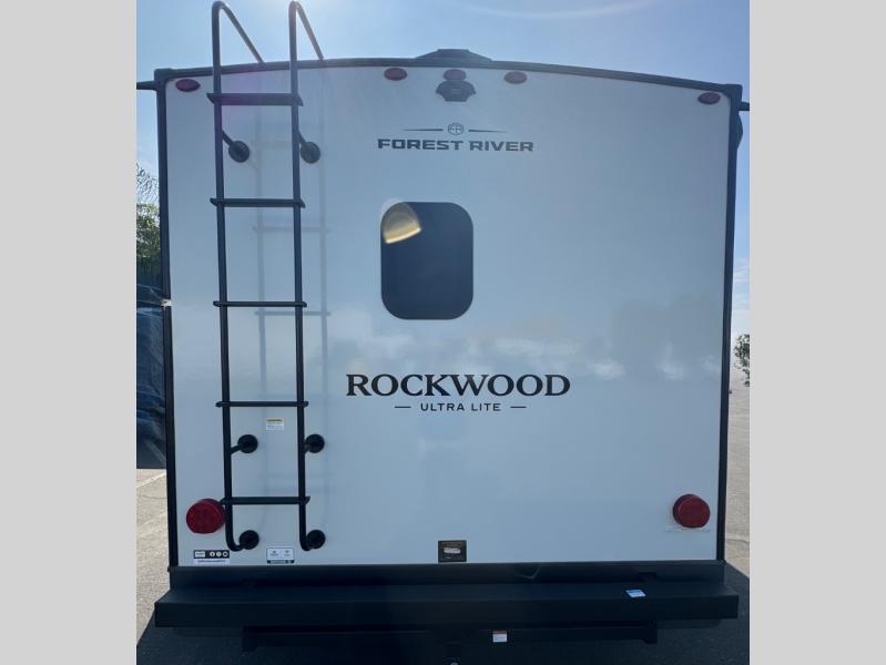 Each Rockwood Ultra Lite travel trailer by Forest River includes superior construction with a high gloss fiberglass cap, aluminum cage construction, and a power awning with LED lighting for a cozy and functional outdoor space. The torsion axle, power tongue jack will make towing smooth and hassle-free, along with the nitrogen filled, Goodyear Endurance tires and the tire pressure monitor system. Interior comforts include kitchen sink with high rise faucet, hidden hinge cabinet doors, and roller shades to name a few. Choose a Rockwood Ultra Lite travel trailer today!