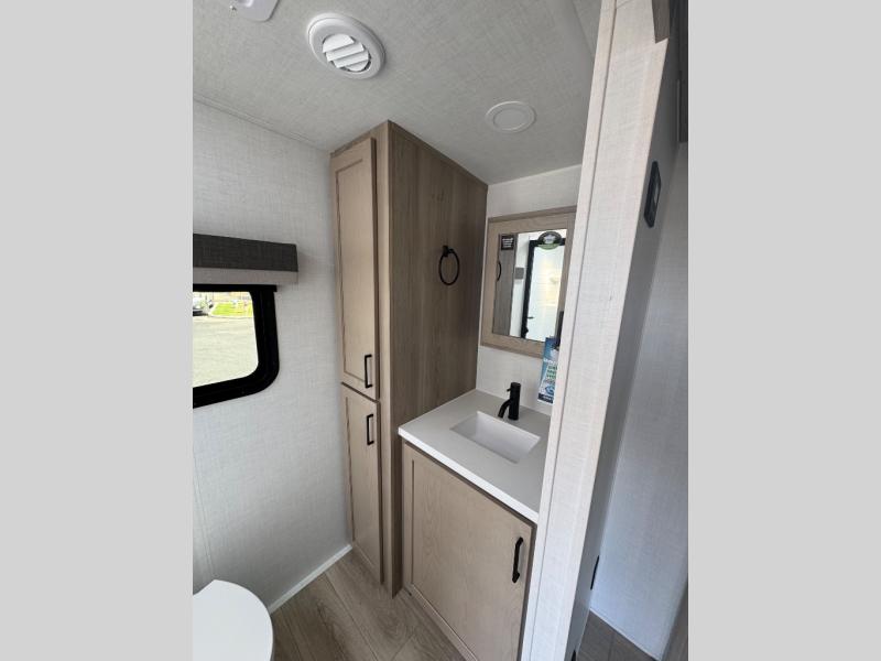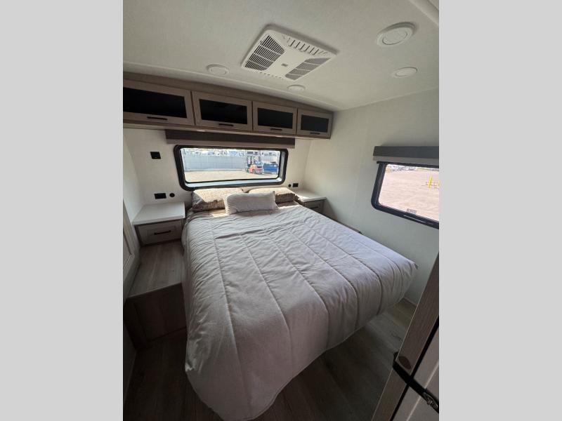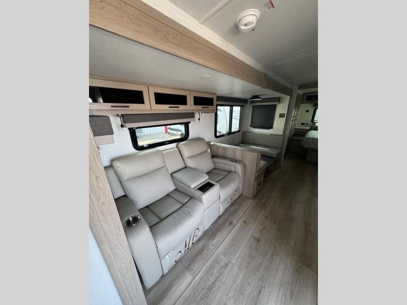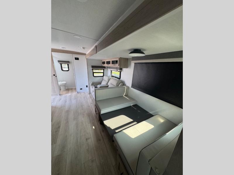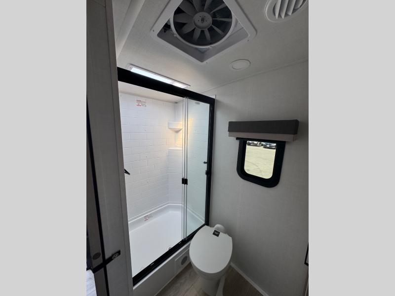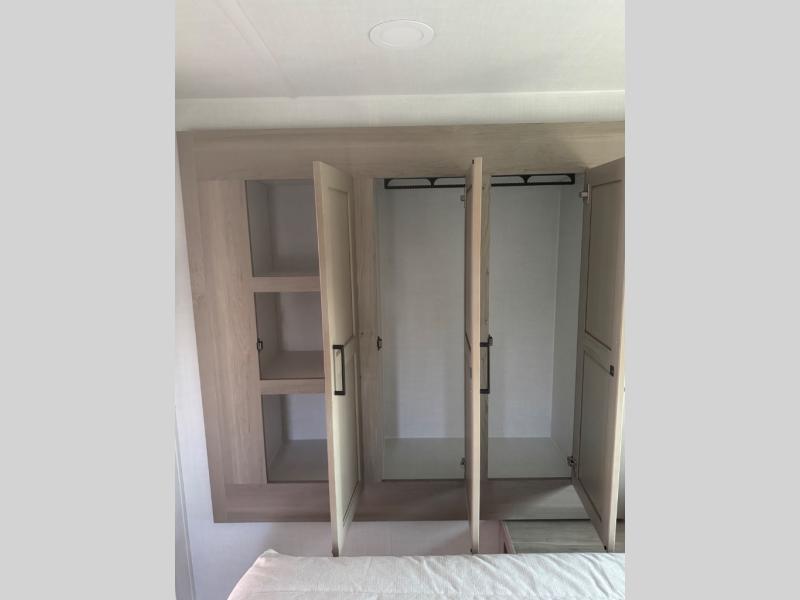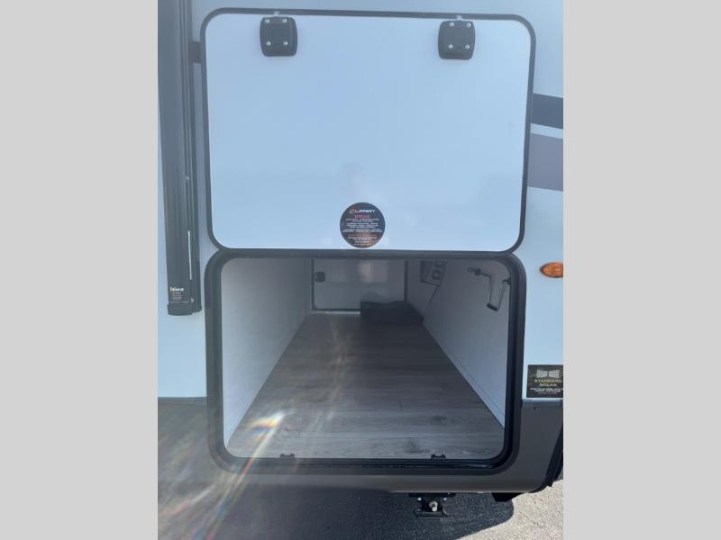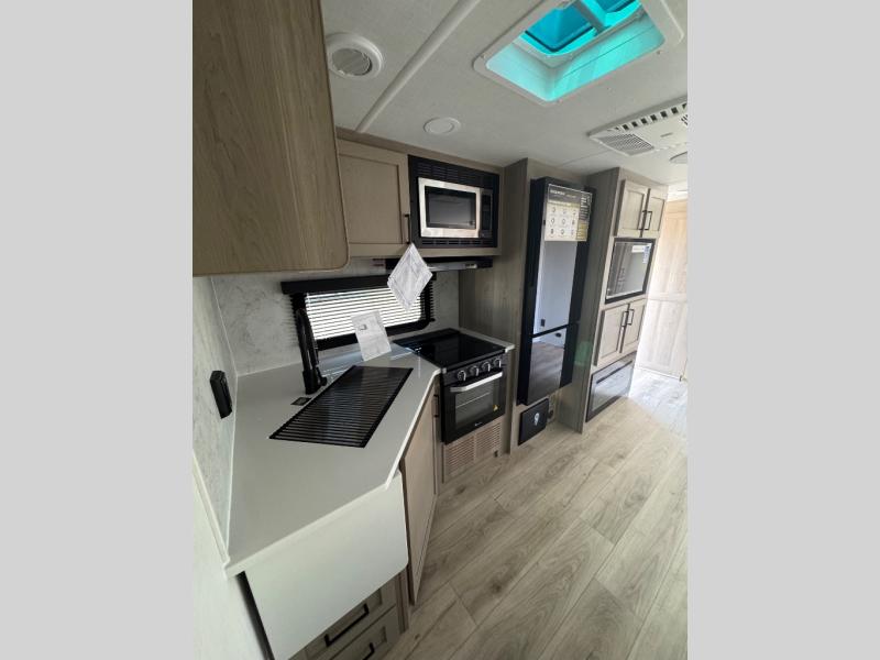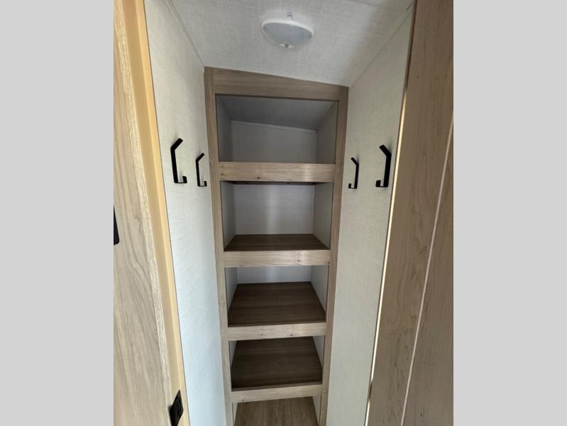 This trailer is the perfect couple's retreat with its private bedroom up front which includes a queen bed, a slide out wardrobe, and a TV option. The spacious rear full bathroom provides a shower and linen storage, and a space savings sliding door. The cook will have full amenities with ample counter space, a walk-in pantry for food storage, and a three burner range to cook meals on. If the weather is nice outside, you can turn on the outside speakers to enjoy music, and there is a 21' awning to relax under. Or you can stay inside to enjoy the fireplace and Smart TV! You will also appreciate the pass thru storage with an optional steel sliding tray to easily access gear!