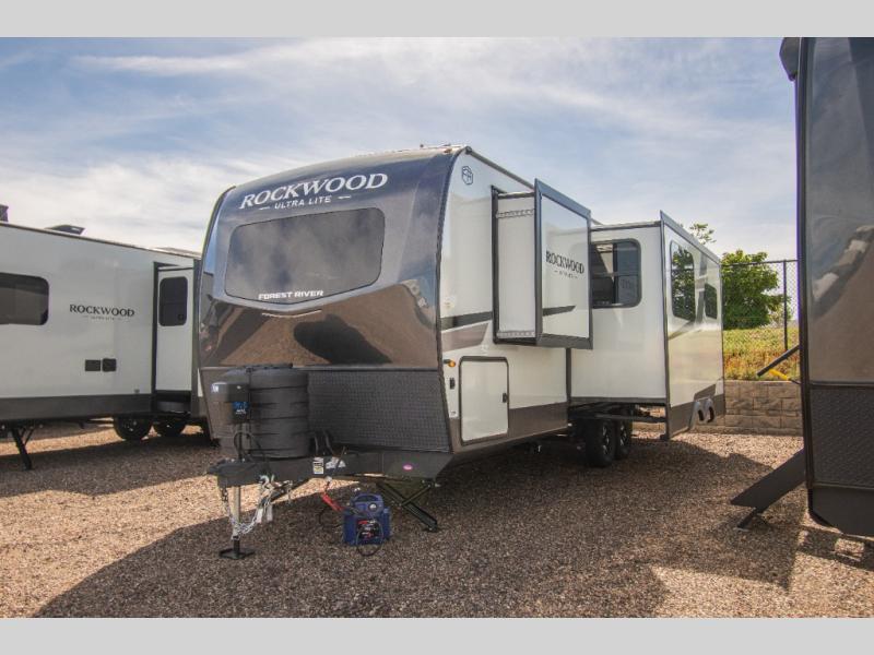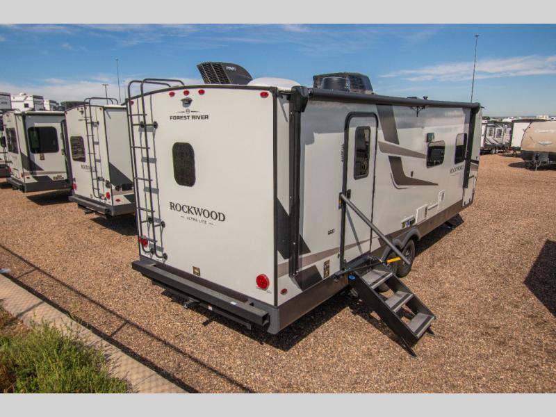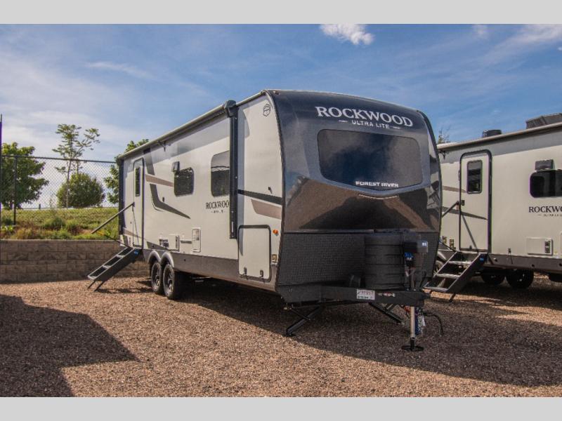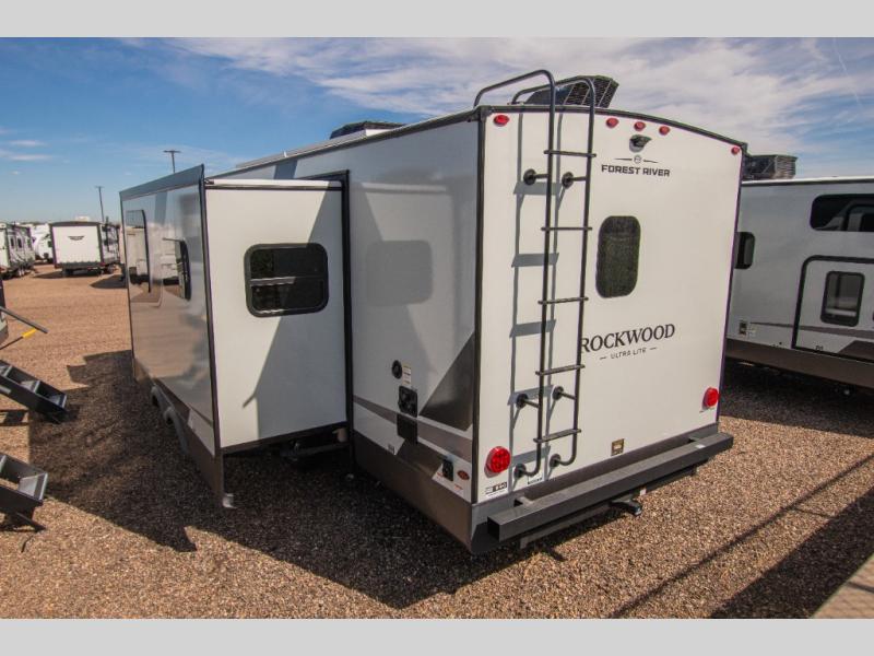 Each Rockwood Ultra Lite travel trailer by Forest River includes superior construction with a high gloss fiberglass cap, aluminum cage construction, and a power awning with LED lighting for a cozy and functional outdoor space. The torsion axle, power tongue jack will make towing smooth and hassle-free, along with the nitrogen filled, Goodyear Endurance tires and the tire pressure monitor system. Interior comforts include kitchen sink with high rise faucet, hidden hinge cabinet doors, and roller shades to name a few. Choose a Rockwood Ultra Lite travel trailer today!