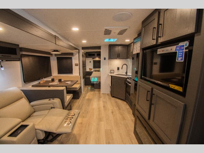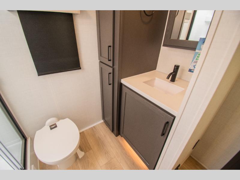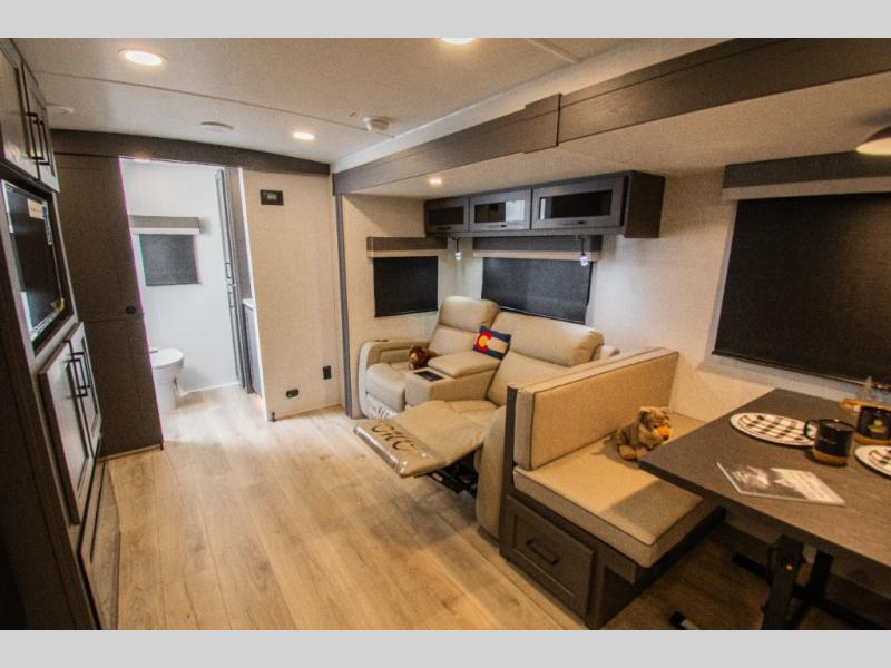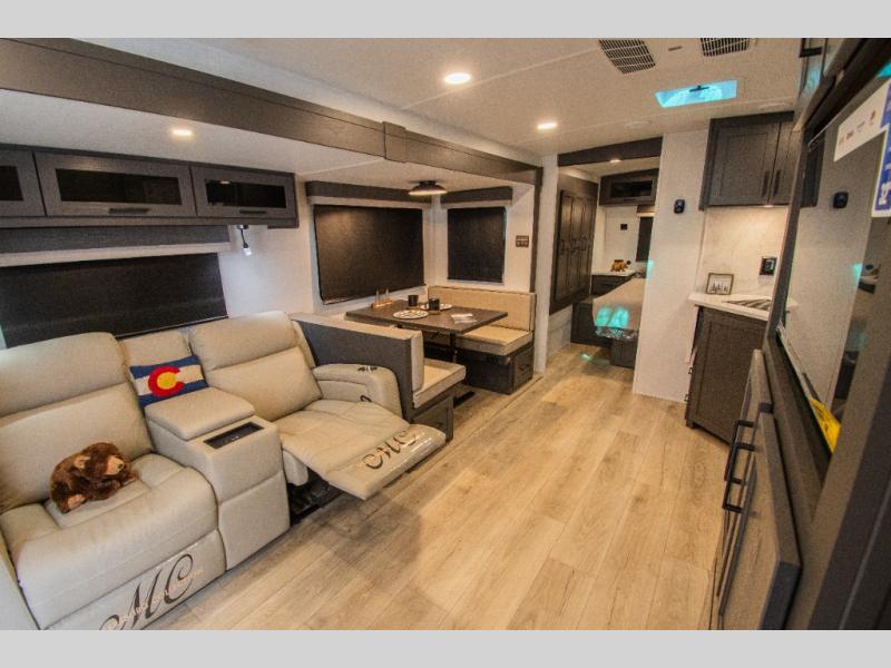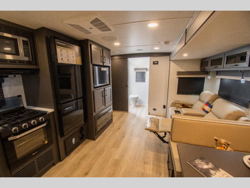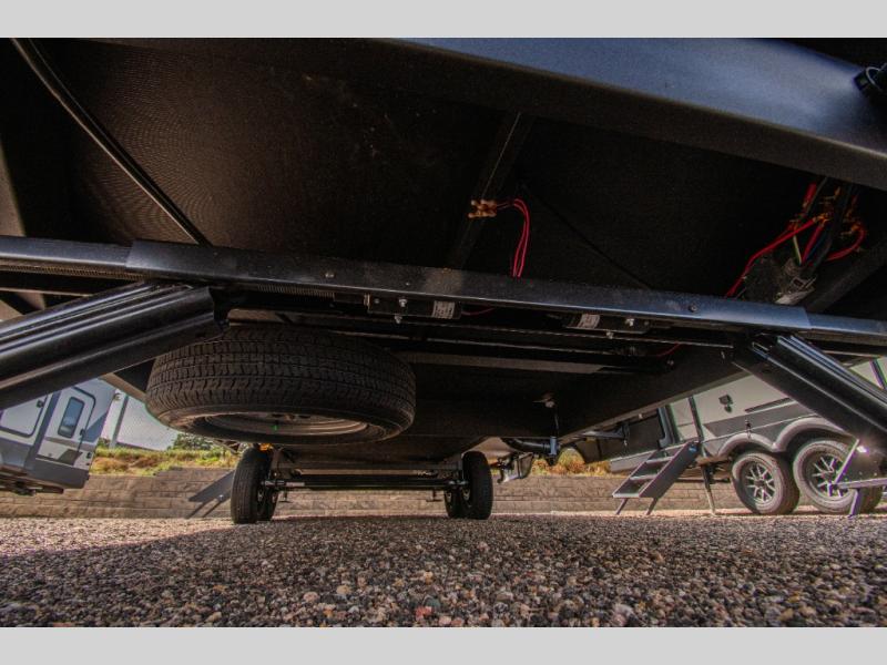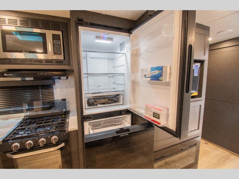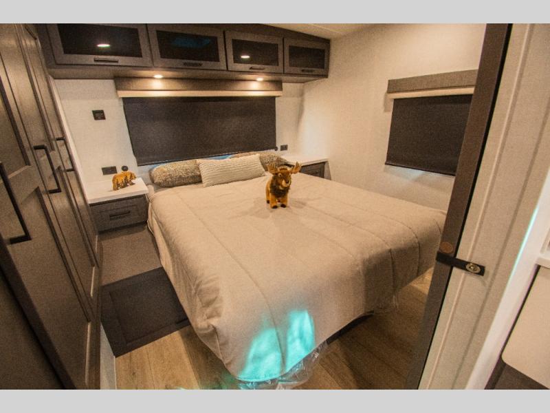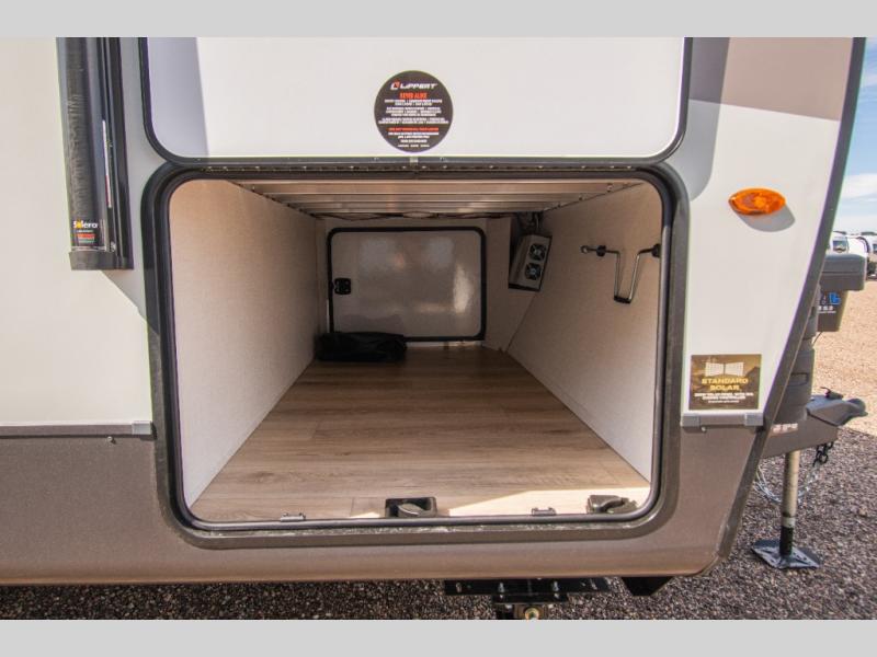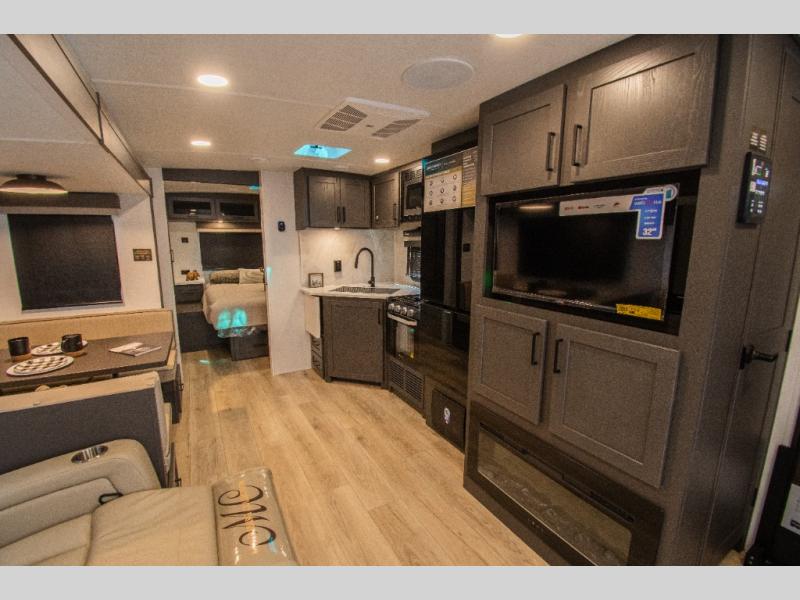 This trailer is the perfect couple's retreat with its private bedroom up front which includes a queen bed, a slide out wardrobe, and a TV option. The spacious rear full bathroom provides a shower and linen storage, and a space savings sliding door. The cook will have full amenities with ample counter space, a walk-in pantry for food storage, and a three burner range to cook meals on. If the weather is nice outside, you can turn on the outside speakers to enjoy music, and there is a 21' awning to relax under. Or you can stay inside to enjoy the fireplace and Smart TV! You will also appreciate the pass thru storage with an optional steel sliding tray to easily access gear!