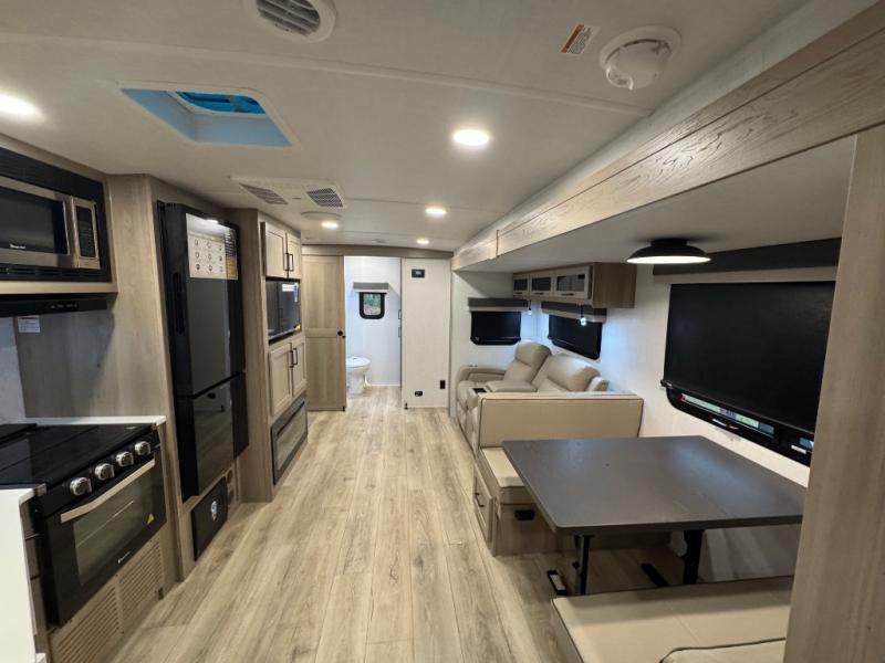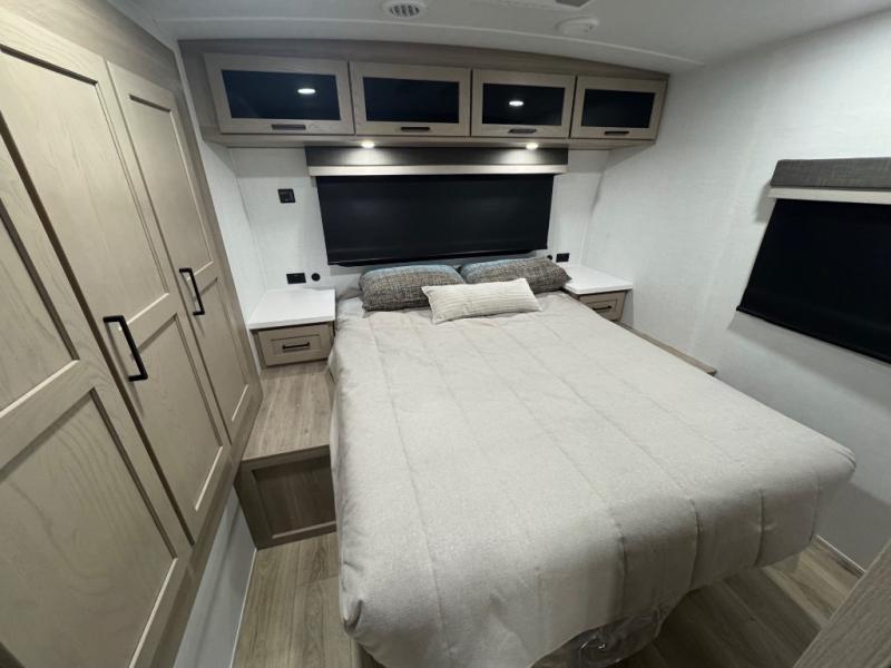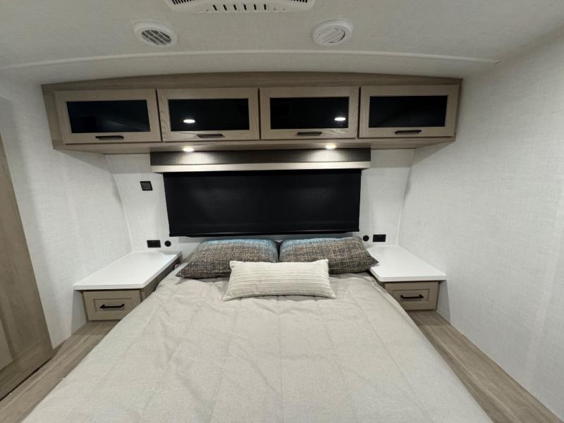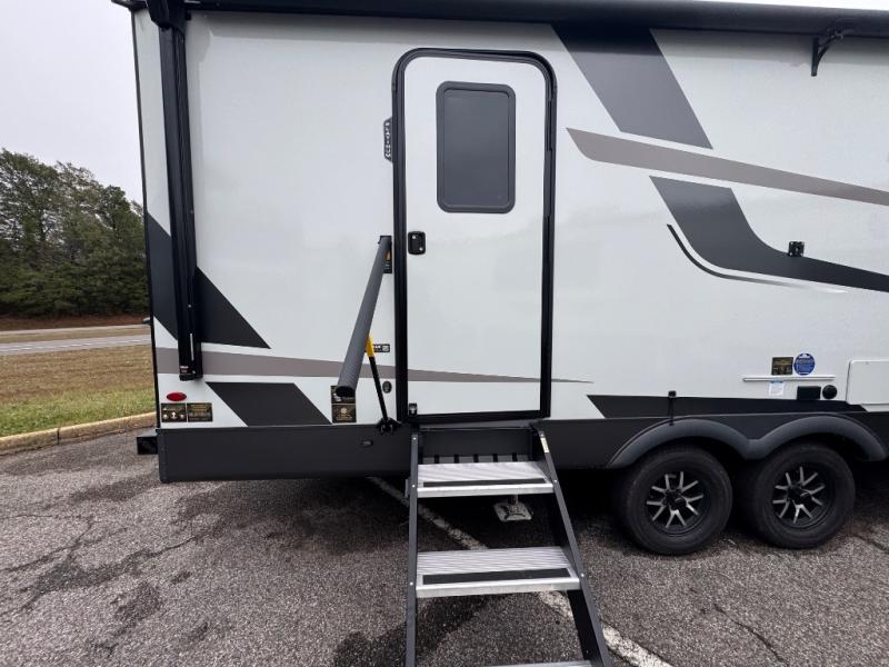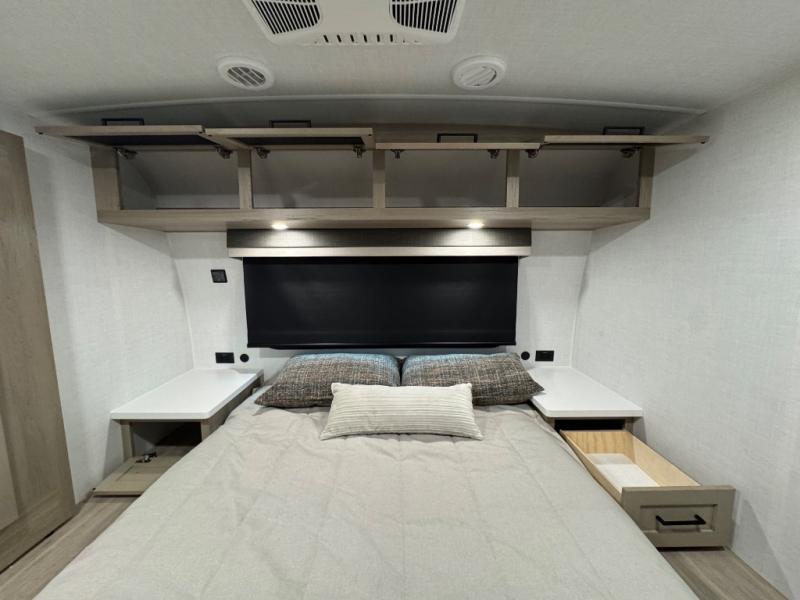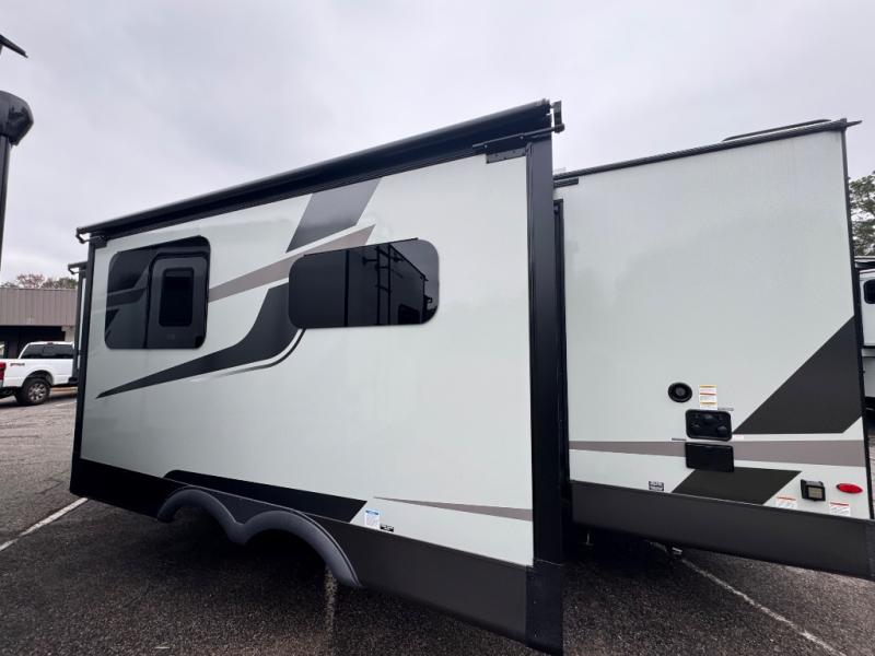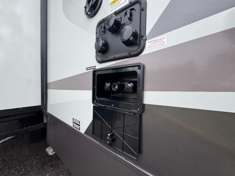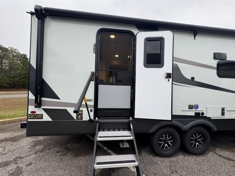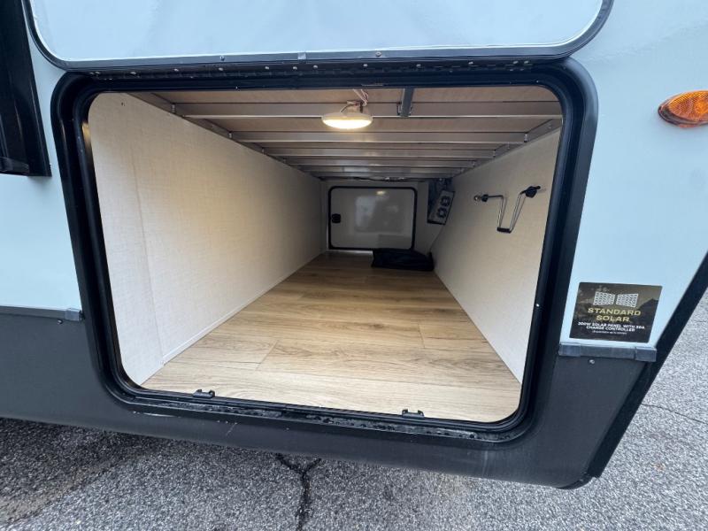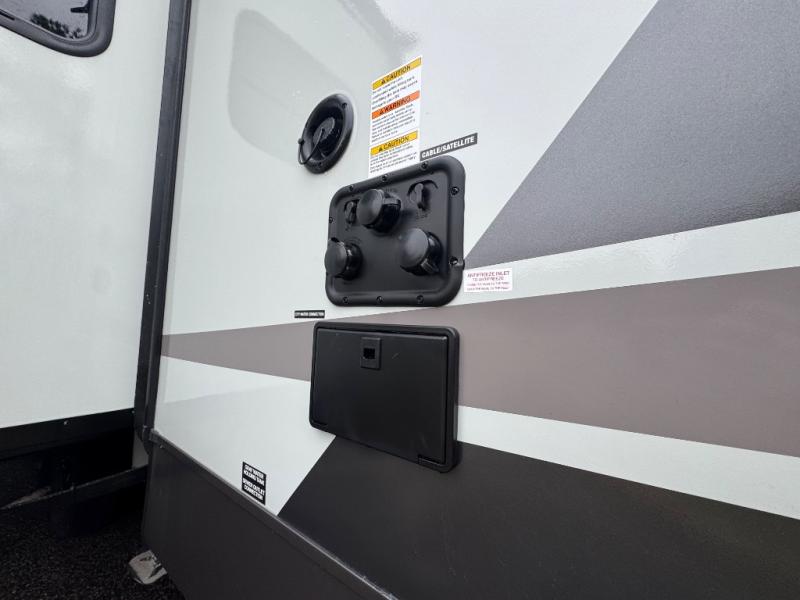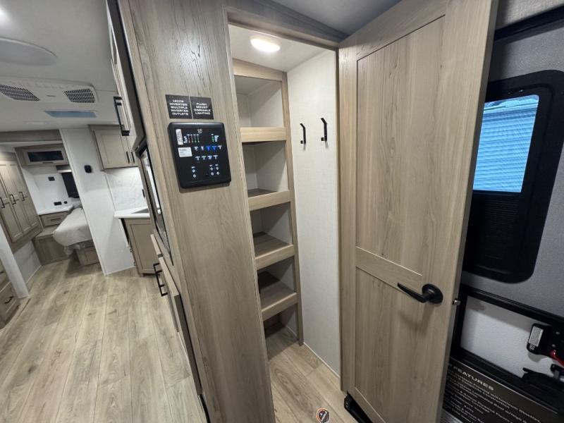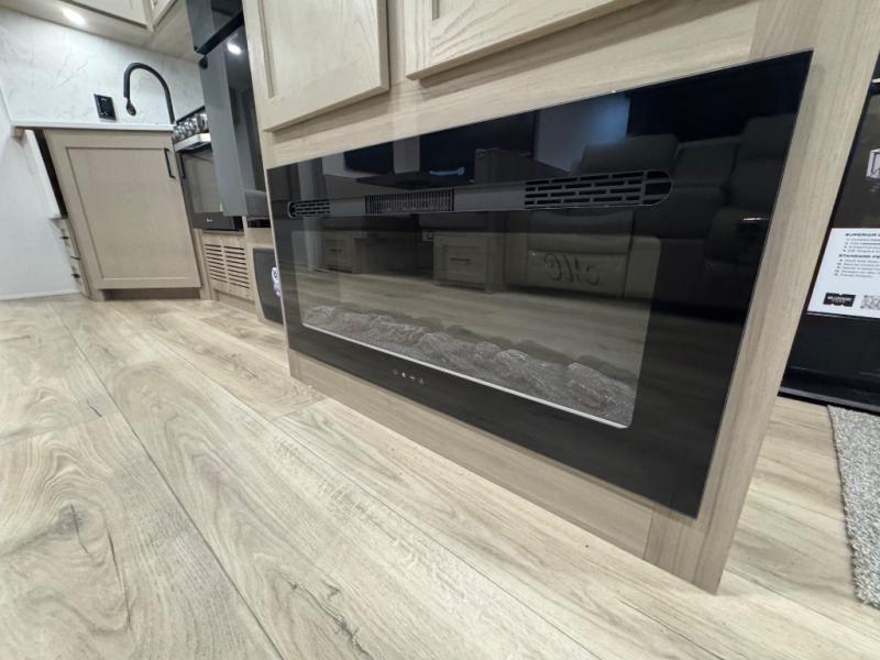 This trailer is the perfect couple's retreat with its private bedroom up front which includes a queen bed, a slide out wardrobe, and a TV option. The spacious rear full bathroom provides a shower and linen storage, and a space savings sliding door. The cook will have full amenities with ample counter space, a walk-in pantry for food storage, and a three burner range to cook meals on. If the weather is nice outside, you can turn on the outside speakers to enjoy music, and there is a 21' awning to relax under. Or you can stay inside to enjoy the fireplace and Smart TV! You will also appreciate the pass thru storage with an optional steel sliding tray to easily access gear!