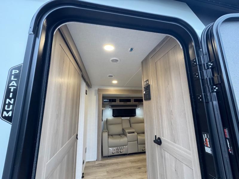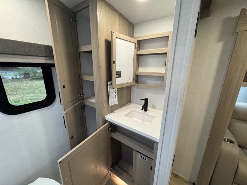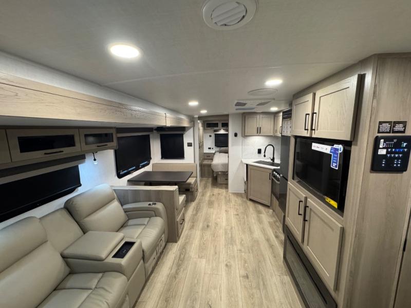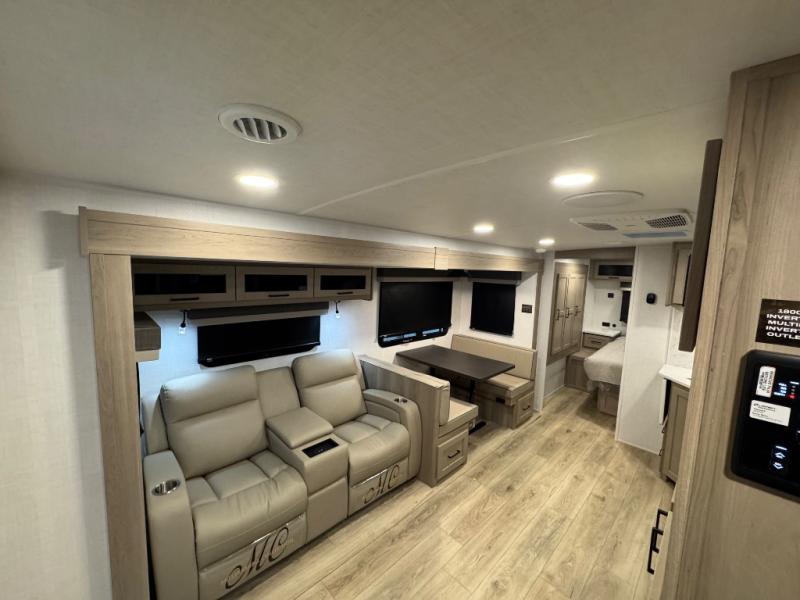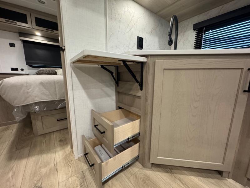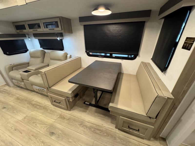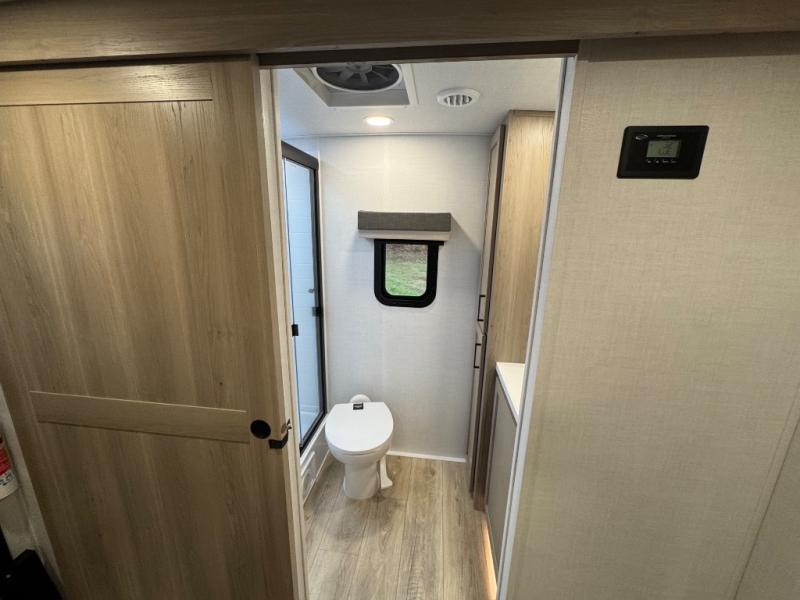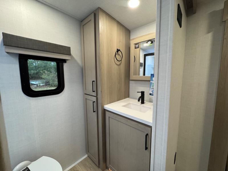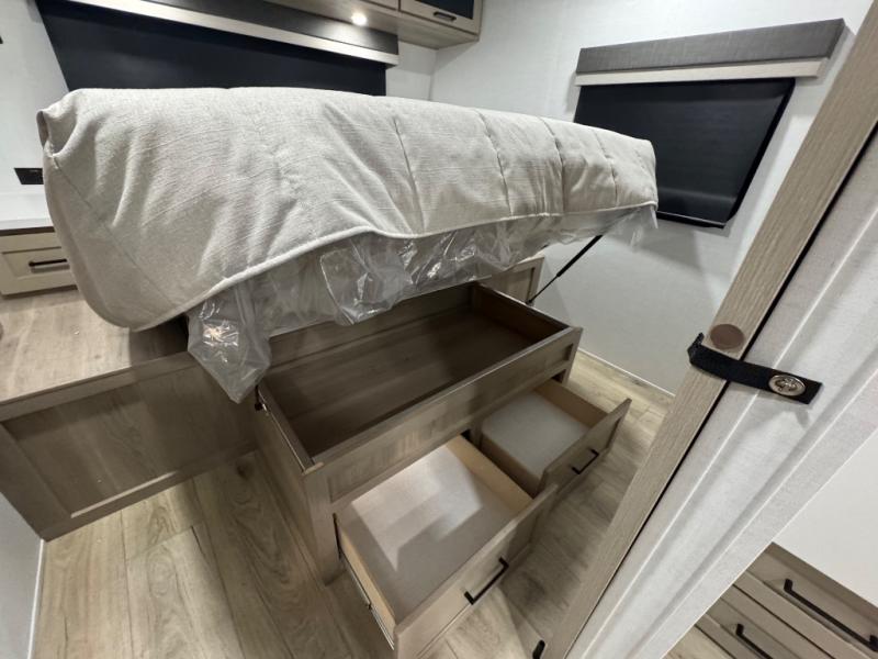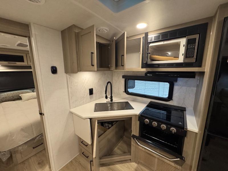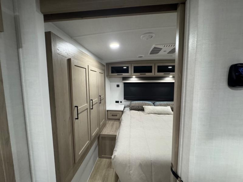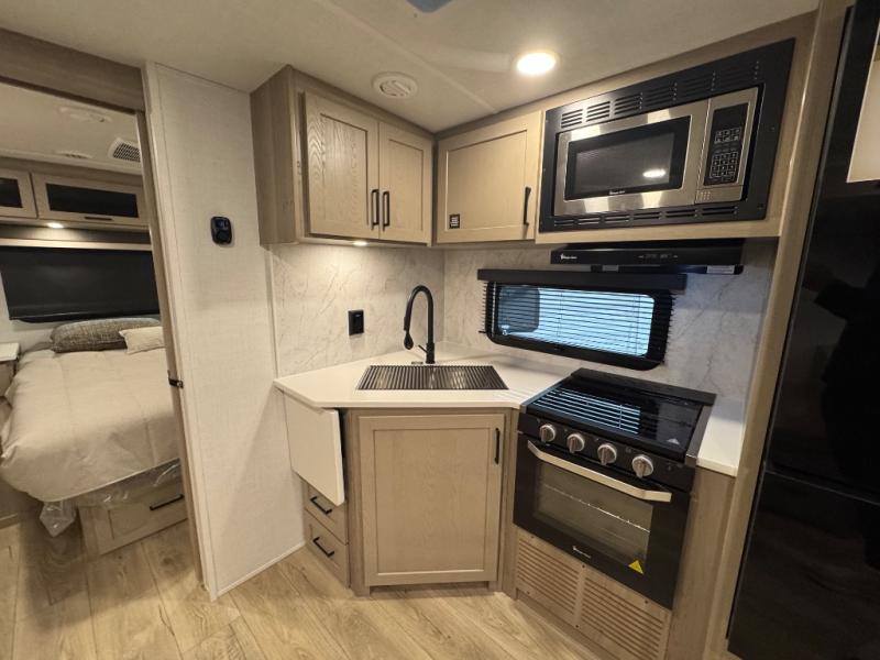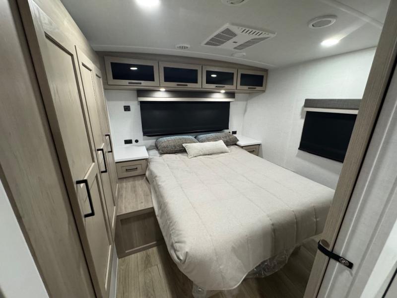 This trailer is the perfect couple's retreat with its private bedroom up front which includes a queen bed, a slide out wardrobe, and a TV option. The spacious rear full bathroom provides a shower and linen storage, and a space savings sliding door. The cook will have full amenities with ample counter space, a walk-in pantry for food storage, and a three burner range to cook meals on. If the weather is nice outside, you can turn on the outside speakers to enjoy music, and there is a 21' awning to relax under. Or you can stay inside to enjoy the fireplace and Smart TV! You will also appreciate the pass thru storage with an optional steel sliding tray to easily access gear!