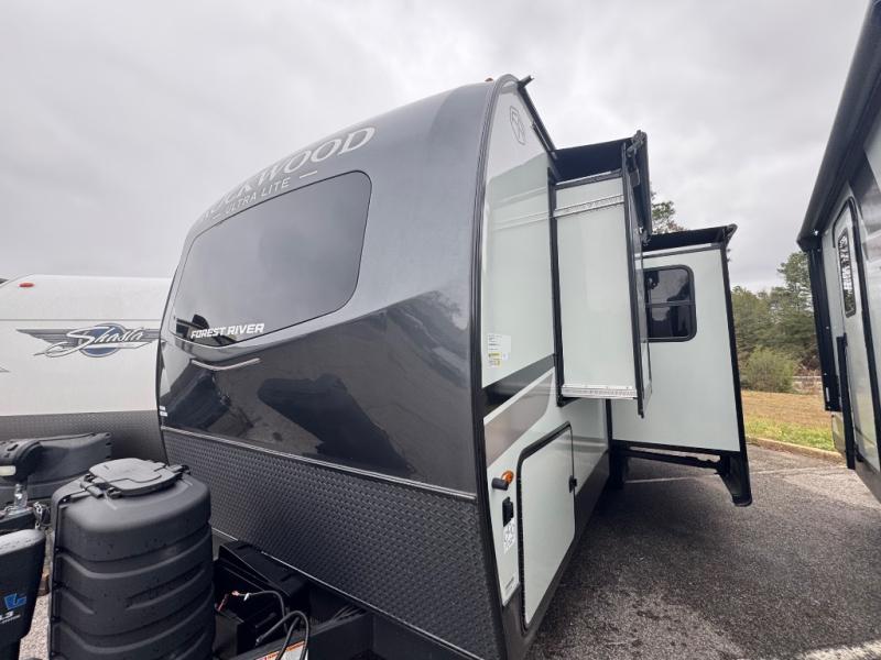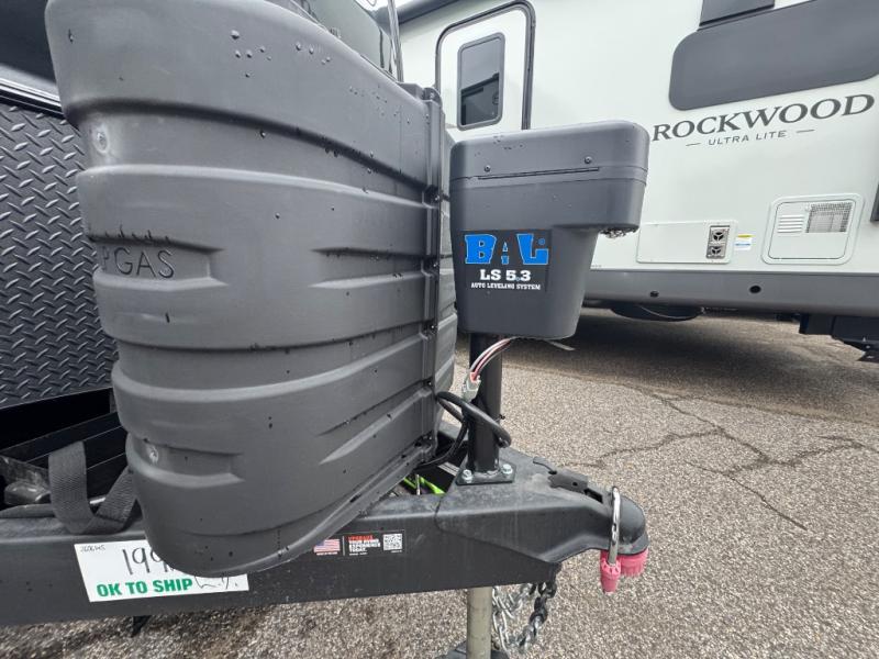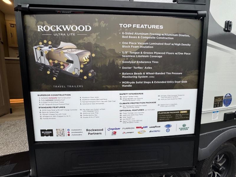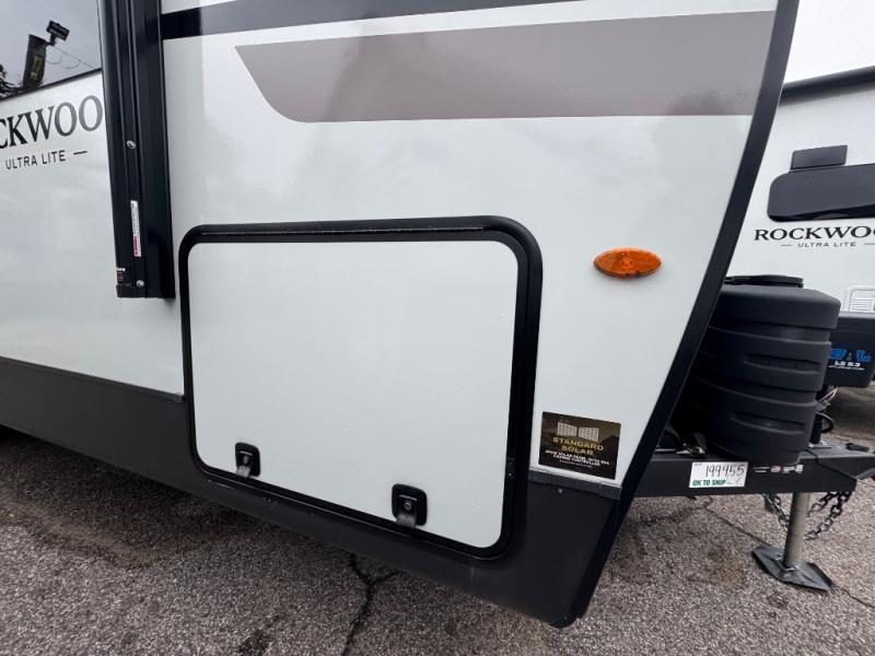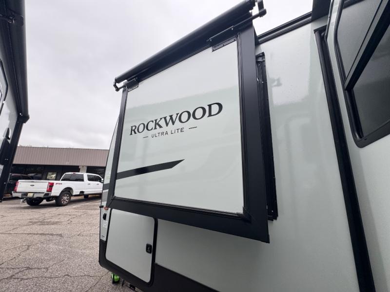 Each Rockwood Ultra Lite travel trailer by Forest River includes superior construction with a high gloss fiberglass cap, aluminum cage construction, and a power awning with LED lighting for a cozy and functional outdoor space. The torsion axle, power tongue jack will make towing smooth and hassle-free, along with the nitrogen filled, Goodyear Endurance tires and the tire pressure monitor system. Interior comforts include kitchen sink with high rise faucet, hidden hinge cabinet doors, and roller shades to name a few. Choose a Rockwood Ultra Lite travel trailer today!