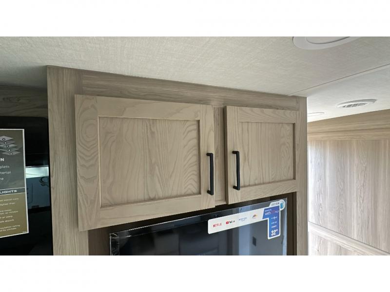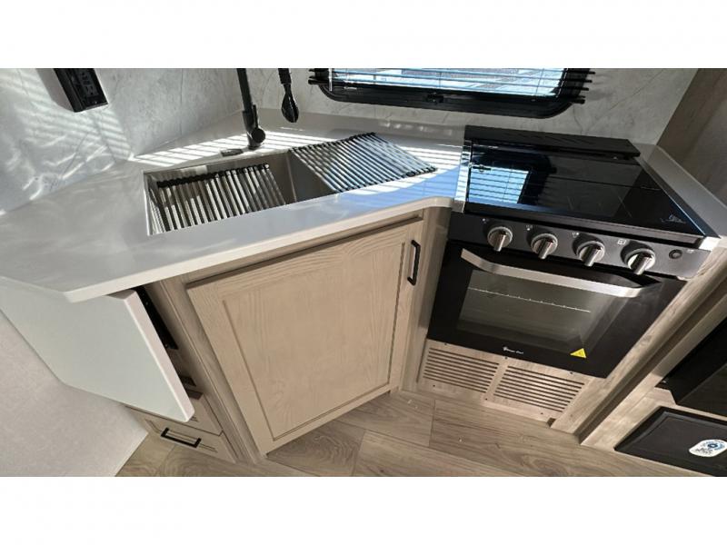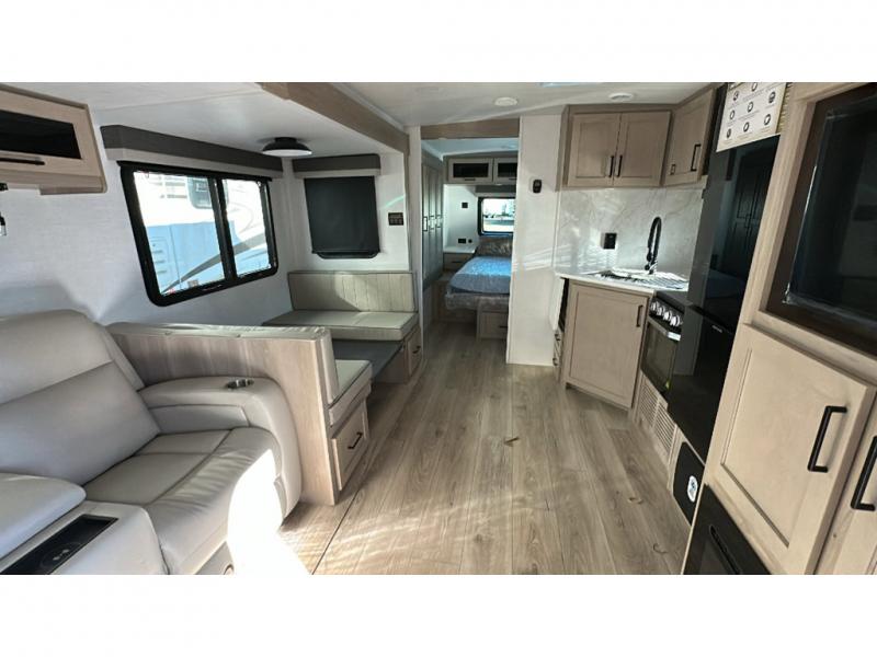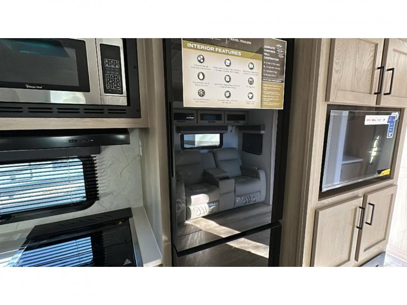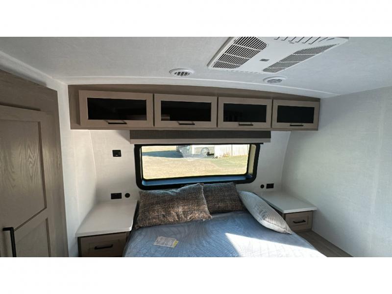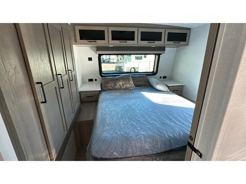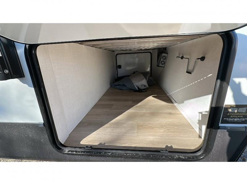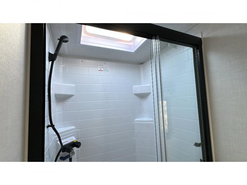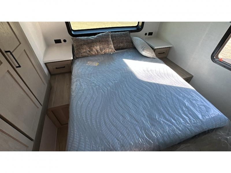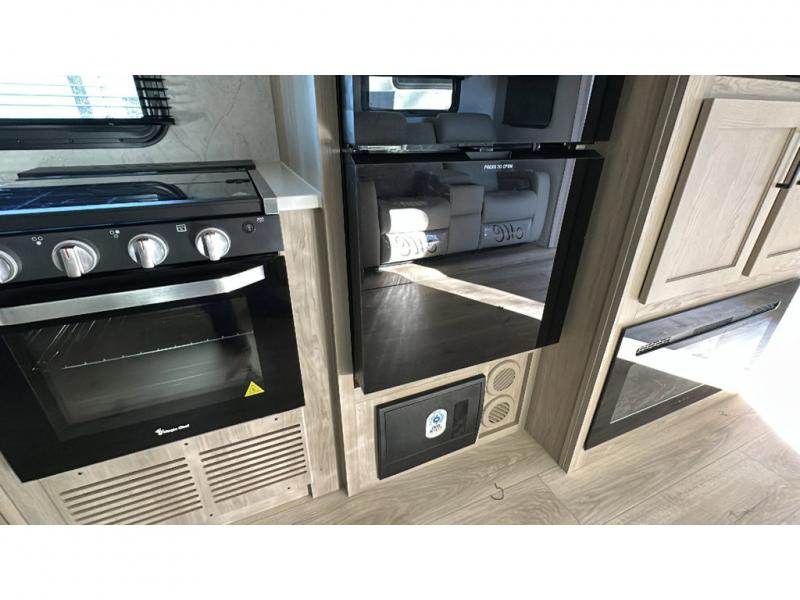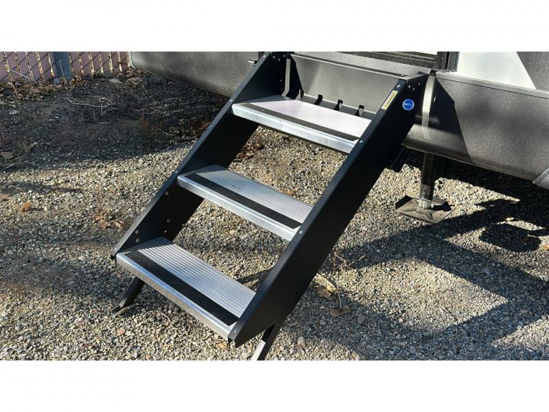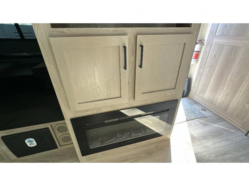 This trailer is the perfect couple's retreat with its private bedroom up front which includes a queen bed, a slide out wardrobe, and a TV option. The spacious rear full bathroom provides a shower and linen storage, and a space savings sliding door. The cook will have full amenities with ample counter space, a walk-in pantry for food storage, and a three burner range to cook meals on. If the weather is nice outside, you can turn on the outside speakers to enjoy music, and there is a 21' awning to relax under. Or you can stay inside to enjoy the fireplace and Smart TV! You will also appreciate the pass thru storage with an optional steel sliding tray to easily access gear!