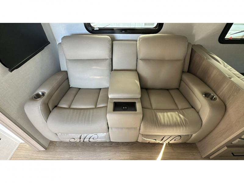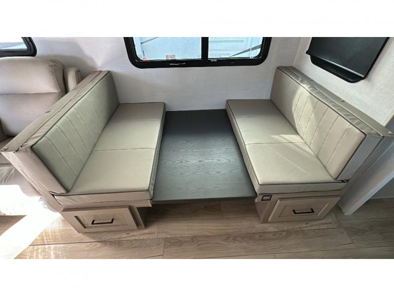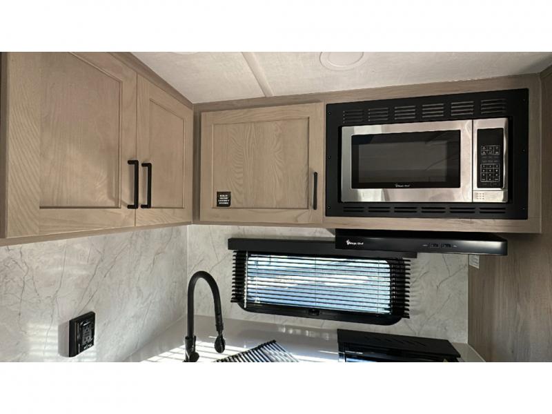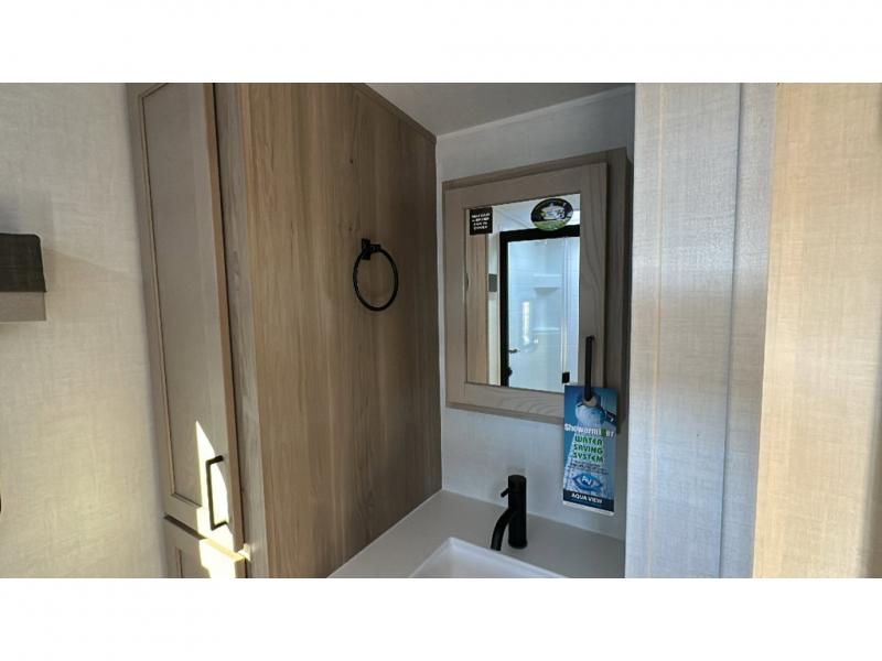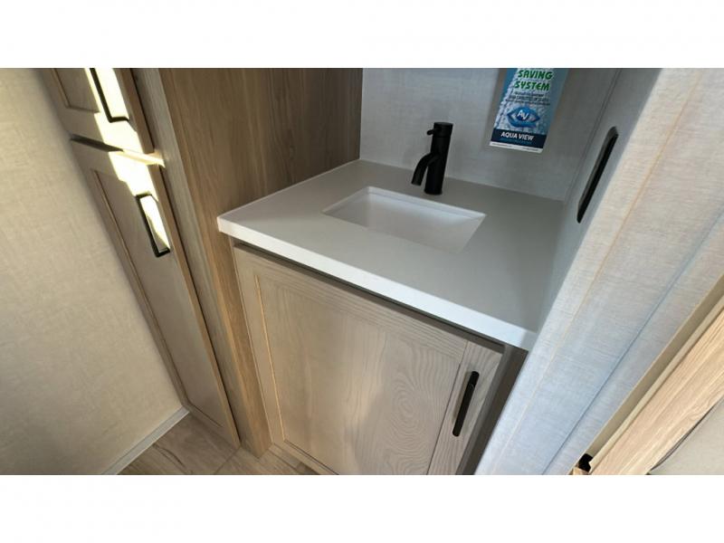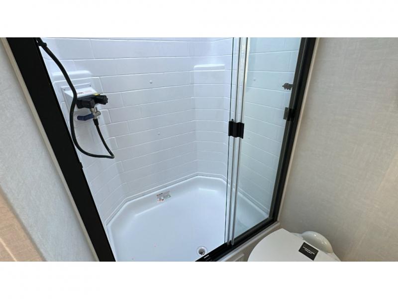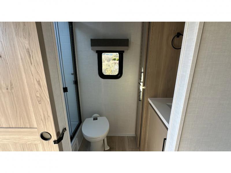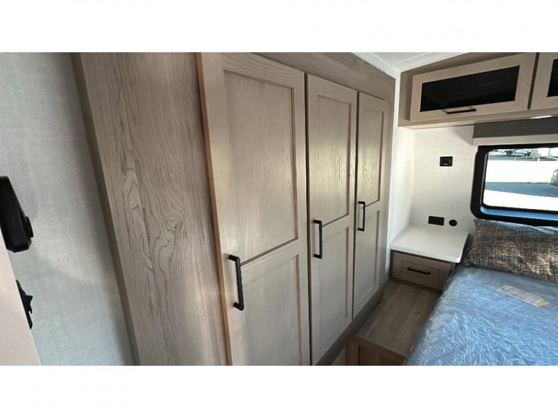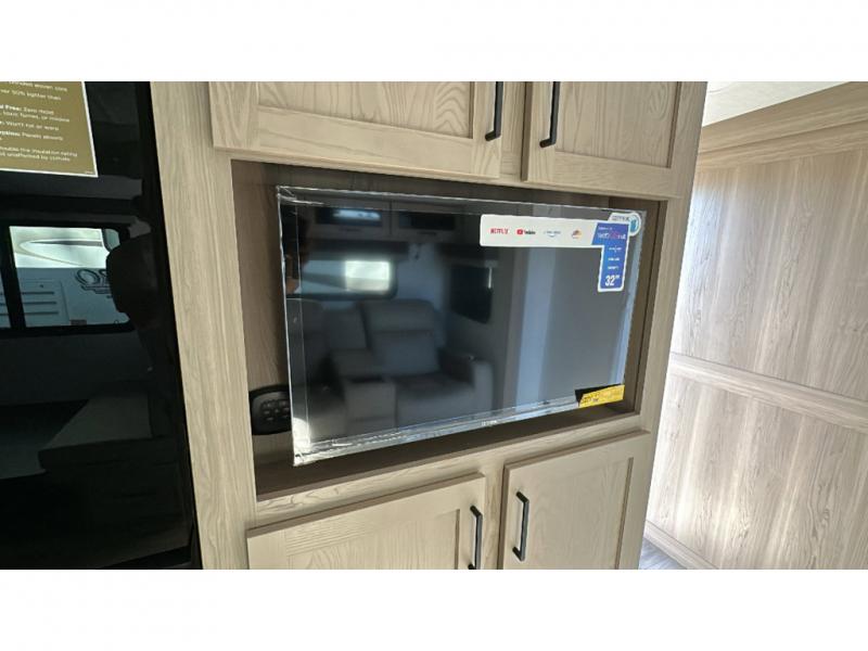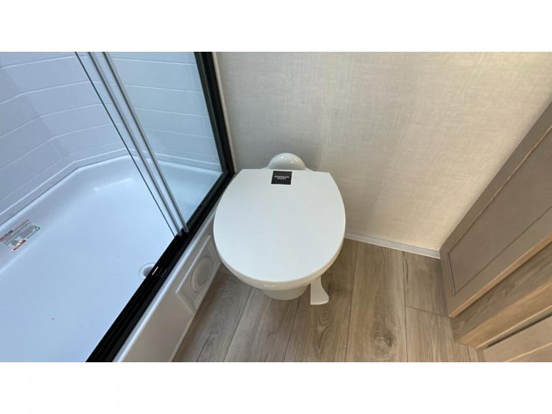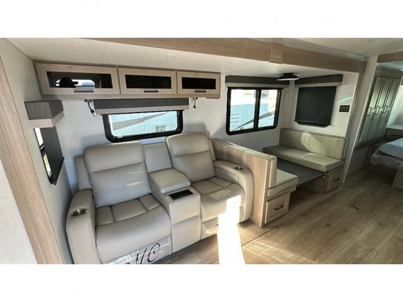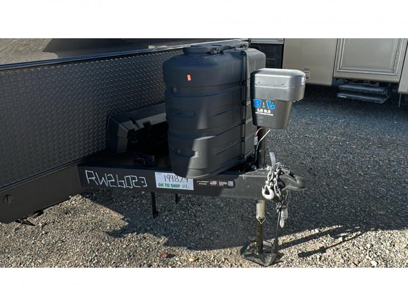 This trailer is the perfect couple's retreat with its private bedroom up front which includes a queen bed, a slide out wardrobe, and a TV option. The spacious rear full bathroom provides a shower and linen storage, and a space savings sliding door. The cook will have full amenities with ample counter space, a walk-in pantry for food storage, and a three burner range to cook meals on. If the weather is nice outside, you can turn on the outside speakers to enjoy music, and there is a 21' awning to relax under. Or you can stay inside to enjoy the fireplace and Smart TV! You will also appreciate the pass thru storage with an optional steel sliding tray to easily access gear!
