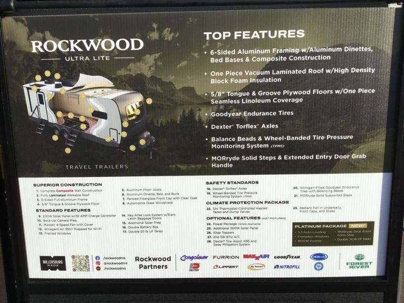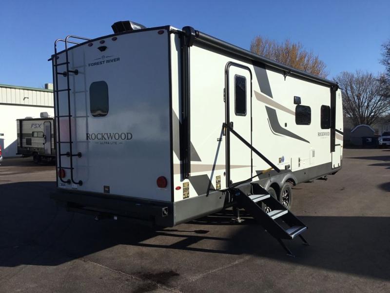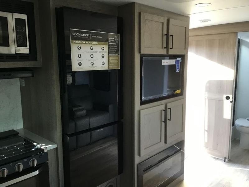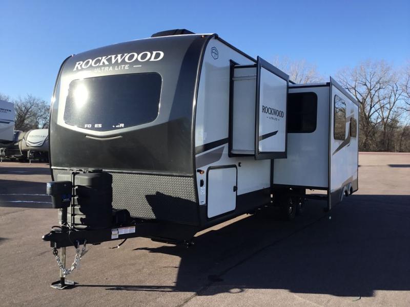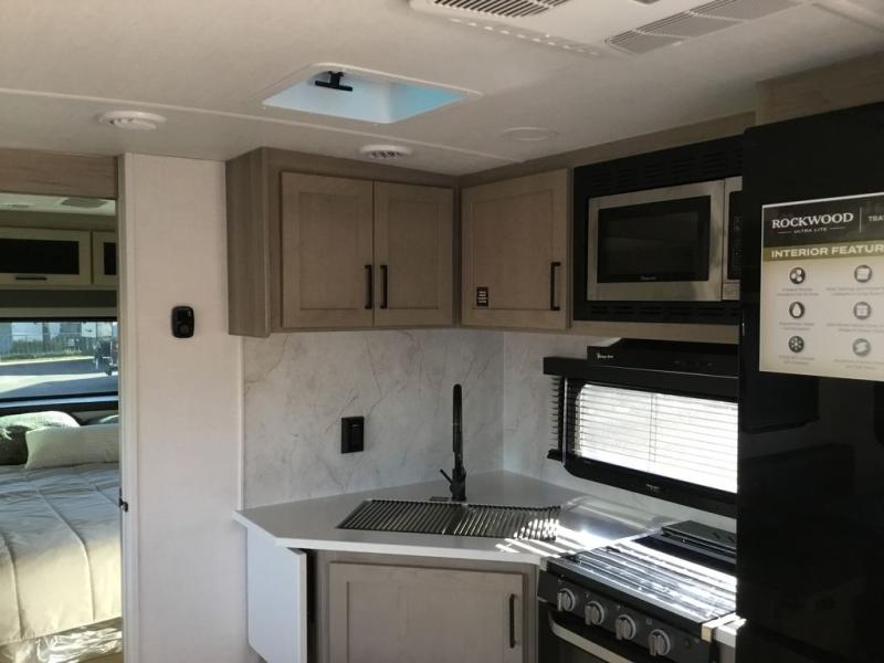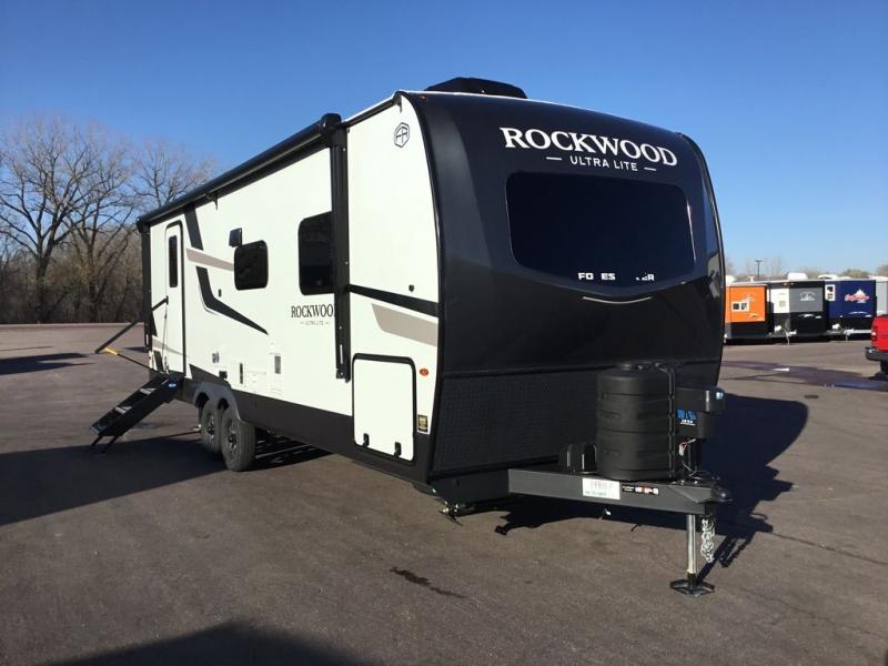 Each Rockwood Ultra Lite travel trailer by Forest River includes superior construction with a high gloss fiberglass cap, aluminum cage construction, and a power awning with LED lighting for a cozy and functional outdoor space. The torsion axle, power tongue jack will make towing smooth and hassle-free, along with the nitrogen filled, Goodyear Endurance tires and the tire pressure monitor system. Interior comforts include kitchen sink with high rise faucet, hidden hinge cabinet doors, and roller shades to name a few. Choose a Rockwood Ultra Lite travel trailer today!