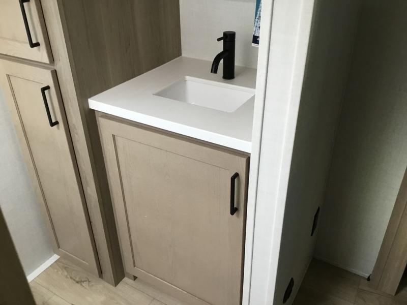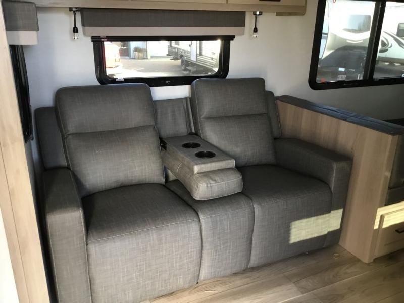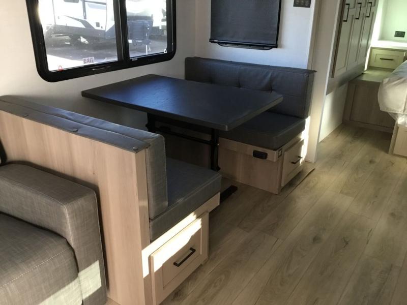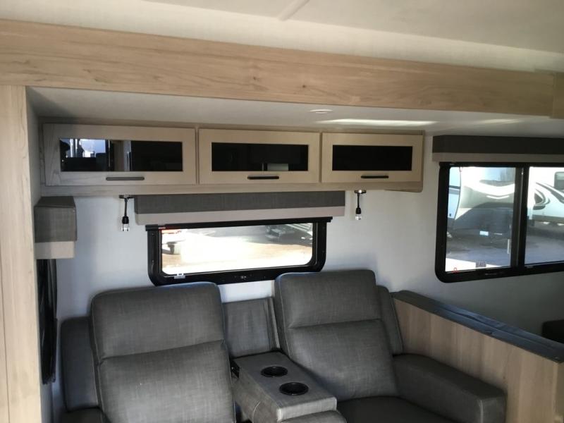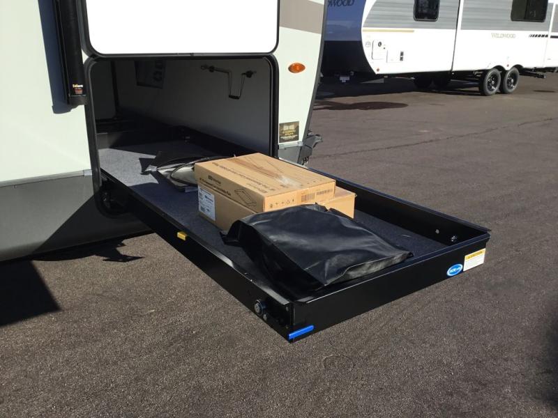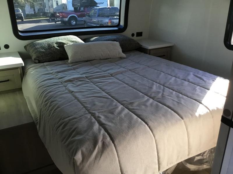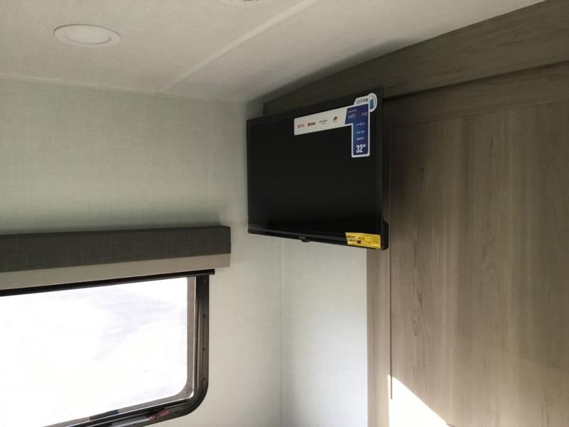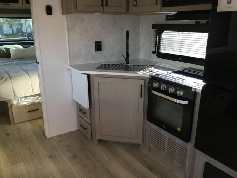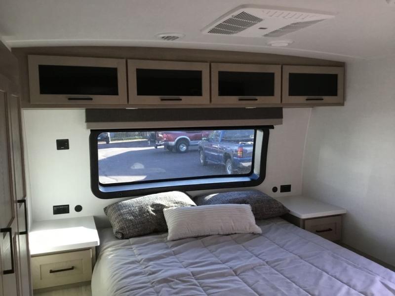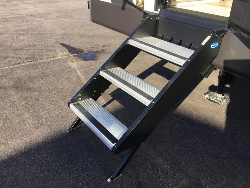 This trailer is the perfect couple's retreat with its private bedroom up front which includes a queen bed, a slide out wardrobe, and a TV option. The spacious rear full bathroom provides a shower and linen storage, and a space savings sliding door. The cook will have full amenities with ample counter space, a walk-in pantry for food storage, and a three burner range to cook meals on. If the weather is nice outside, you can turn on the outside speakers to enjoy music, and there is a 21' awning to relax under. Or you can stay inside to enjoy the fireplace and Smart TV! You will also appreciate the pass thru storage with an optional steel sliding tray to easily access gear!