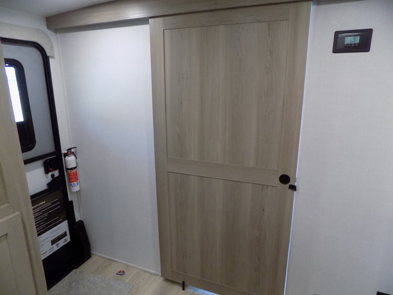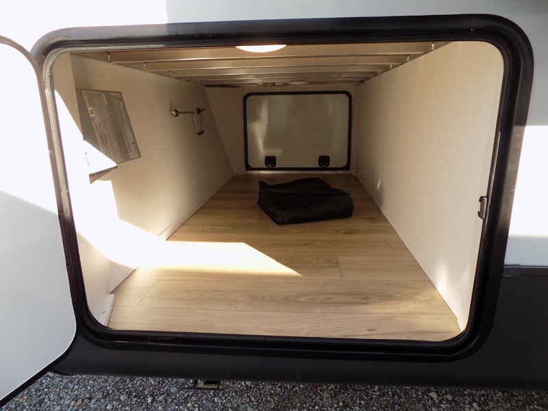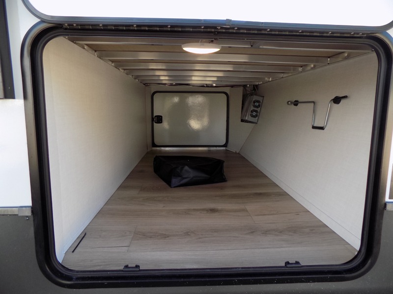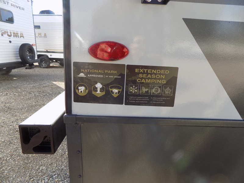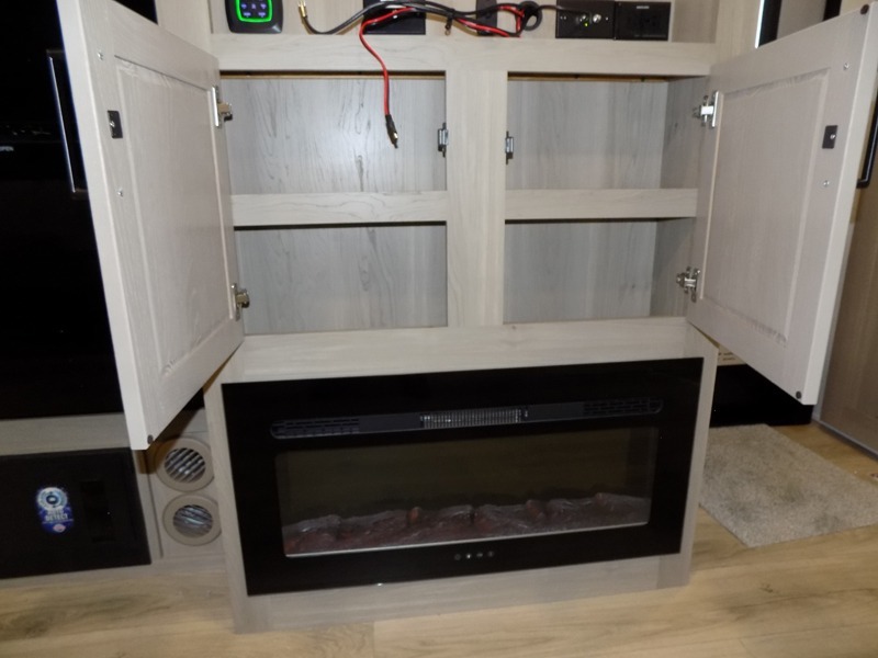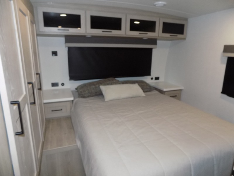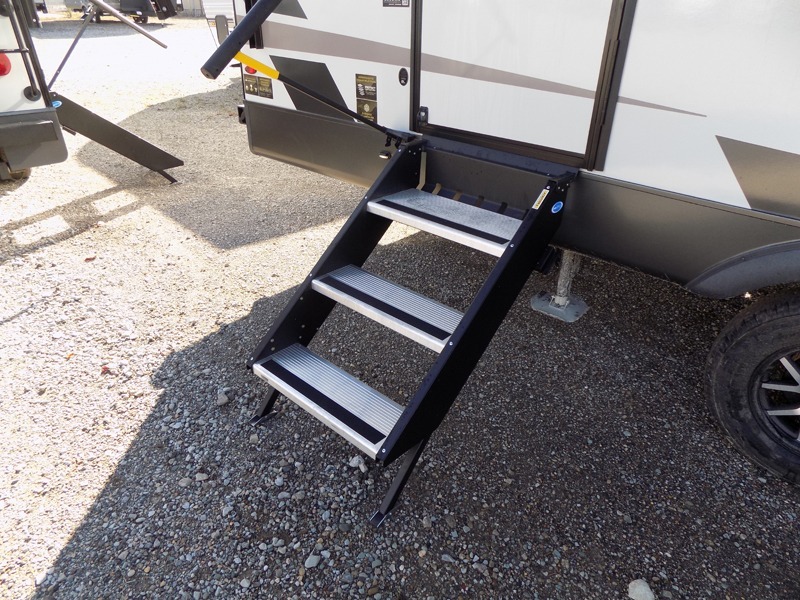 This trailer is the perfect couple's retreat with its private bedroom up front which includes a queen bed, a slide out wardrobe, and a TV option. The spacious rear full bathroom provides a shower and linen storage, and a space savings sliding door. The cook will have full amenities with ample counter space, a walk-in pantry for food storage, and a three burner range to cook meals on. If the weather is nice outside, you can turn on the outside speakers to enjoy music, and there is a 21' awning to relax under. Or you can stay inside to enjoy the fireplace and Smart TV! You will also appreciate the pass thru storage with an optional steel sliding tray to easily access gear!