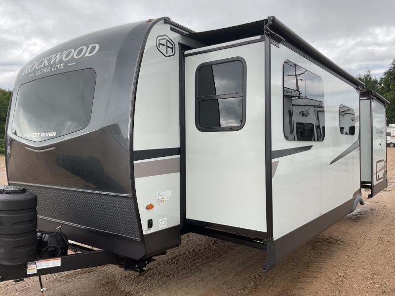 Each Rockwood Ultra Lite travel trailer by Forest River includes superior construction with a high gloss front cap, laminated white fiberglass sidewalls, and tinted frameless windows for a sleek look. The torsion axle, Rubber-Ryde suspension will make towing smooth and hassle-free, along with the nitrogen filled, Goodyear Endurance tires and the tire pressure monitor system. Interior comforts include designer kitchen backsplash, solid wood cabinet doors with hidden hinges, and night roller shades to name a few. Choose a Rockwood Ultra Lite travel trailer today!