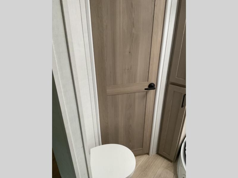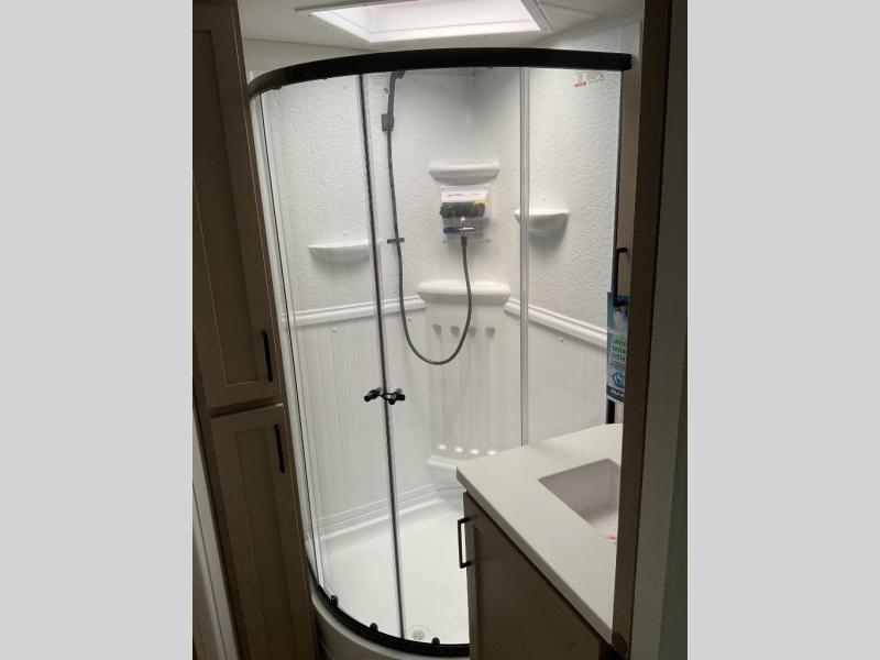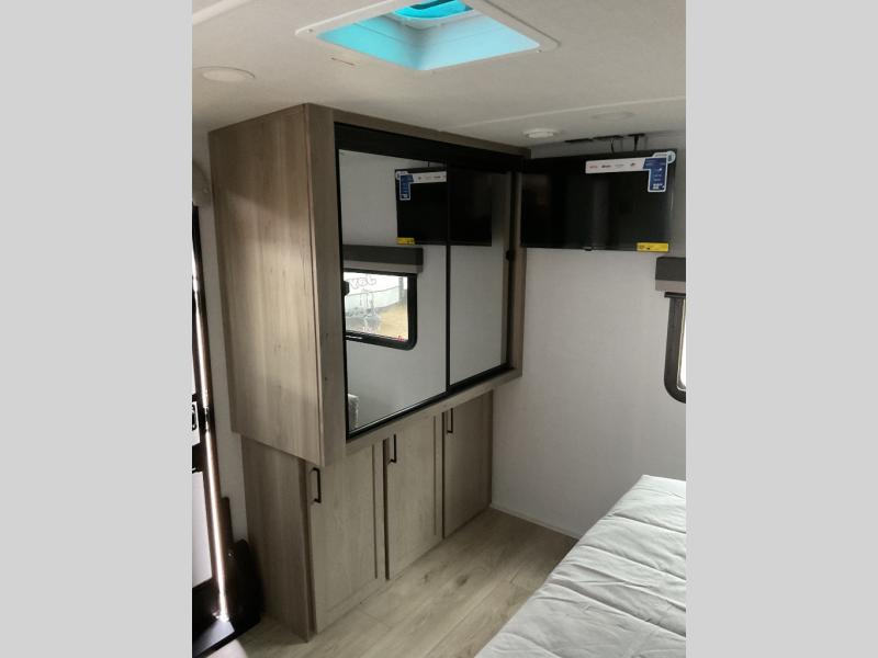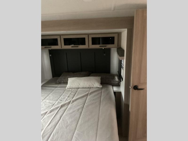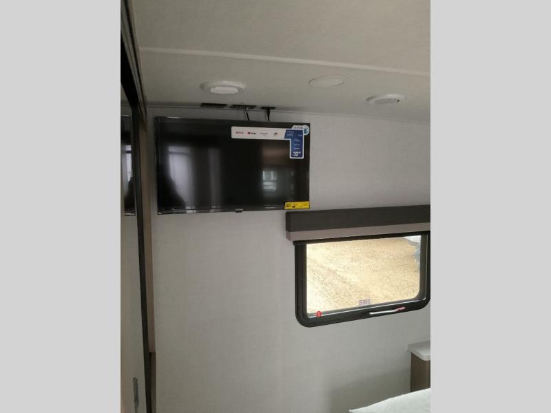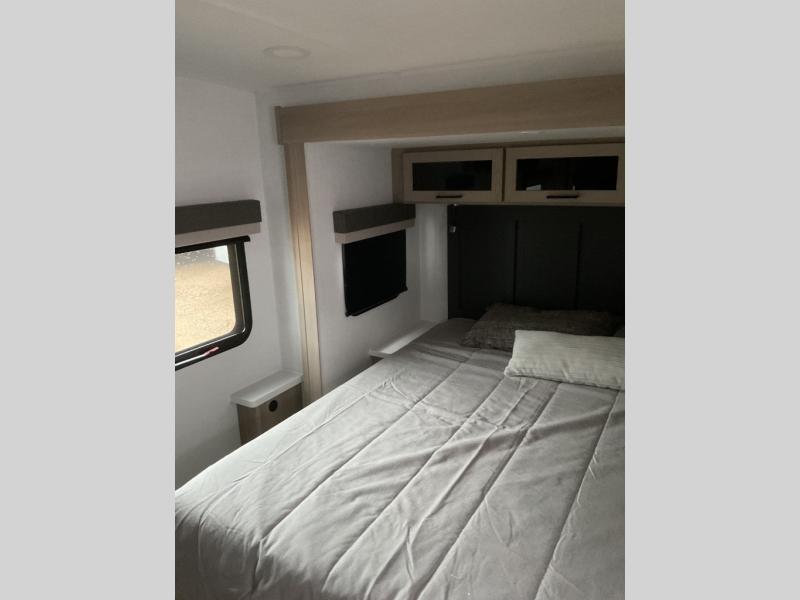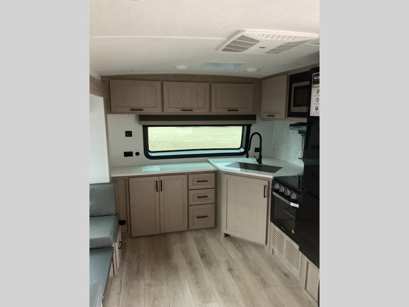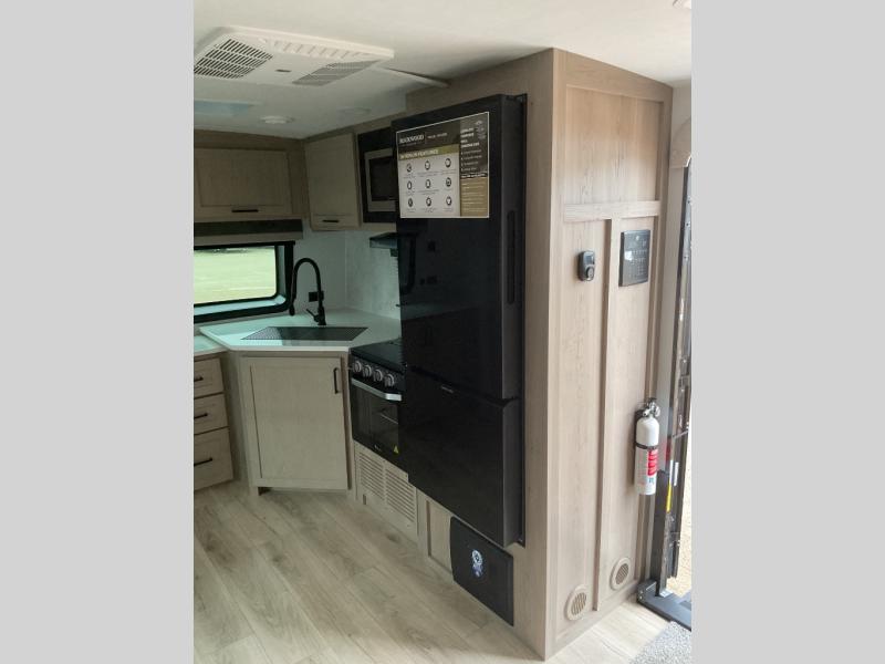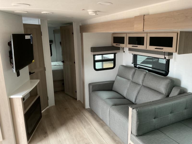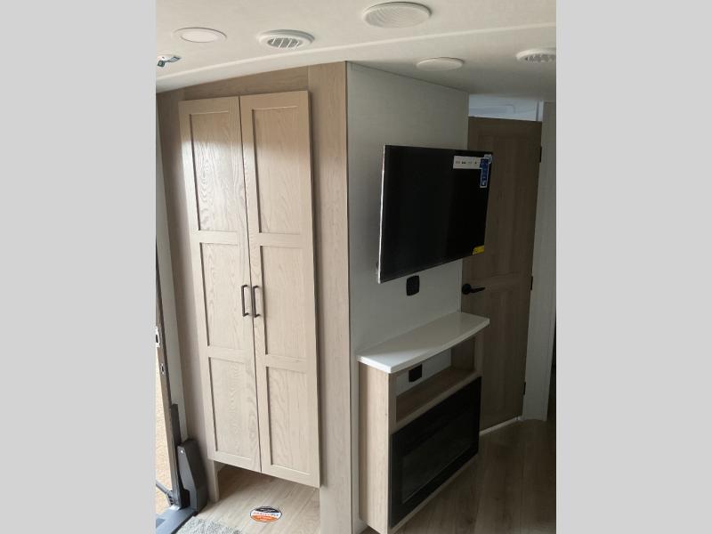 When you are outside this trailer you can enjoy the protection from the 21' power awning, and whip up a meal using the outside griddle. You will find exterior storage for your extra gear, and a ladder at the rear. You get to choose which entrance to step up into, be it the spacious rear bedroom with a queen bed slide and a wardrobe, or the main entry into the kitchen and living area. The furniture slide includes a booth dinette to eat your meals at, and theater seating to watch the Smart TV with a fireplace below. And the cook will love the front kitchen with extra counter space, a three burner range, plus a 12V refrigerator and pantry for food storage!